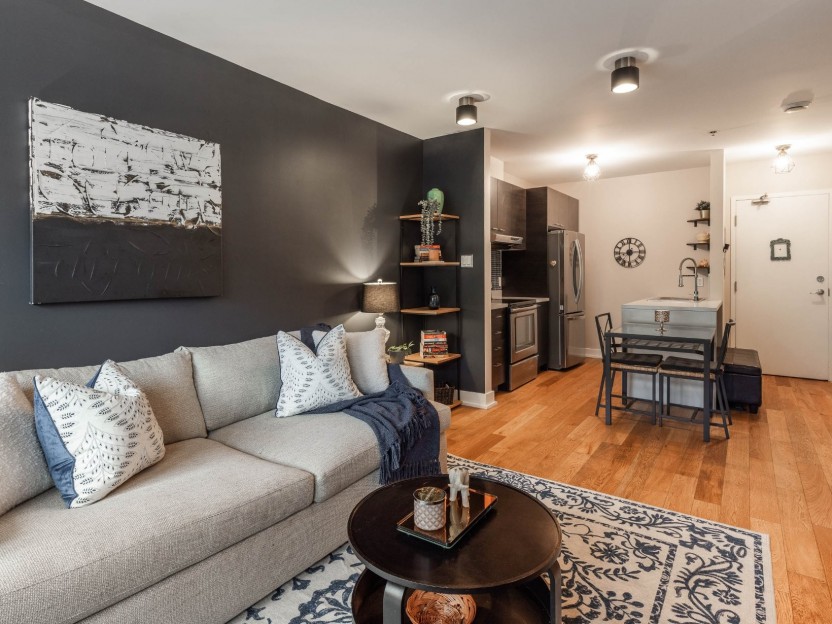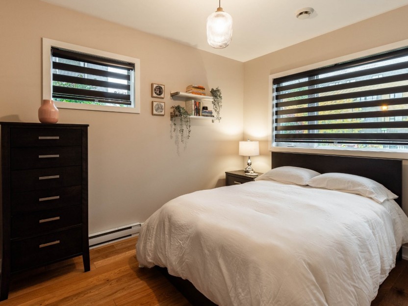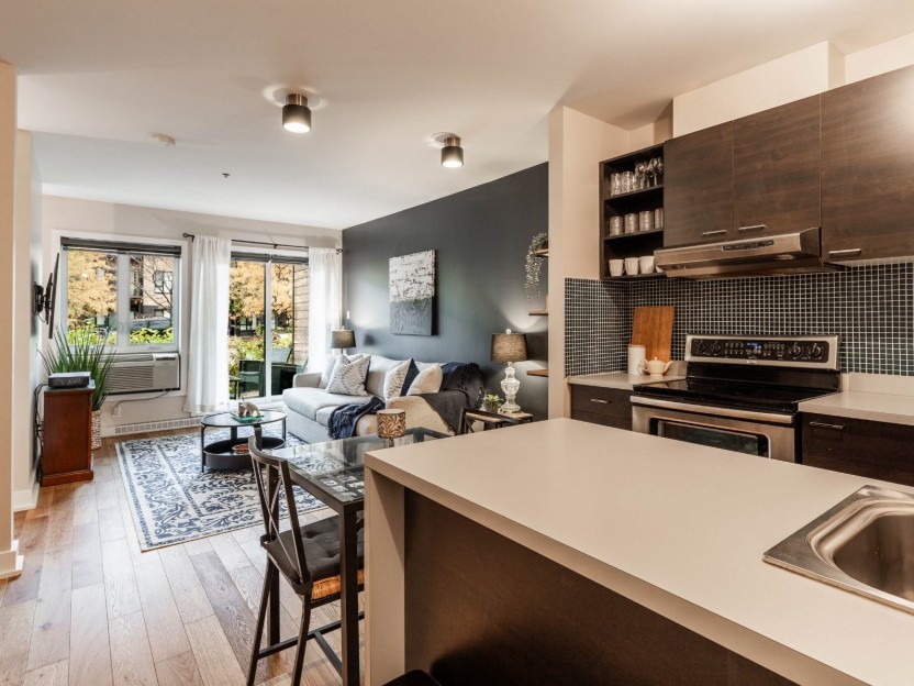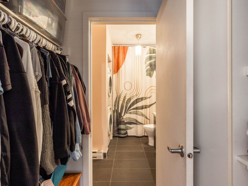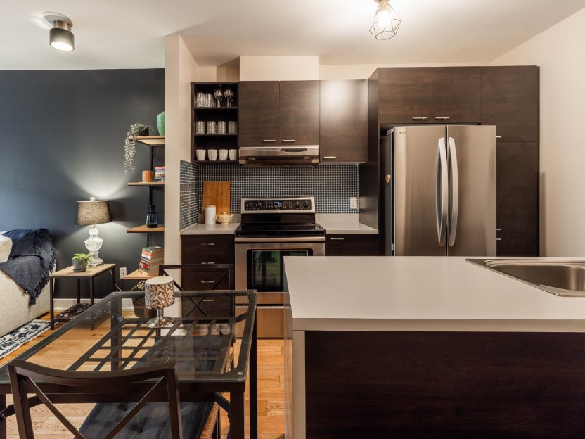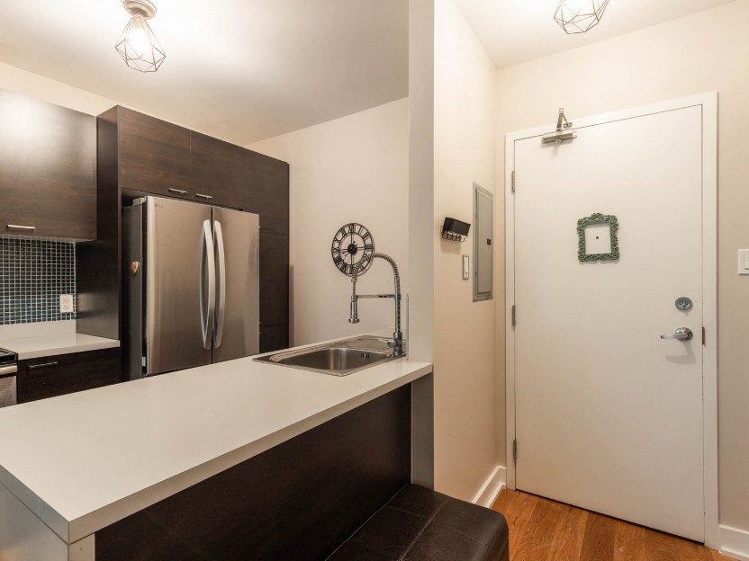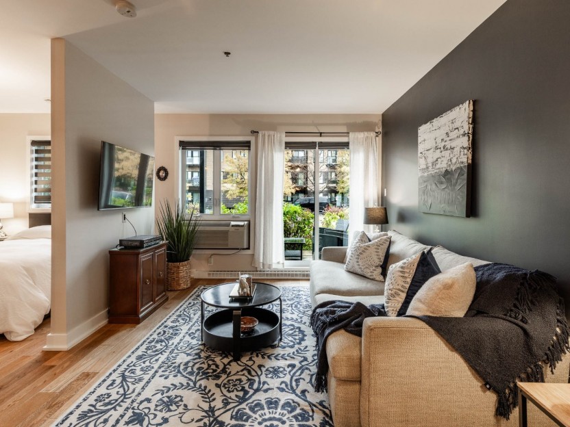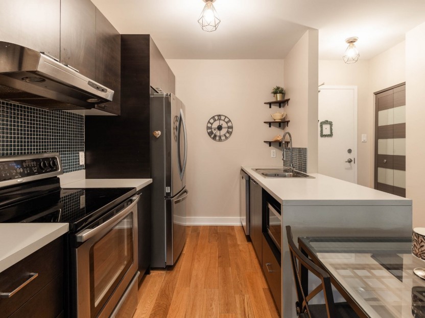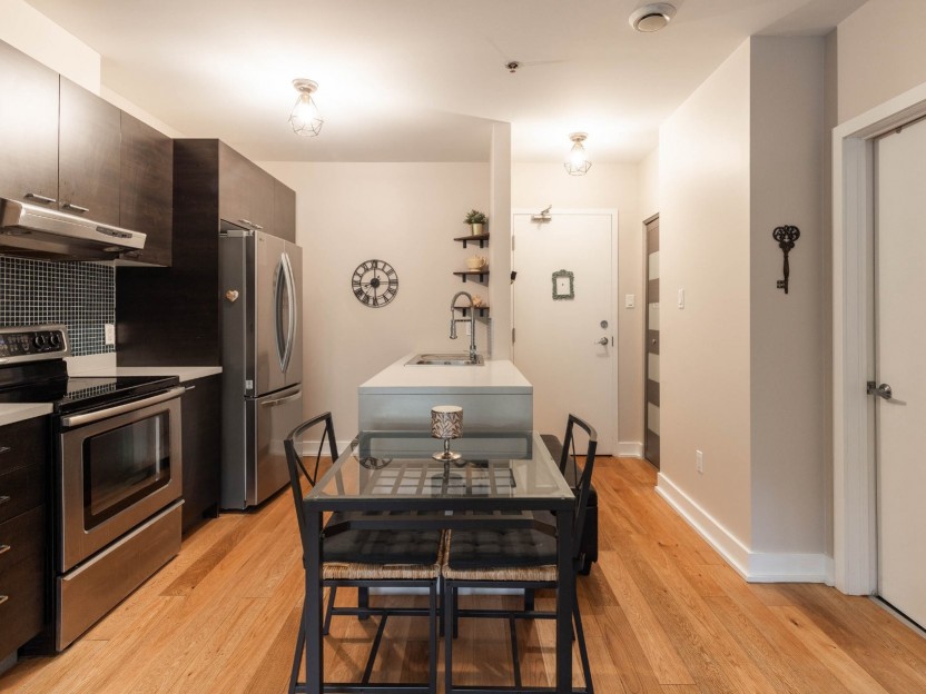 This condo offers a warm and contemporary ambiance thanks to its choice of materials, decorative accents, and large windows that let in beautiful natural light.