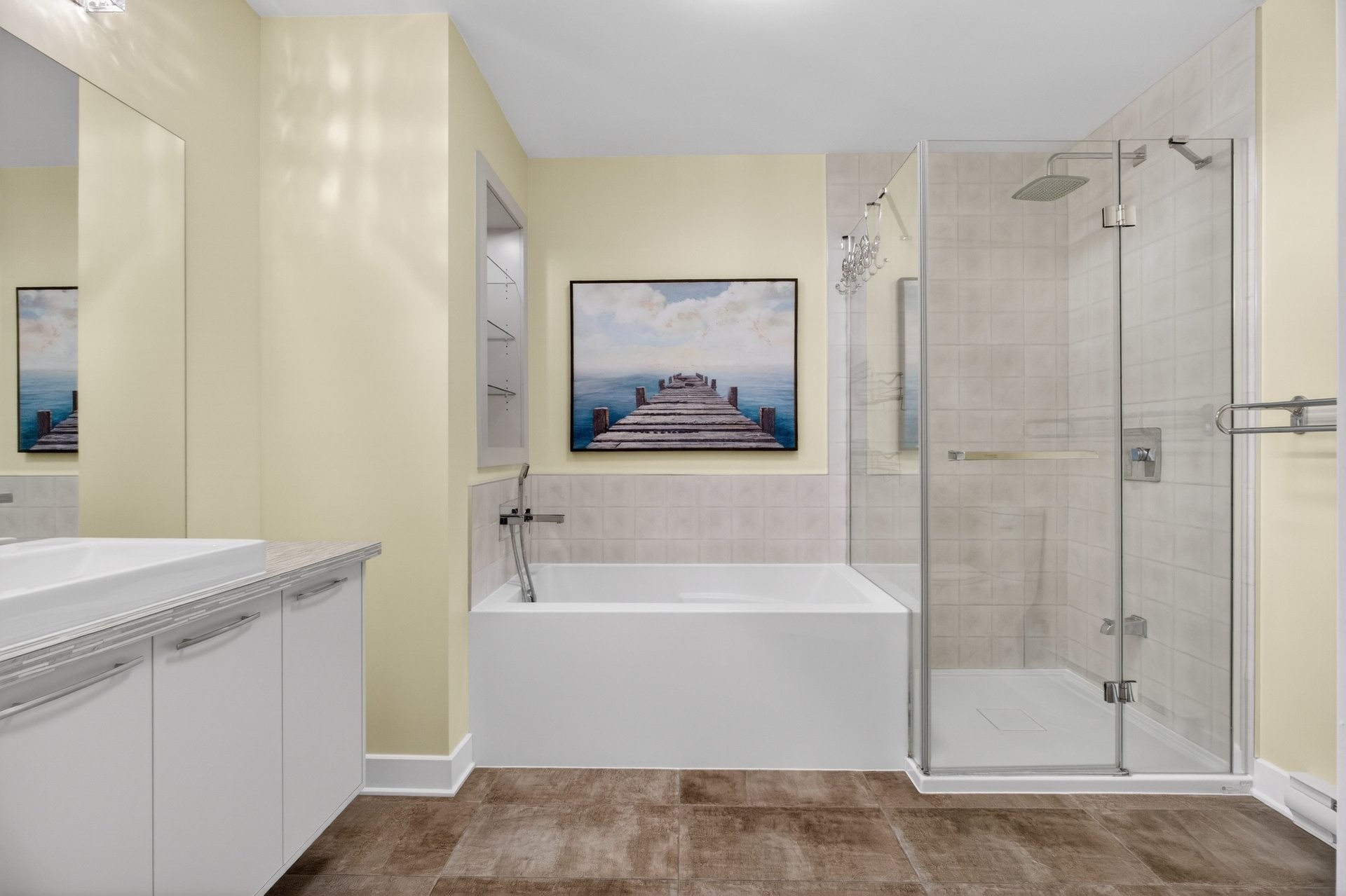 The contemporary kitchen includes an extended island with extra cabinets, providing ample storage. A powder room on the main floor features a ceramic backsplash. The spacious master bedroom offers a full-length closet and the bathroom includes a ceramic rainfall shower, a separate podium bathtub, a ceramic backsplash and added built-in shelving above the tub.