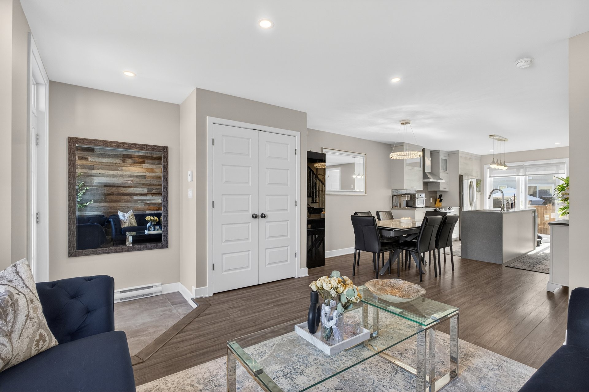 Welcome to this stunning modern townhouse in one of Vaudreuil's most sought-after neighborhoods, known for its vibrant community and convenient amenities. The main floor features an open-concept layout flooded with natural light, creating a bright and inviting living space.This home offers two spacious bedrooms, a full bathroom, a powder room, and a fully finished basement with a practical laundry area.Additional highlights include two exterior parking spaces and a private courtyard, combining comfort and functionality in a prime location. A perfect blend of contemporary design and practical living!