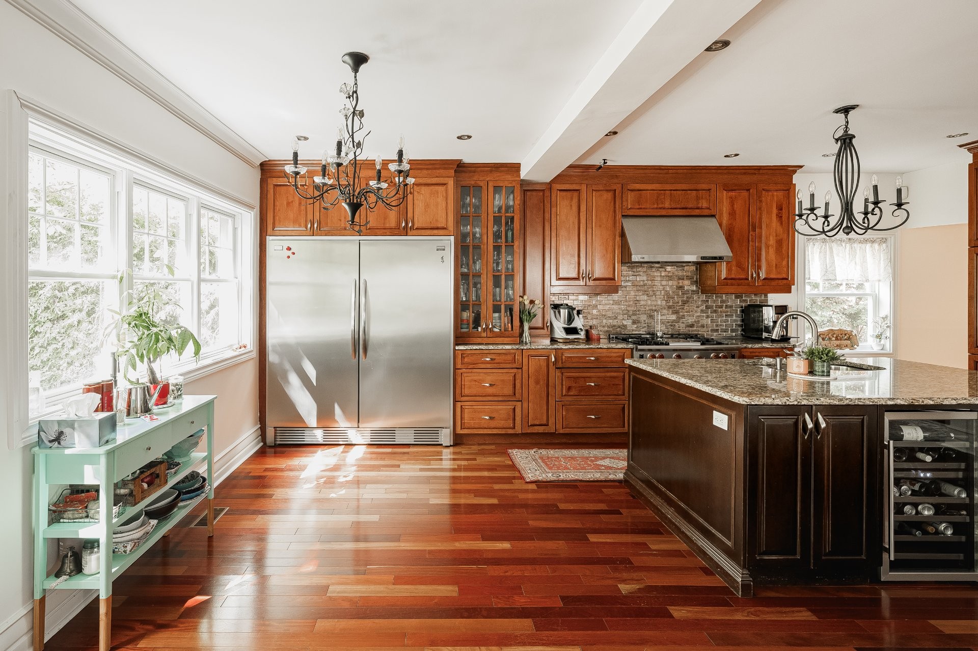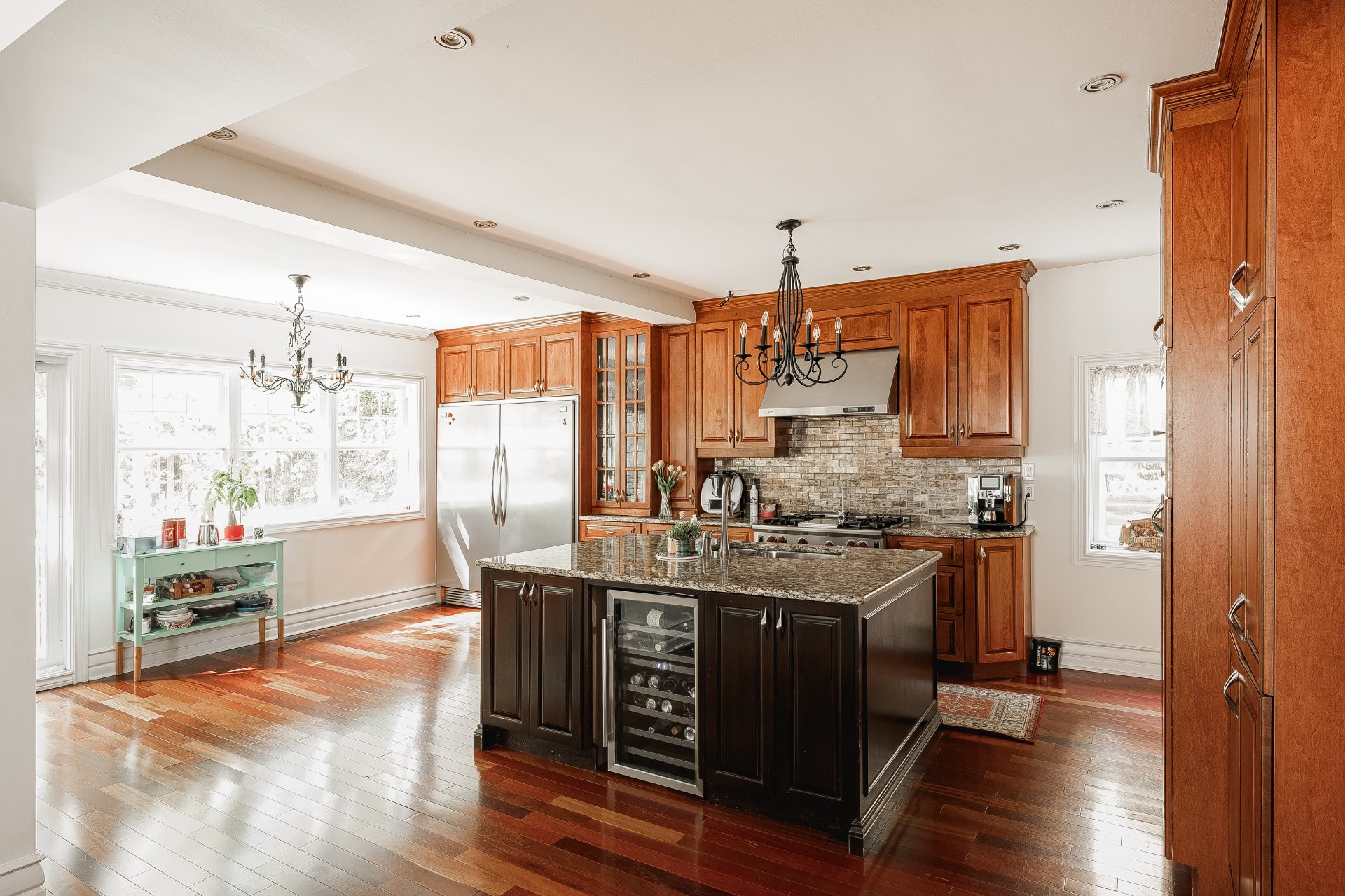 The interior of this stunning home features a bright, open layout with jatoba hardwood floors and large windows that bathe the space in natural light. The custom-designed kitchen is a chef's dream, offering hardwood cabinets, granite countertops, a large central island, and top-of-the-line appliances including a Wolf gas stove with built-in grill, oversized refrigerator/freezer, dishwasher, wine cellar, and double sink--perfect for cooking, entertaining, and making lasting memories.