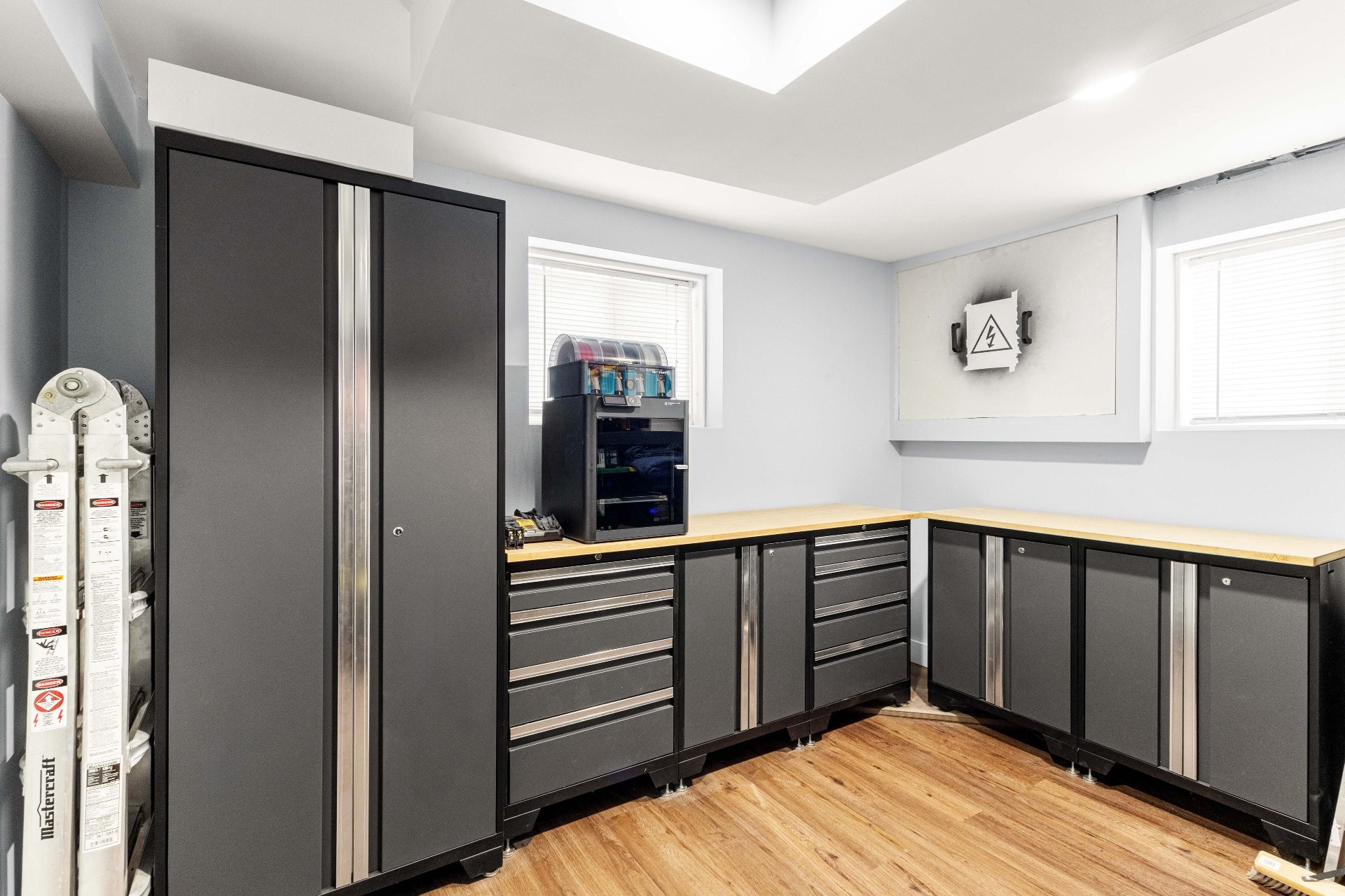 fridge, all shelving/racking in the bedroom basement (workshop), cabinets over washer and dryer.