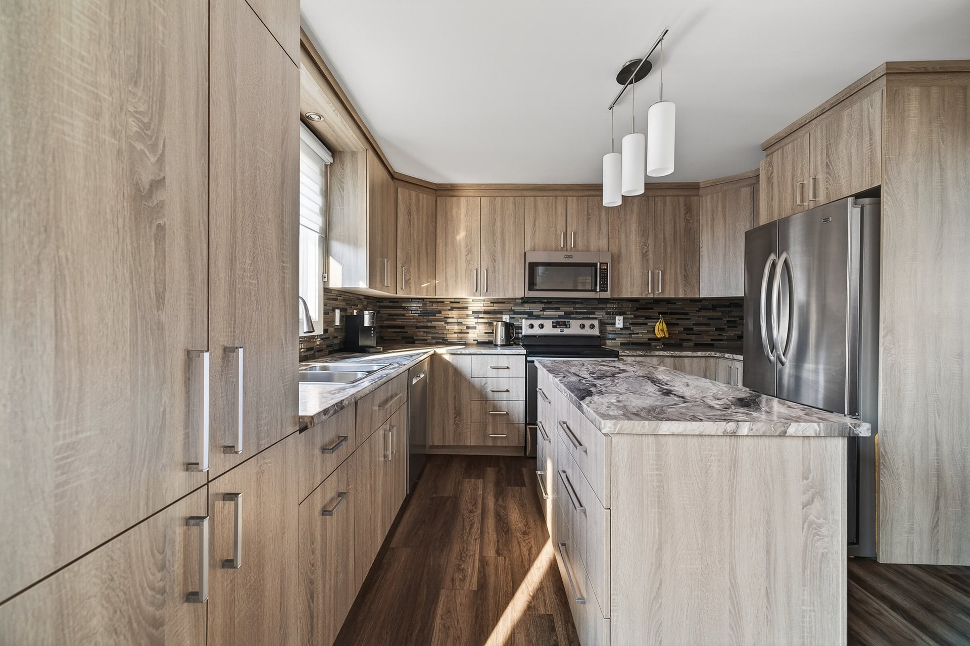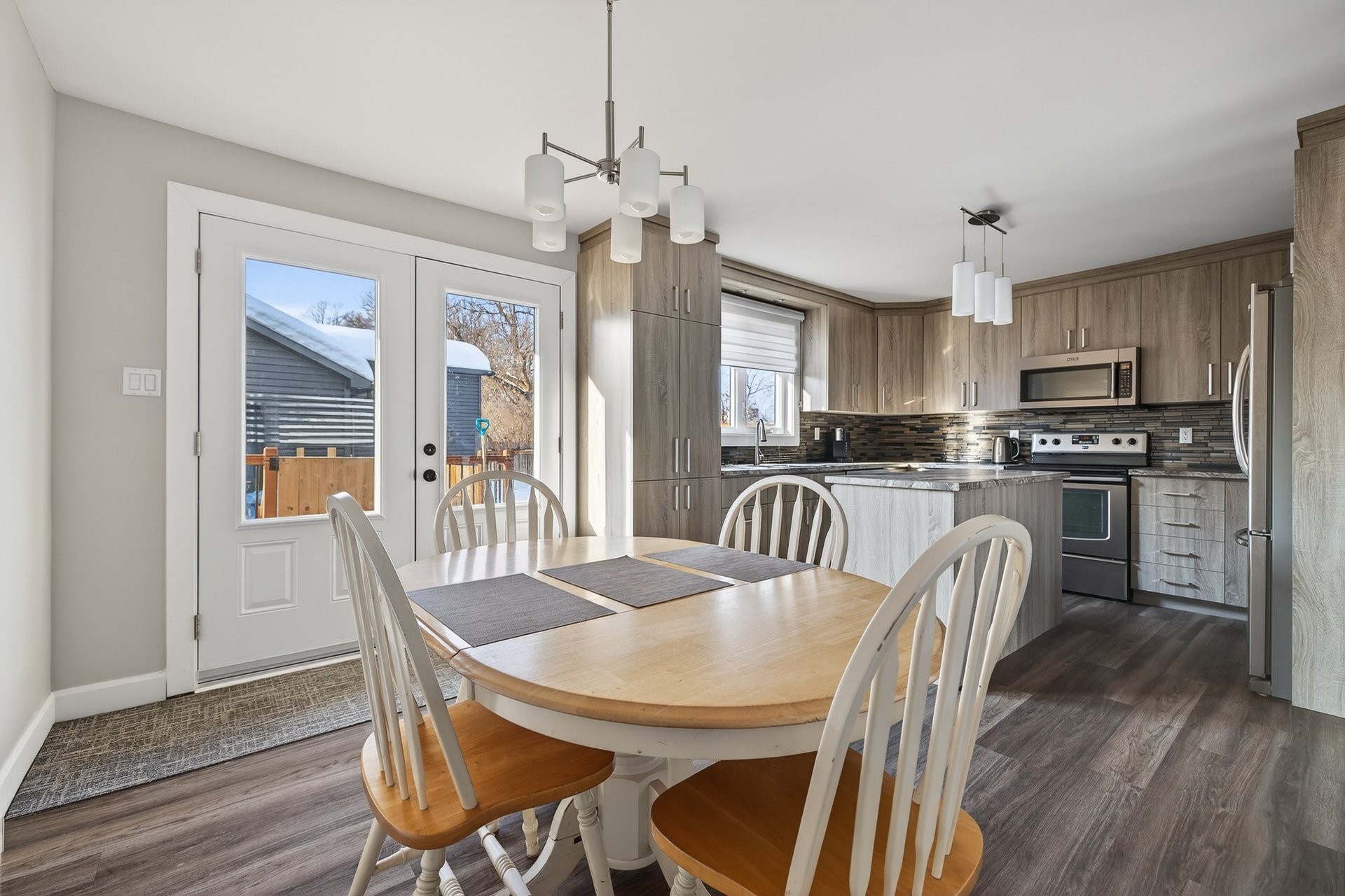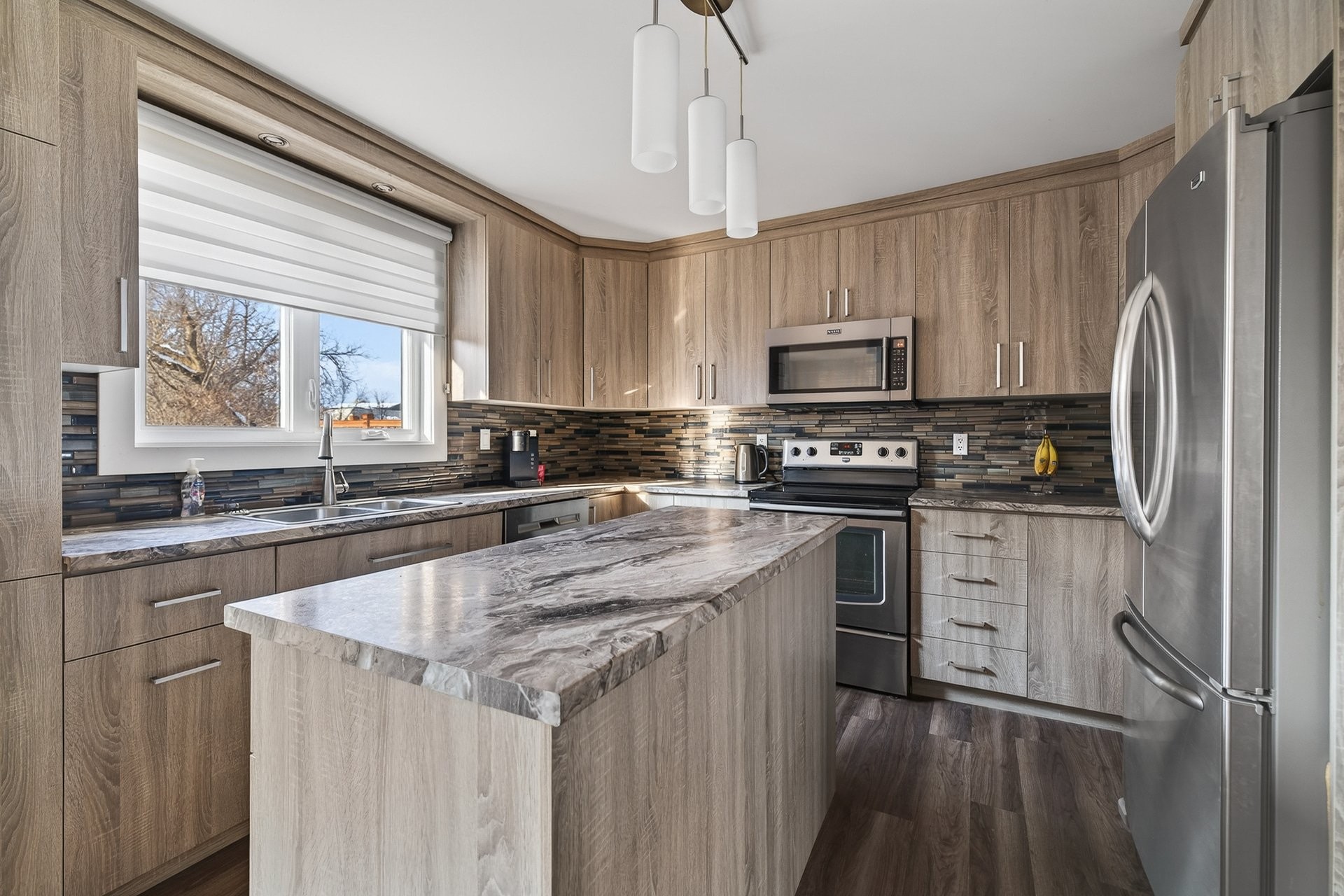 From the moment you step inside, you'll be charmed by the bright and inviting living area. The stunning kitchen, featuring a central island, offers ample workspace and storage, perfect for entertaining family and friends. It opens onto the dining room, which has a door leading to the backyard. On the other side is the living room, creating a harmonious and functional space.