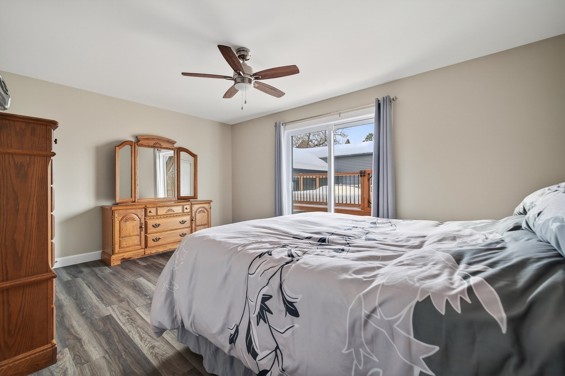 The main floor also includes three generously sized bedrooms and a full bathroom with a shower-tub combination and a vanity with plenty of storage.