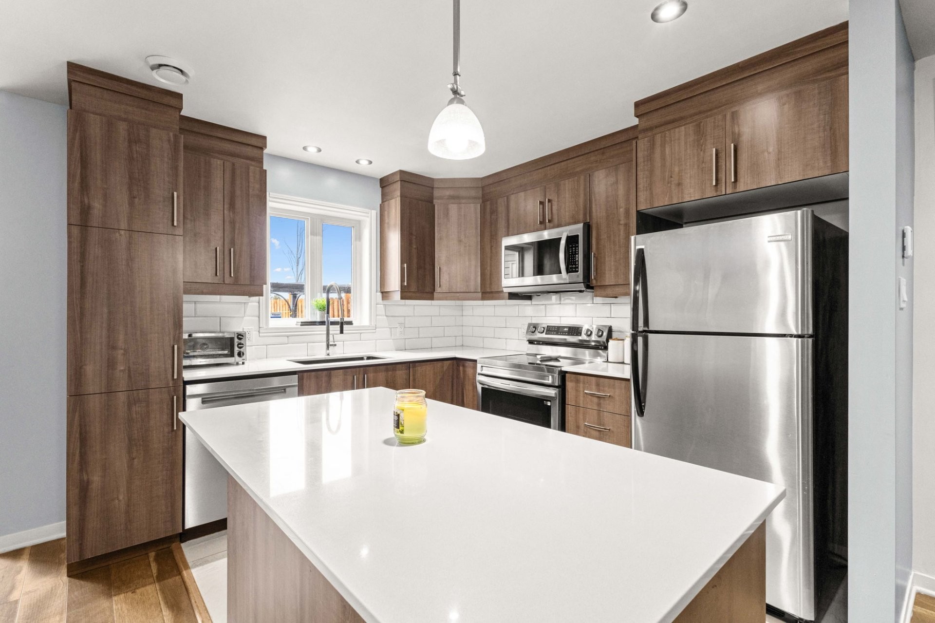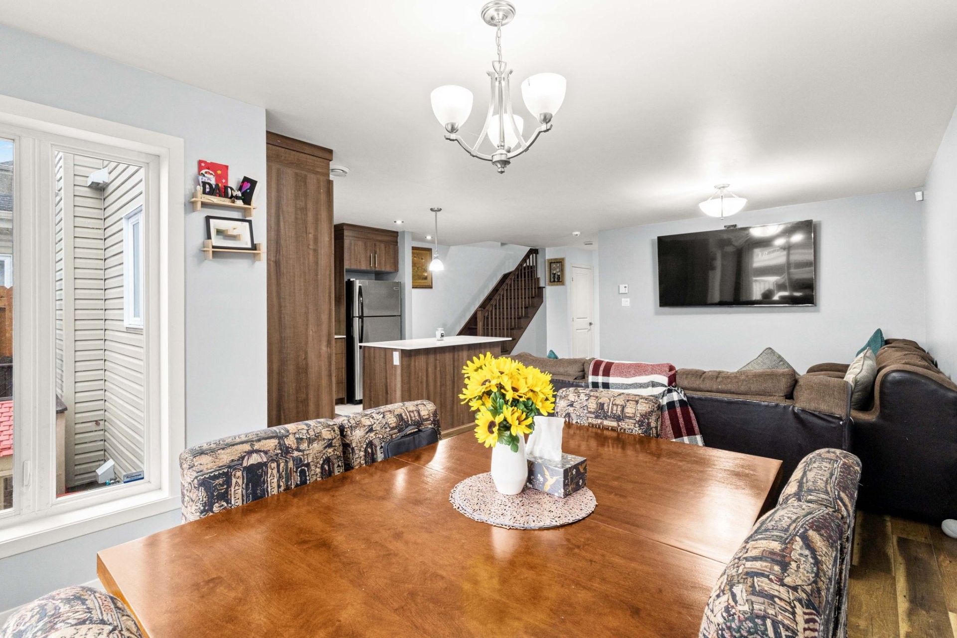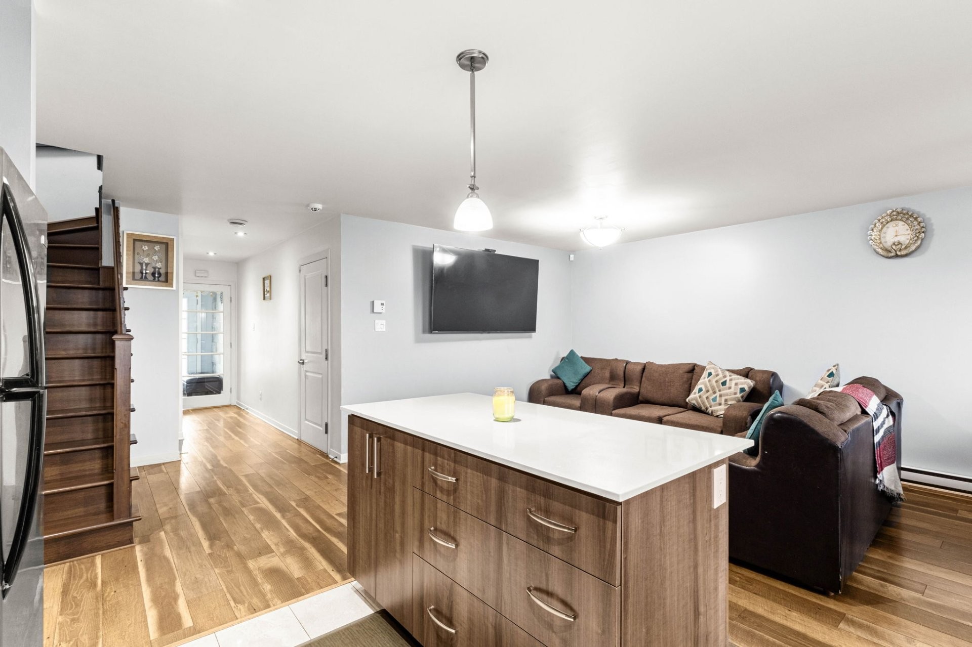 The open-concept main floor flows beautifully, combining a spacious living room and dining area with a modern kitchen that truly stands out thanks to its large central island and stylish quartz countertops - perfect for everyday meals and gatherings with family and friends.