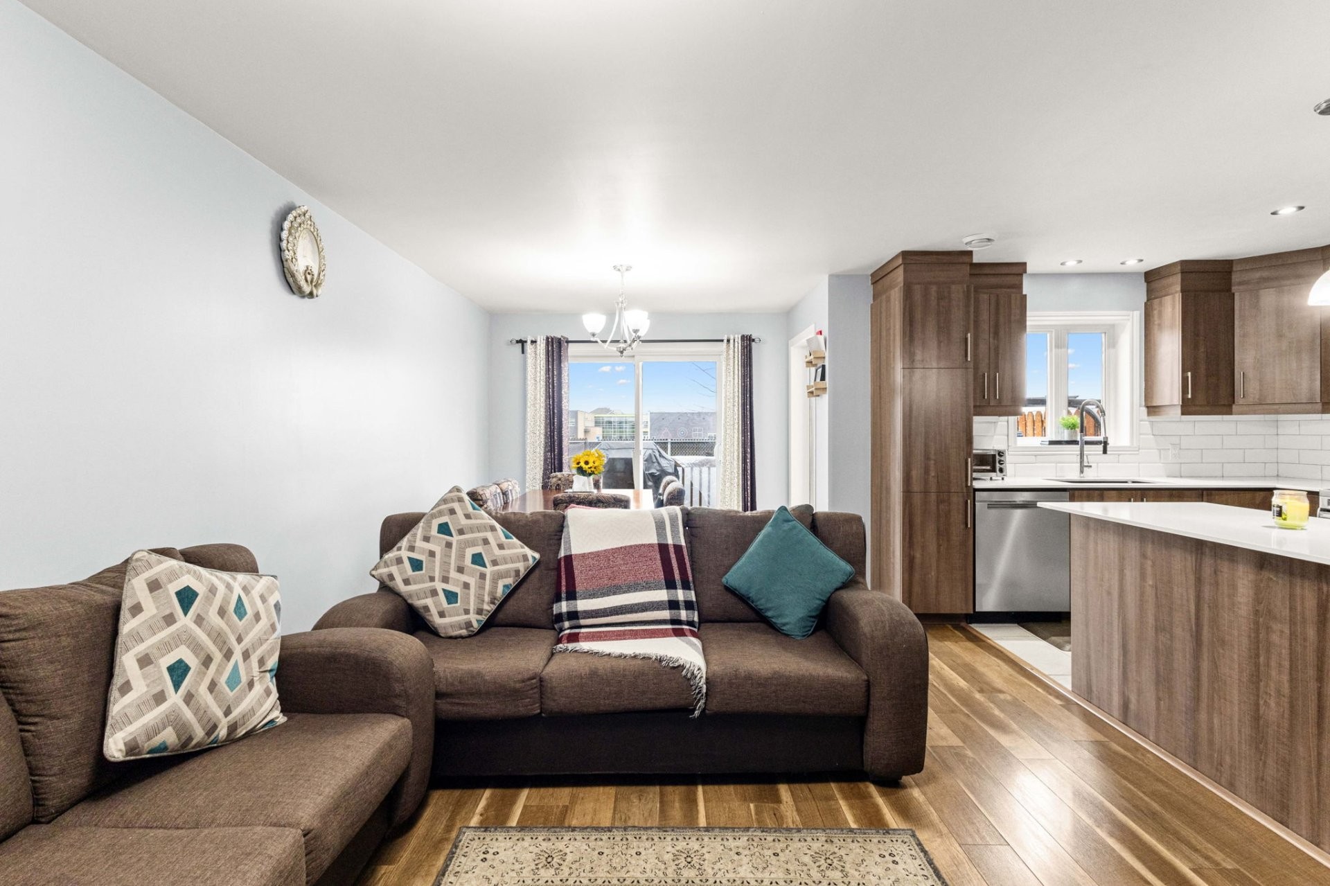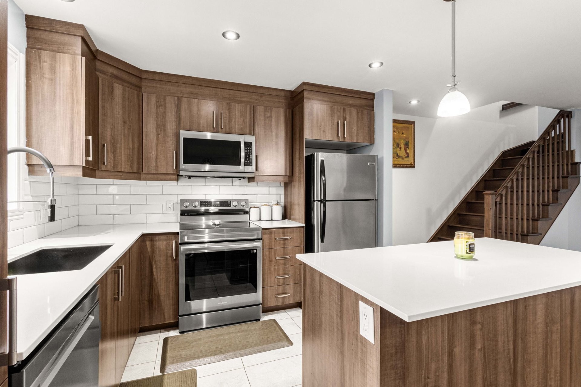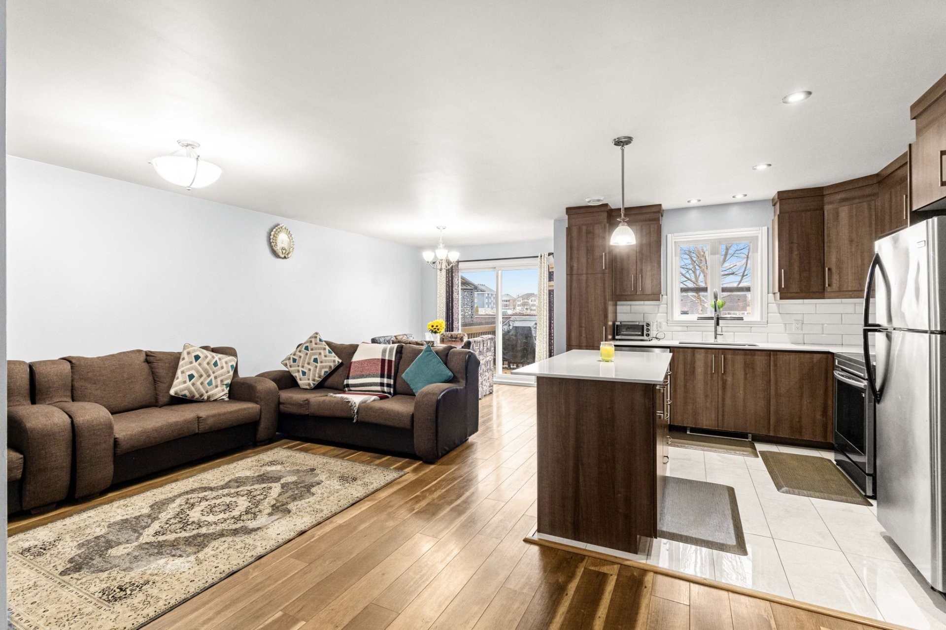 The open-concept main floor flows beautifully, combining a spacious living room and dining area with a modern kitchen that truly stands out thanks to its large central island and stylish quartz countertops - perfect for everyday meals and gatherings with family and friends.