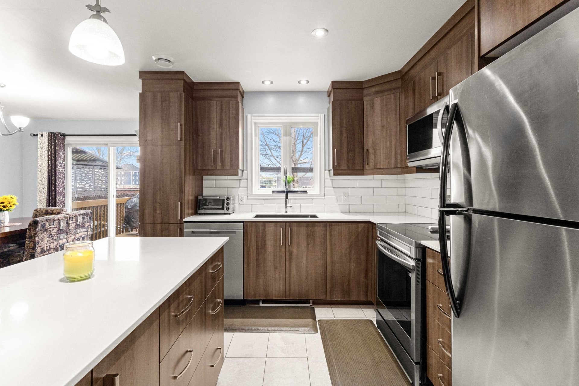 Magnificent turnkey townhouse built in 2013 and beautifully maintained. This bright and spacious home features an open-concept main floor with a generous living room, dining area and kitchen centered around a large island with elegant quartz countertops. Upstairs you will find three comfortable bedrooms, including a primary suite with an ensuite bathroom, along with three full bathrooms in total. The fully finished basement offers excellent flexibility as a family room, home office or potential fourth bedroom. Enjoy a fully fenced private yard with no rear neighbours. Peacefully located in a family-friendly neighbourhood