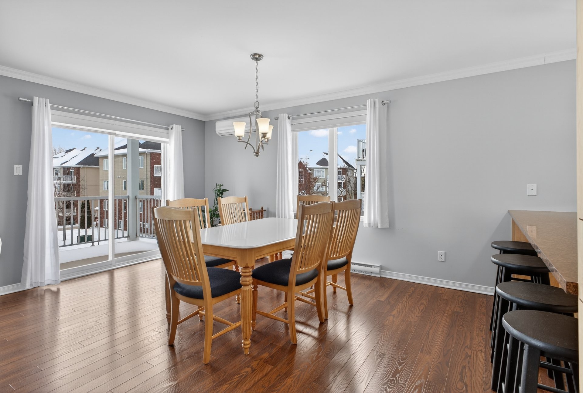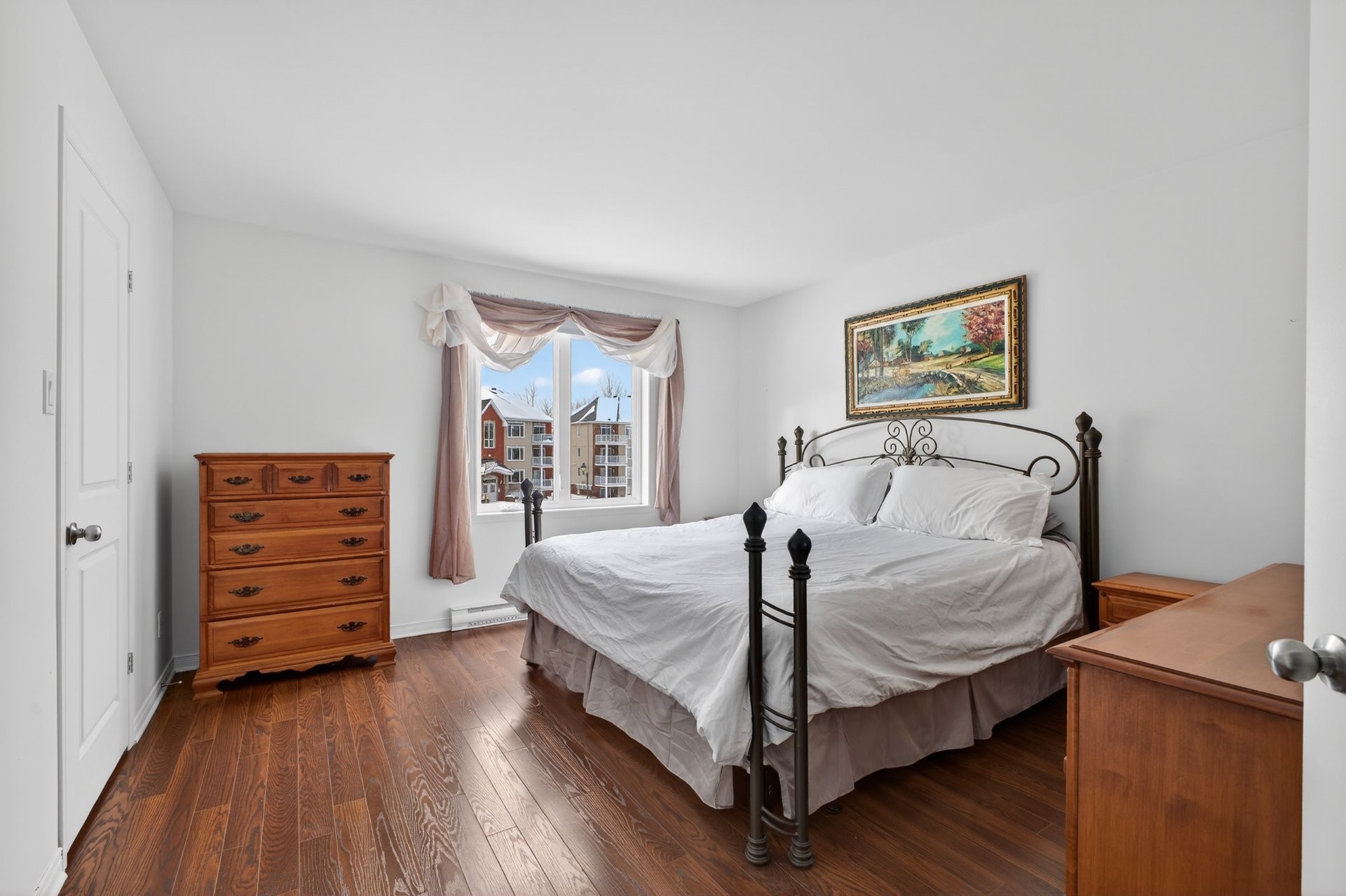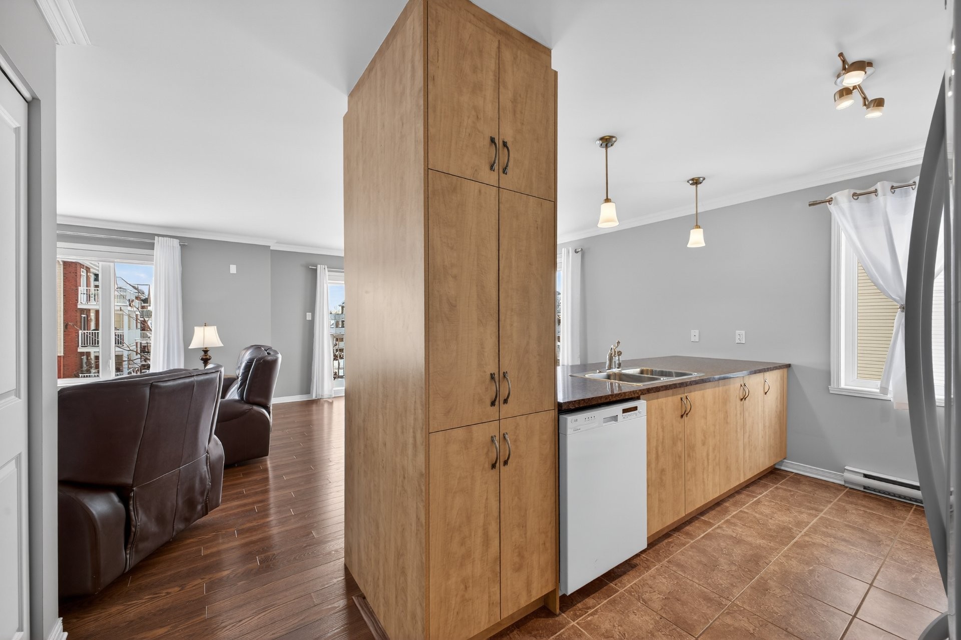 Bright, beautiful, and spacious 2nd-floor, 1,175 sq. ft. condo, nestled within a quiet neighbourhood in the heart of Châteauguay and close to all services, boasting stylish interiors, an open-plan living/diningkitchen area, a large private balcony, oversized windows, a chef's kitchen with bar (island), a primary bedroom with walk-in closet, a second guest bedroom or office, a large bathroom with a bath and separate shower, a washer/dryer closet, two parking spaces, exterior storage, and an intercom for controlled access. Pets allowed (maximum 30 lbs).