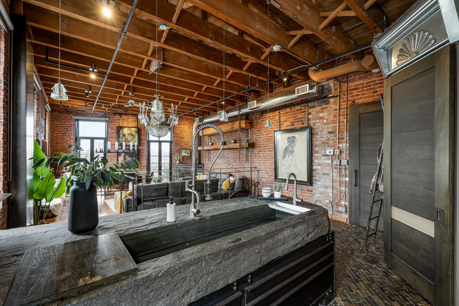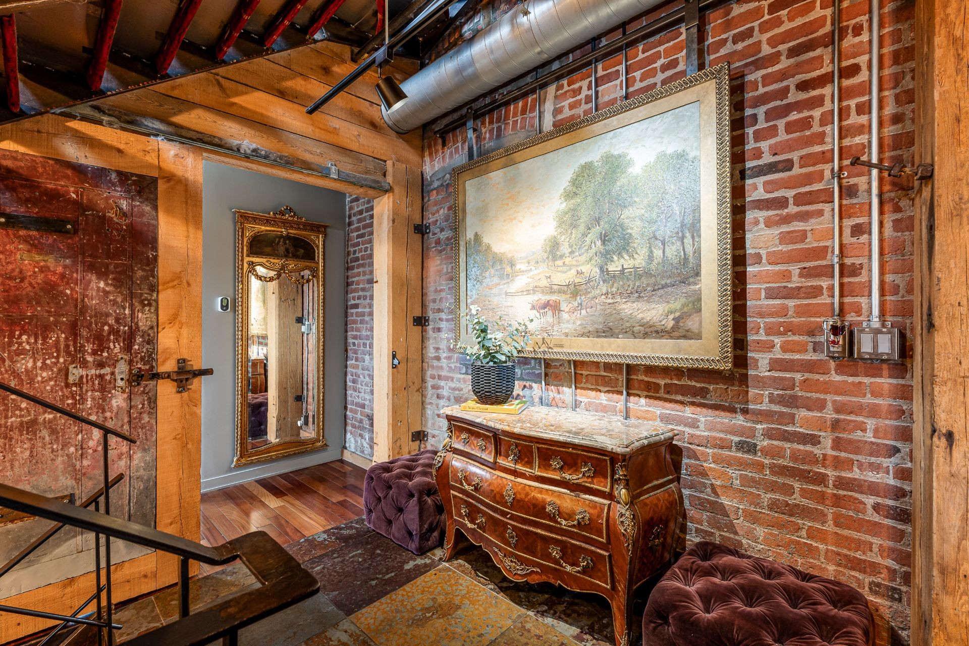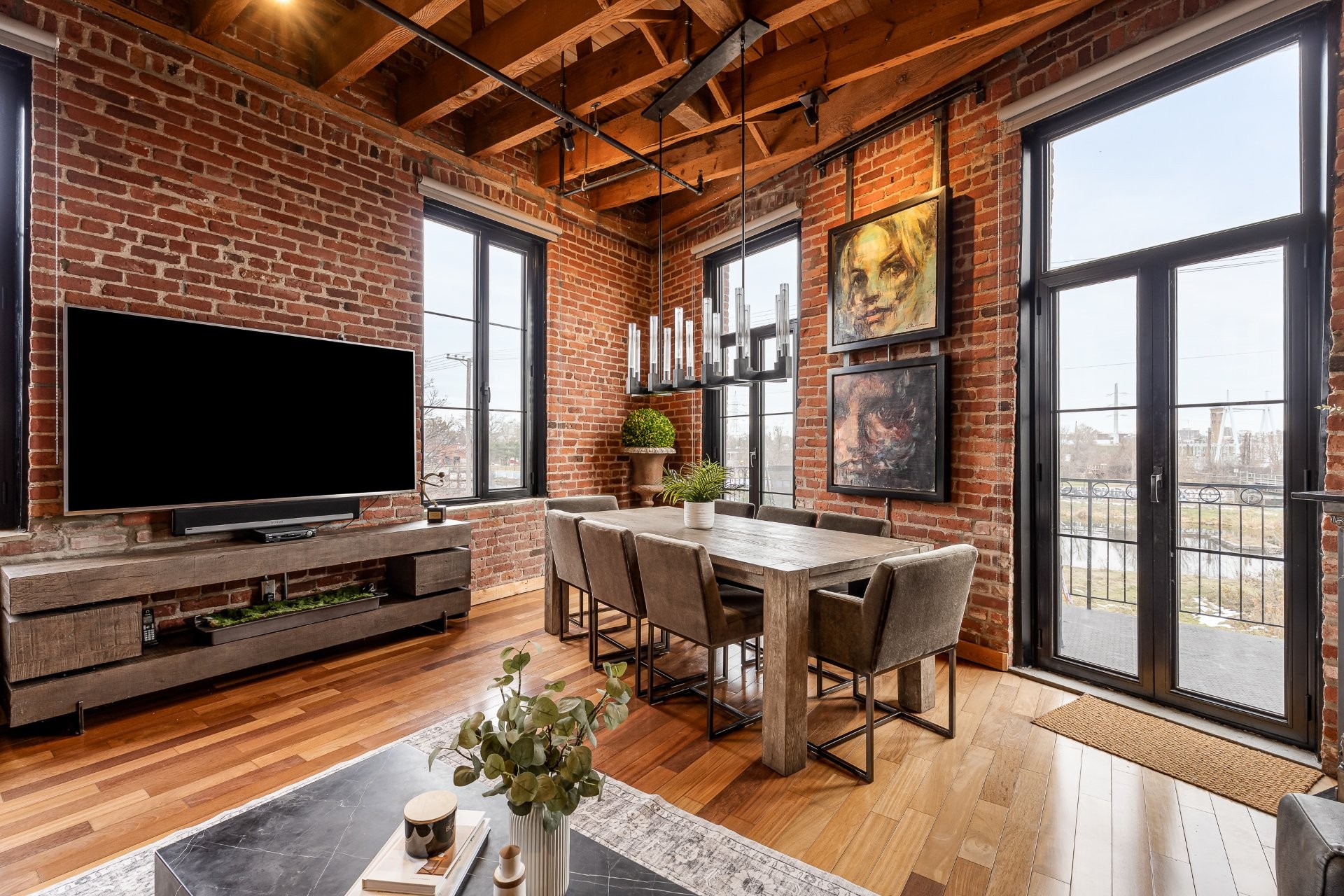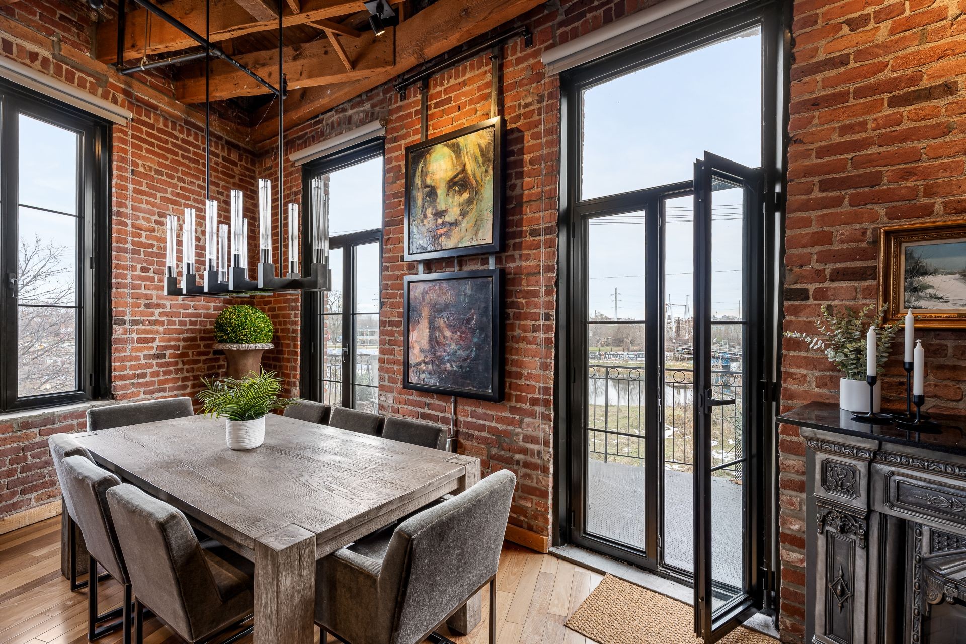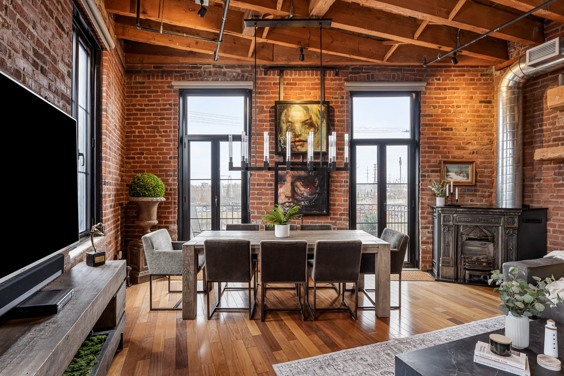 A hidden gem in Clos St-Ambroise! This stunning 2-level condo in a restored St-Henri tannery blends industrial charm with luxury finishes. Featuring 14-ft ceilings, exposed brick, original sliding doors, wood beams, and huge windows with water + city views. High-end materials throughout: exotic wood + slate floors, carved stone counters and sinks. Private entrance, spacious layout, open-concept living, and direct garage access with 2 parking spots. Steps from Atwater Market + Lachine Canal. Stylish, bright, and truly one of a kind!