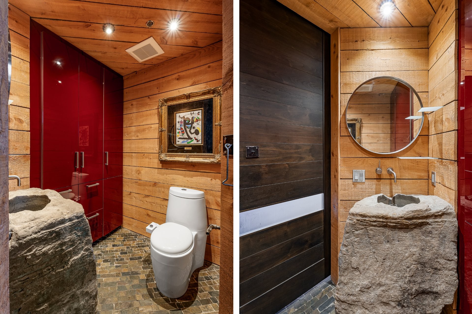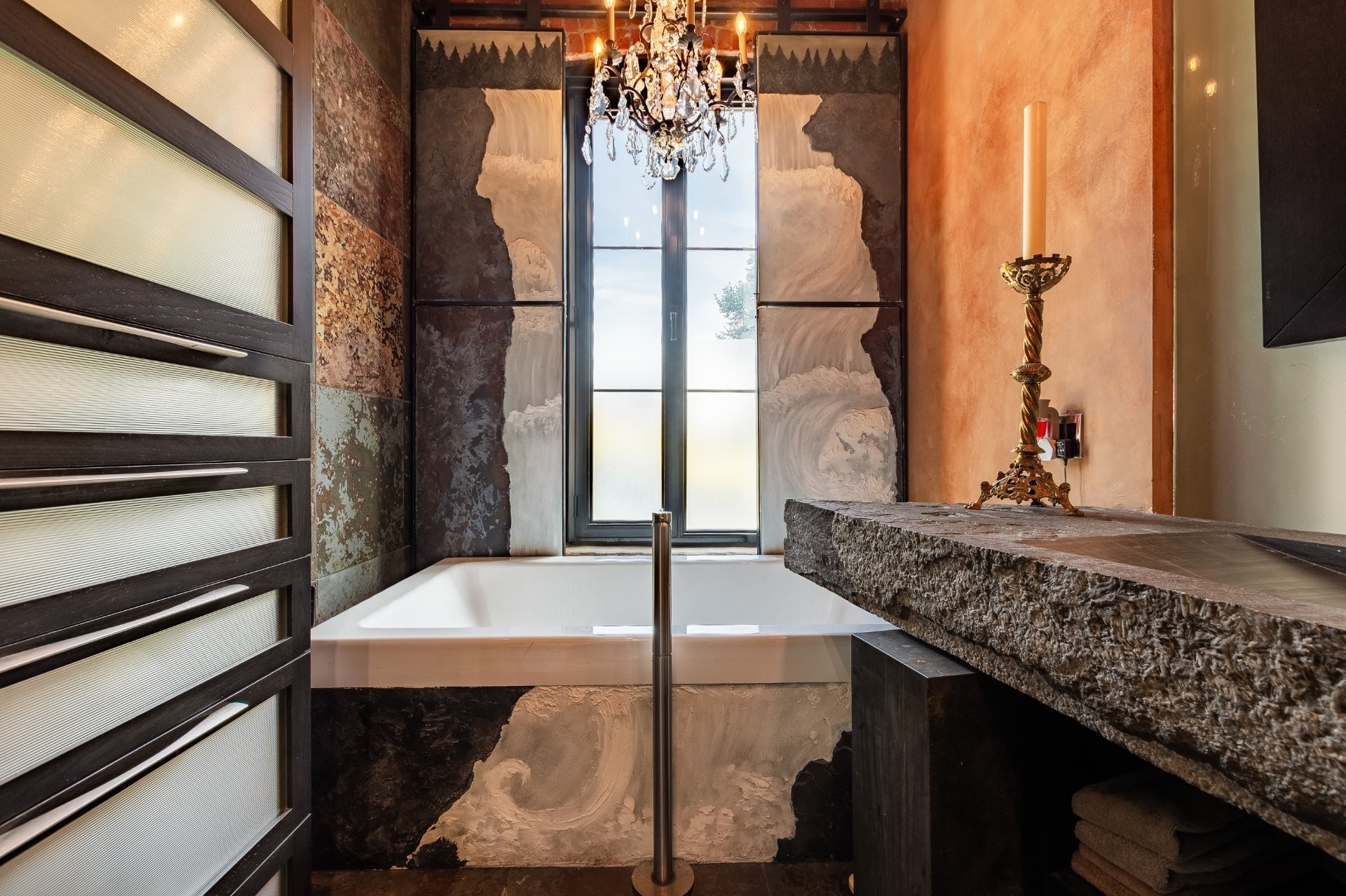 The kitchen is a work of art, featuring stone-carved countertops that add a bold, sculptural element to the space. The same artistry continues in the powder room and spa-like ensuite, where custom stone sinks, heated floors, a freestanding tub, walk-in shower, and ample storage create a true sanctuary in the sunny, oversized primary bedroom.