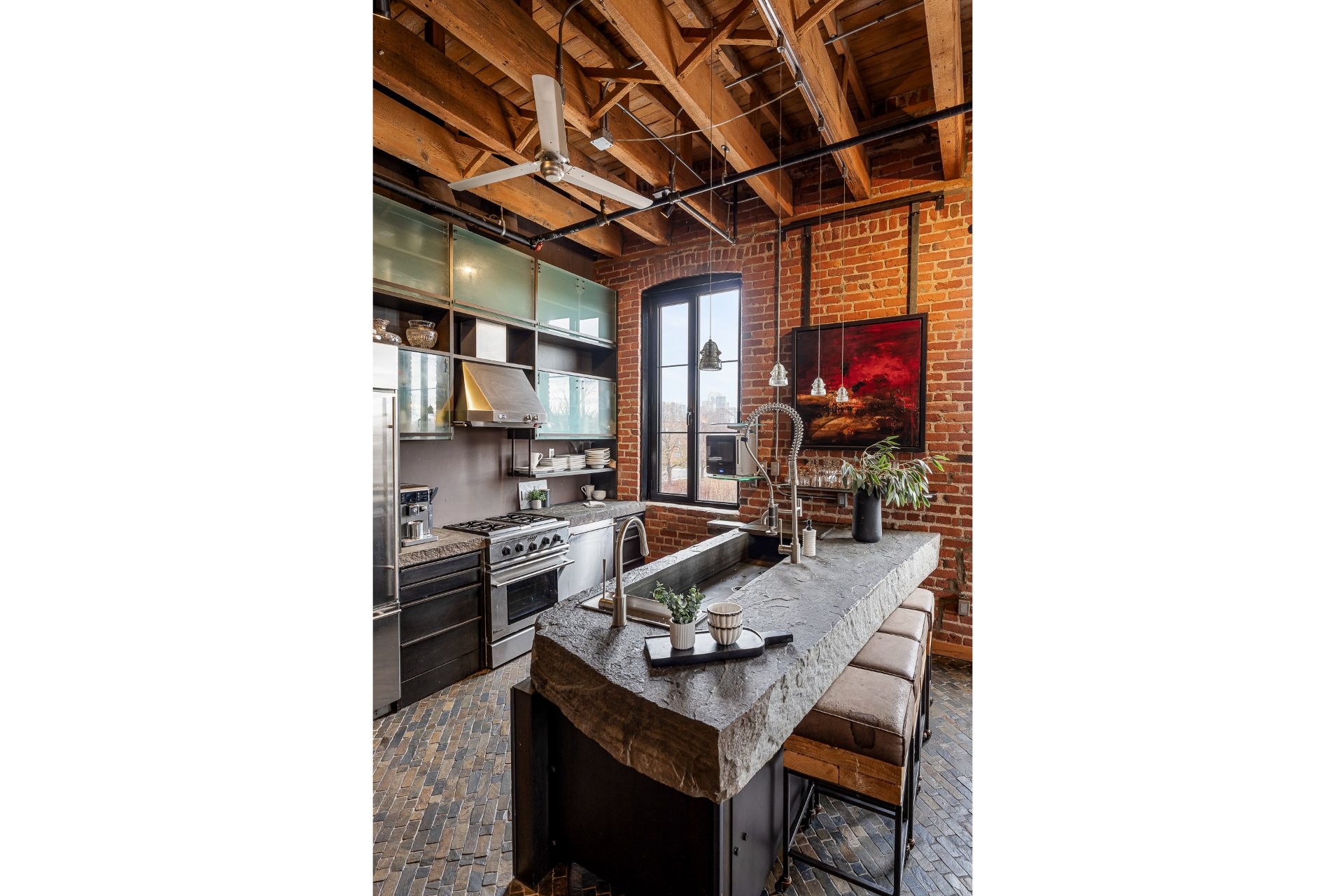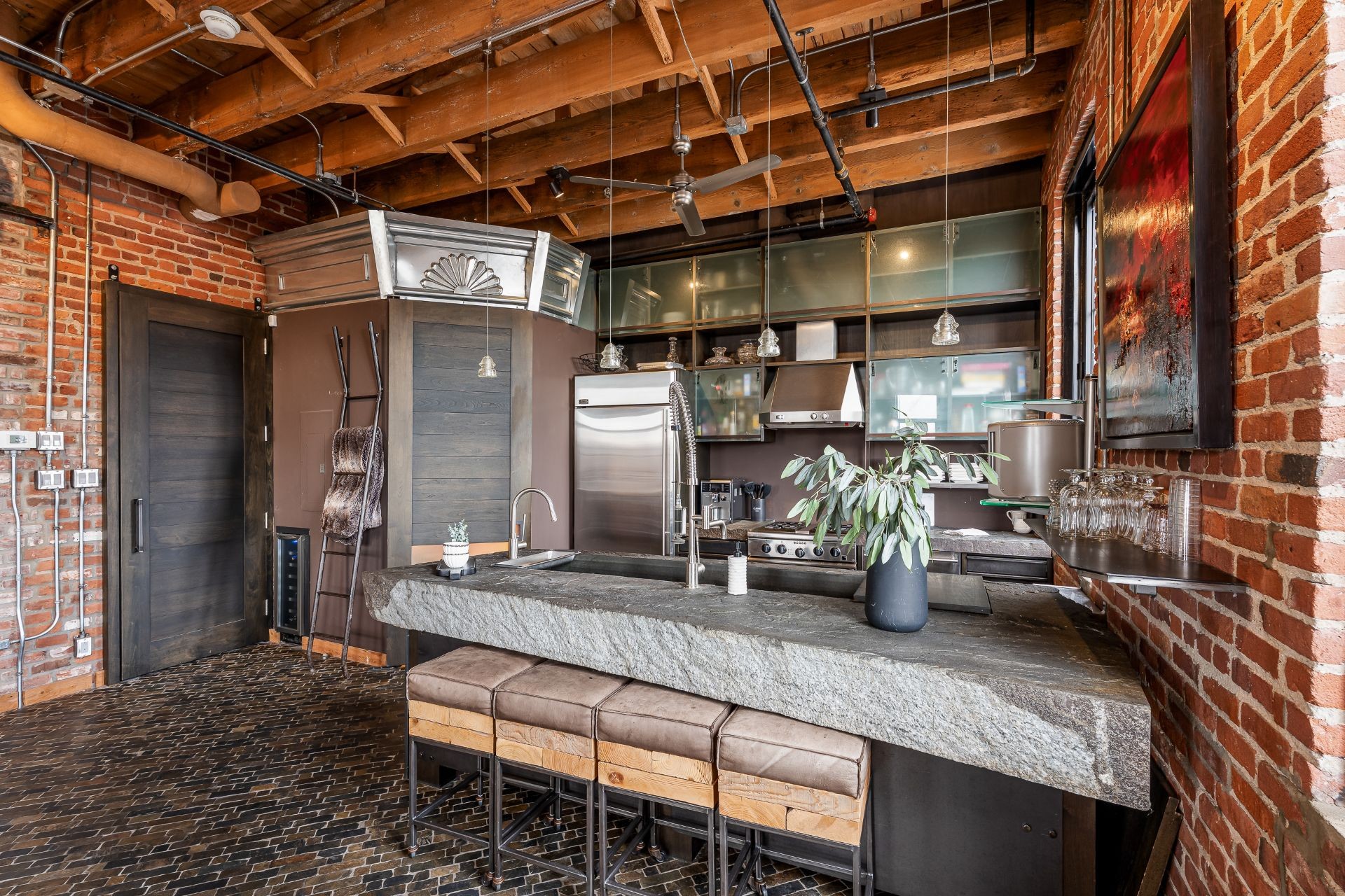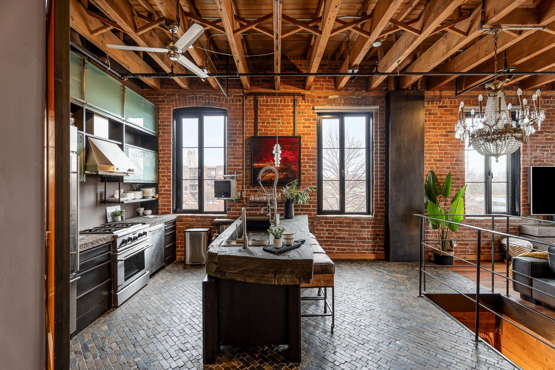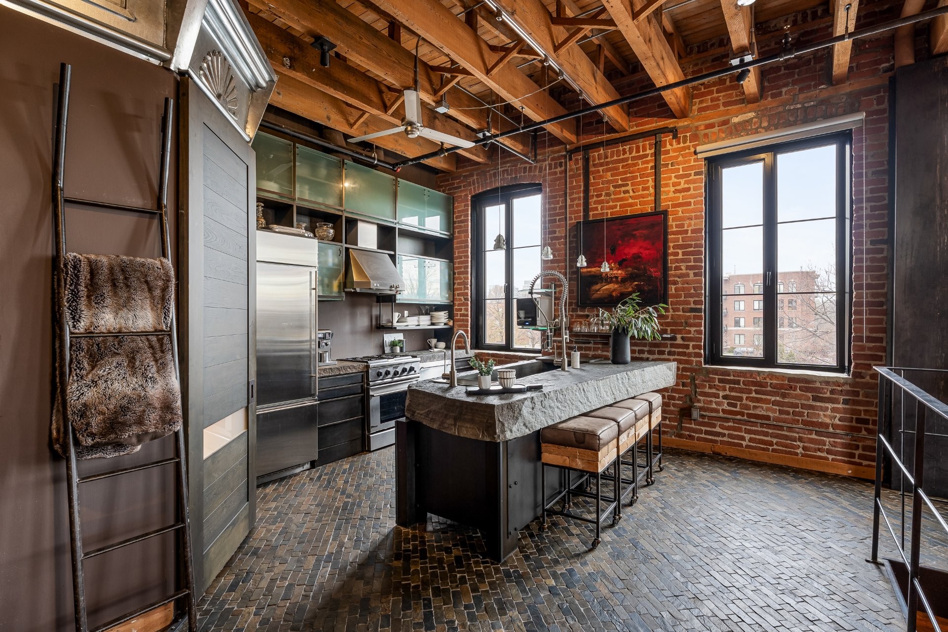 The space is a masterpiece of contrasts and craftsmanship. Soaring 14-foot ceilings, oversized windows, exposed brick, original sliding factory doors, wooden beams, and visible piping all nod to the building's industrial past--while tailor-made, high-end finishes add warmth and elegance throughout. Floors are a striking mix of exotic hardwood and natural slate, setting the tone for a home that's as rich in character as it is in comfort.