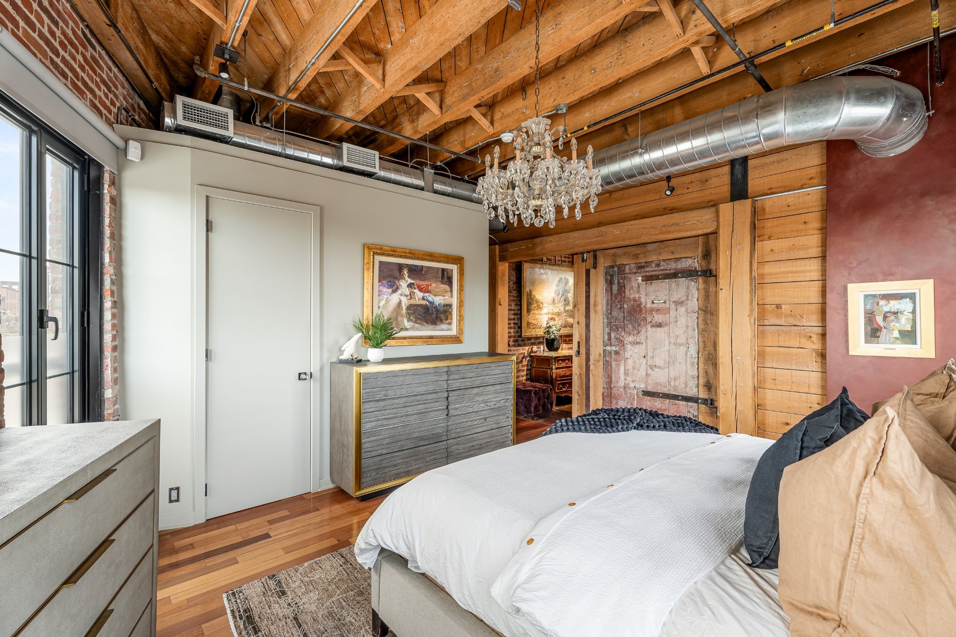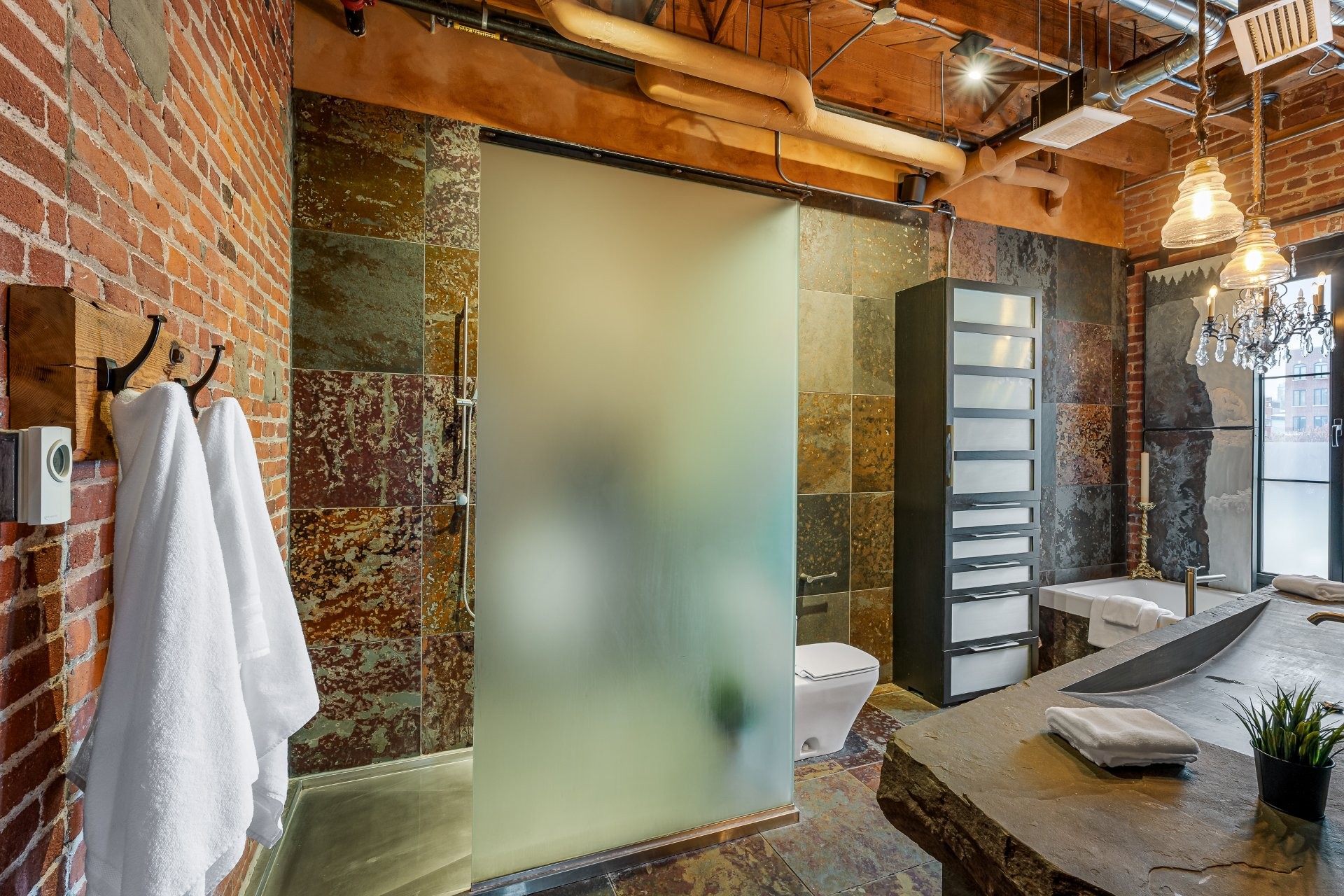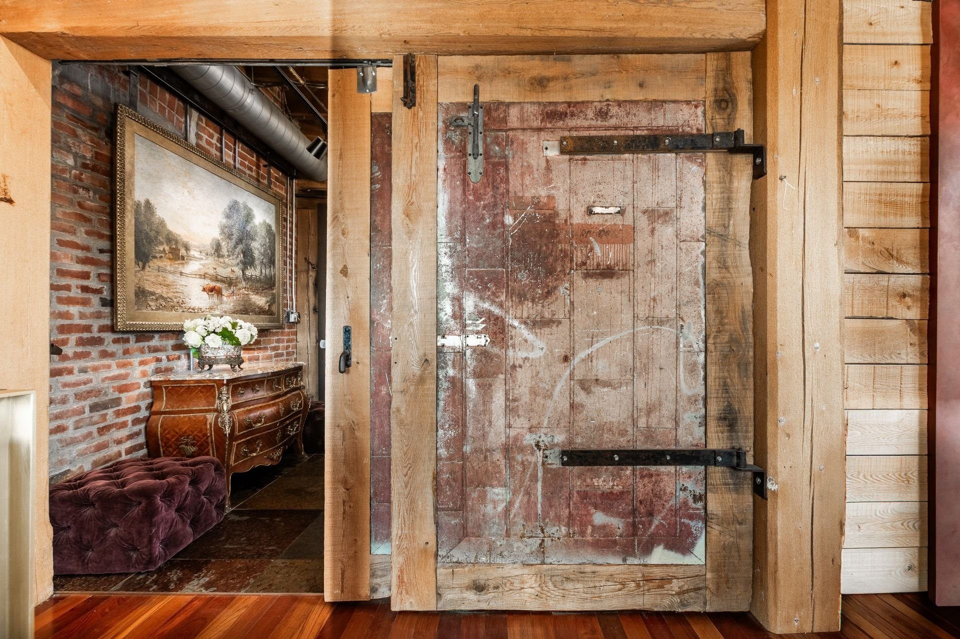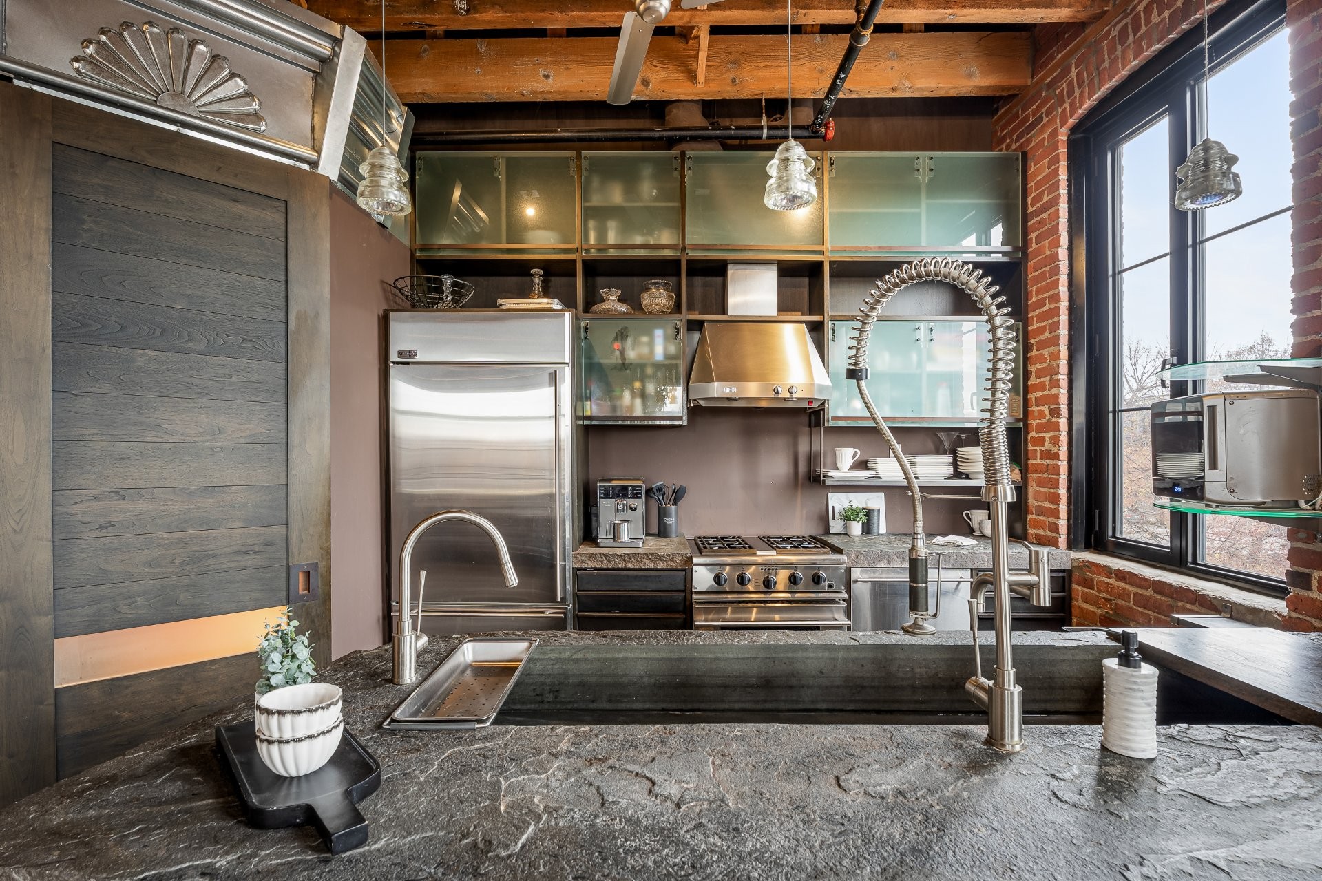 The space is a masterpiece of contrasts and craftsmanship. Soaring 14-foot ceilings, oversized windows, exposed brick, original sliding factory doors, wooden beams, and visible piping all nod to the building's industrial past--while tailor-made, high-end finishes add warmth and elegance throughout. Floors are a striking mix of exotic hardwood and natural slate, setting the tone for a home that's as rich in character as it is in comfort.