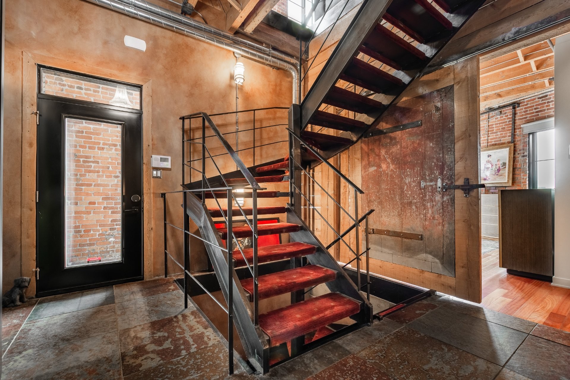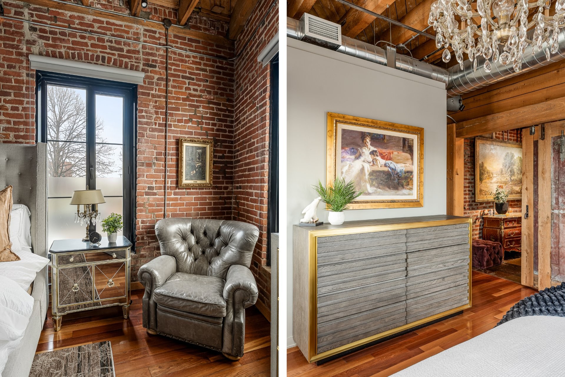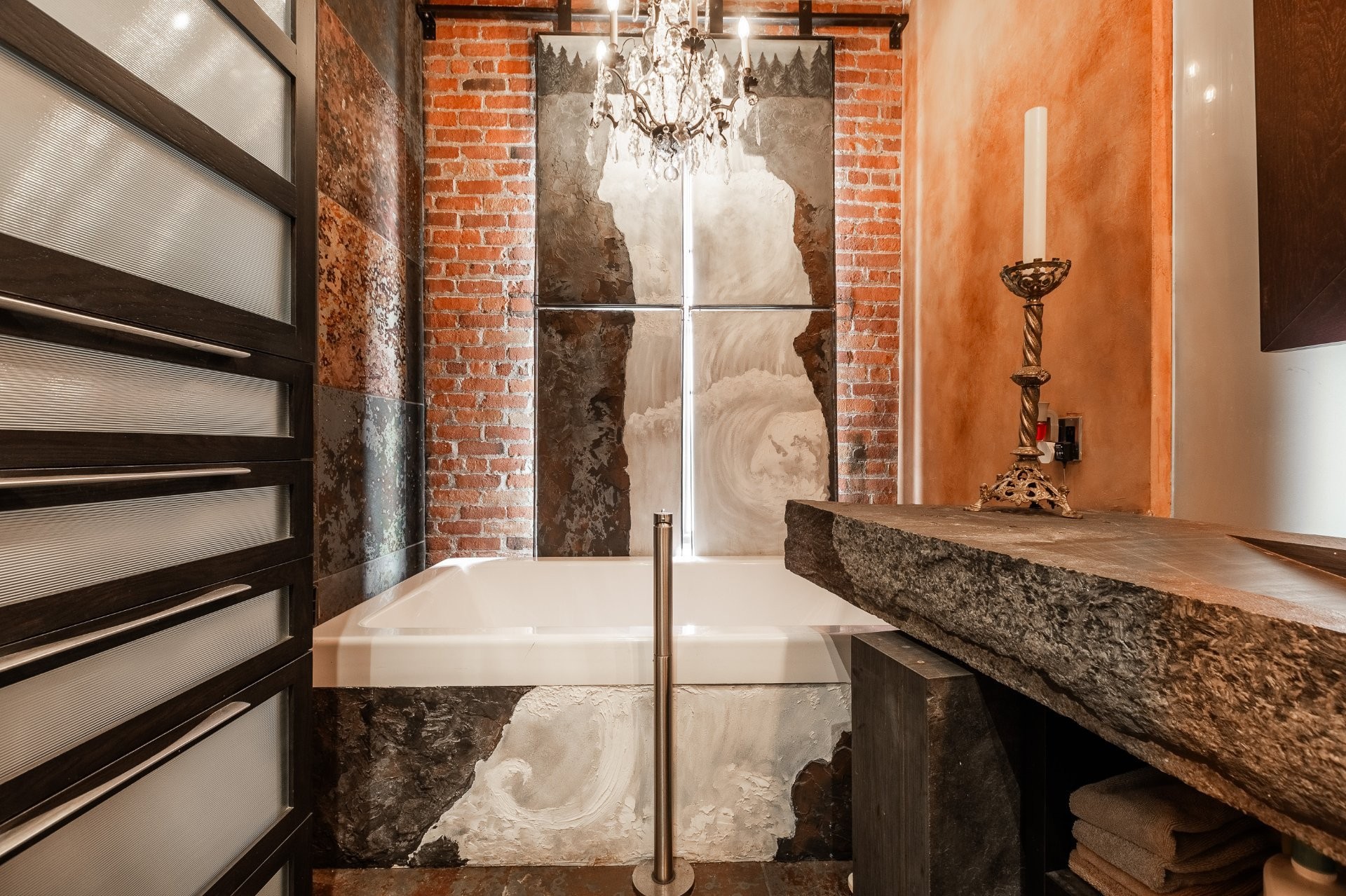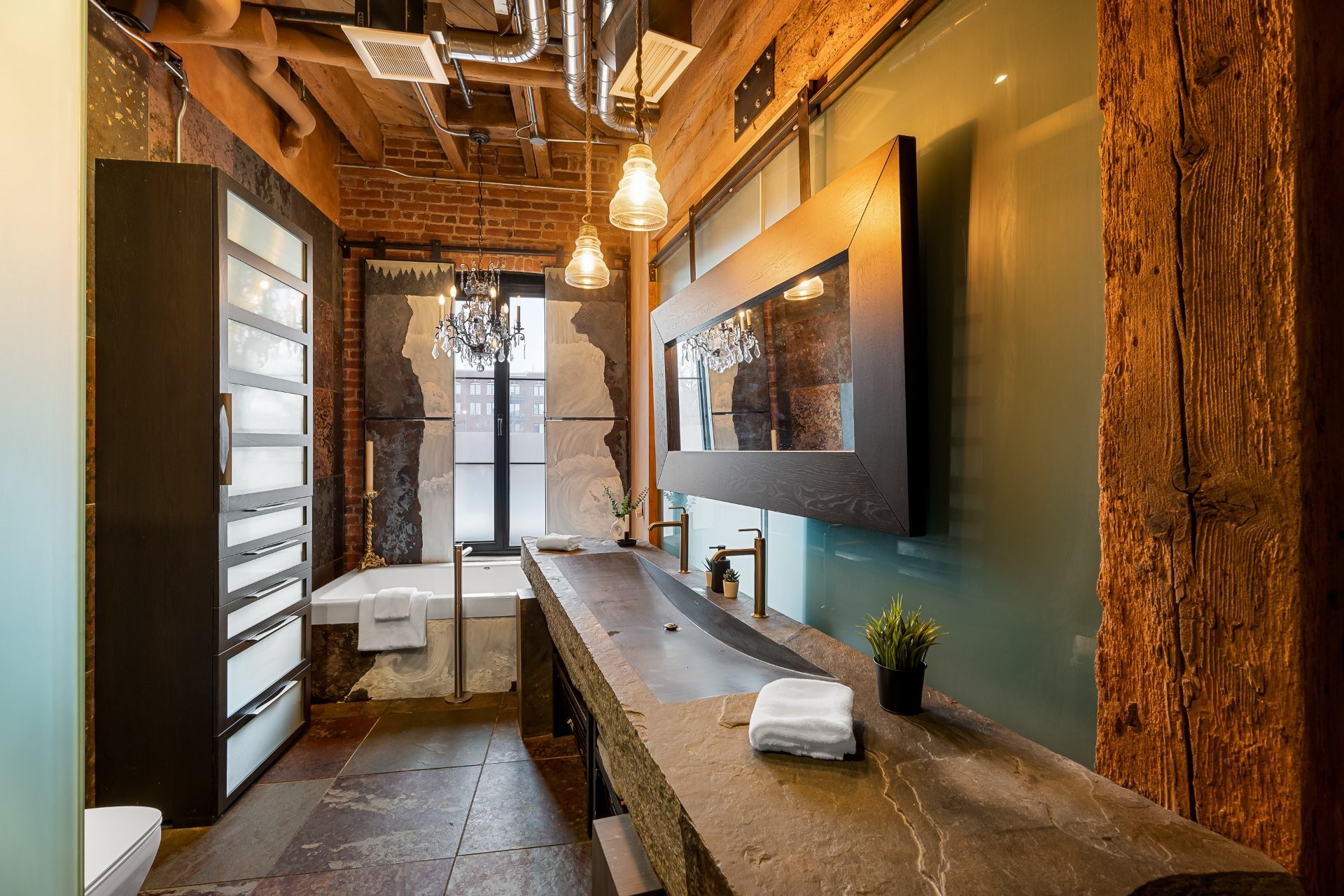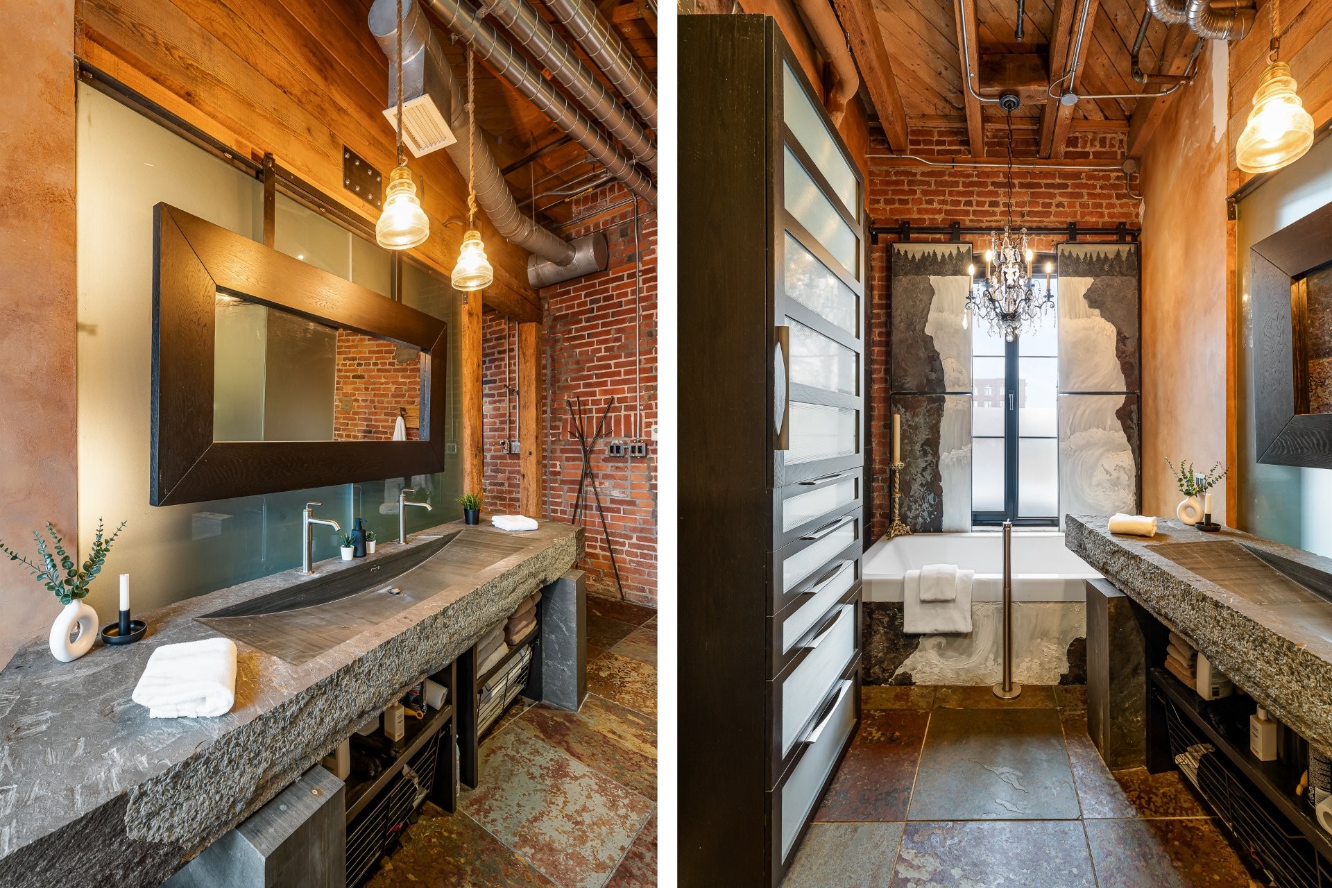 The space is a masterpiece of contrasts and craftsmanship. Soaring 14-foot ceilings, oversized windows, exposed brick, original sliding factory doors, wooden beams, and visible piping all nod to the building's industrial past--while tailor-made, high-end finishes add warmth and elegance throughout. Floors are a striking mix of exotic hardwood and natural slate, setting the tone for a home that's as rich in character as it is in comfort.