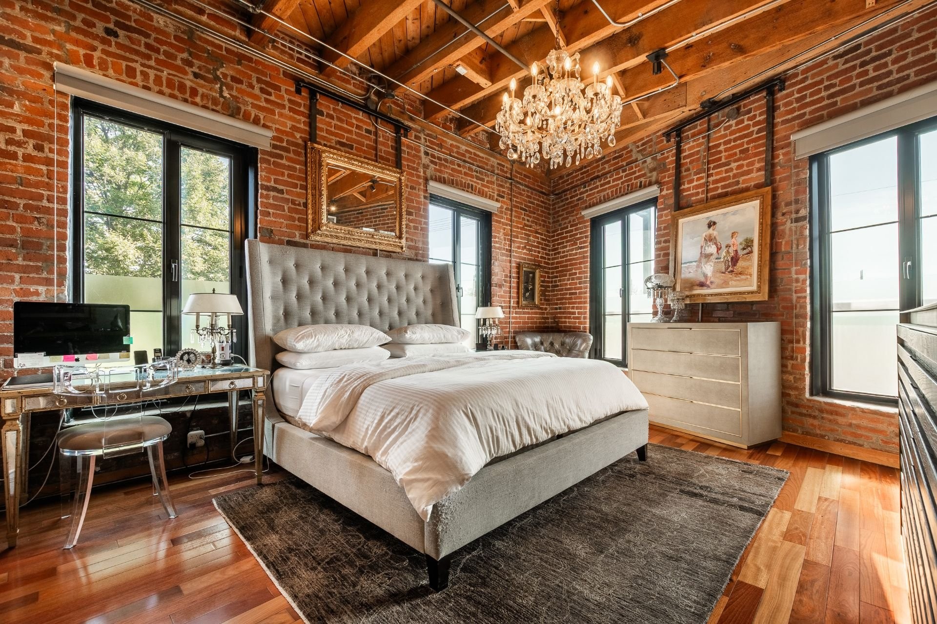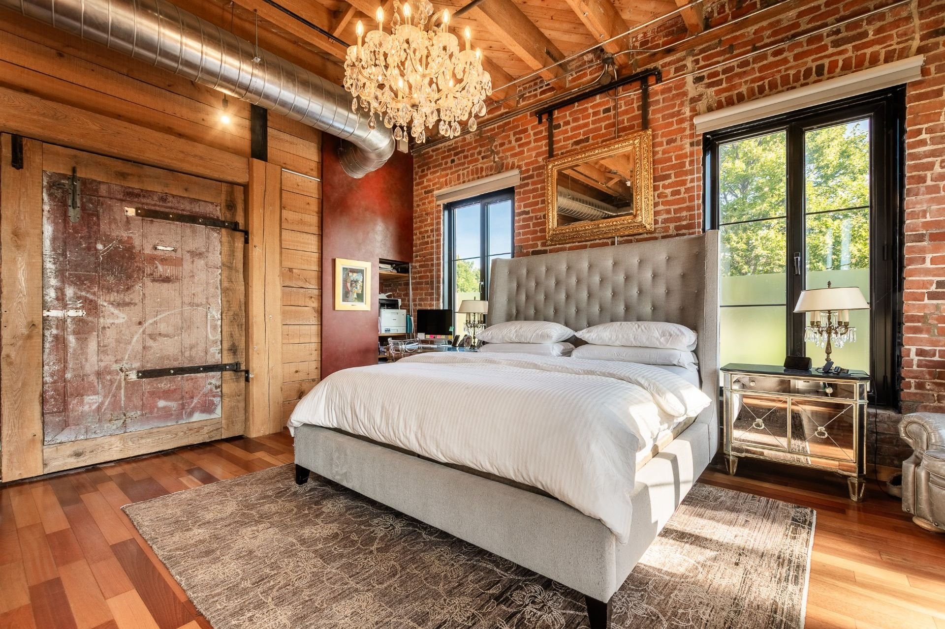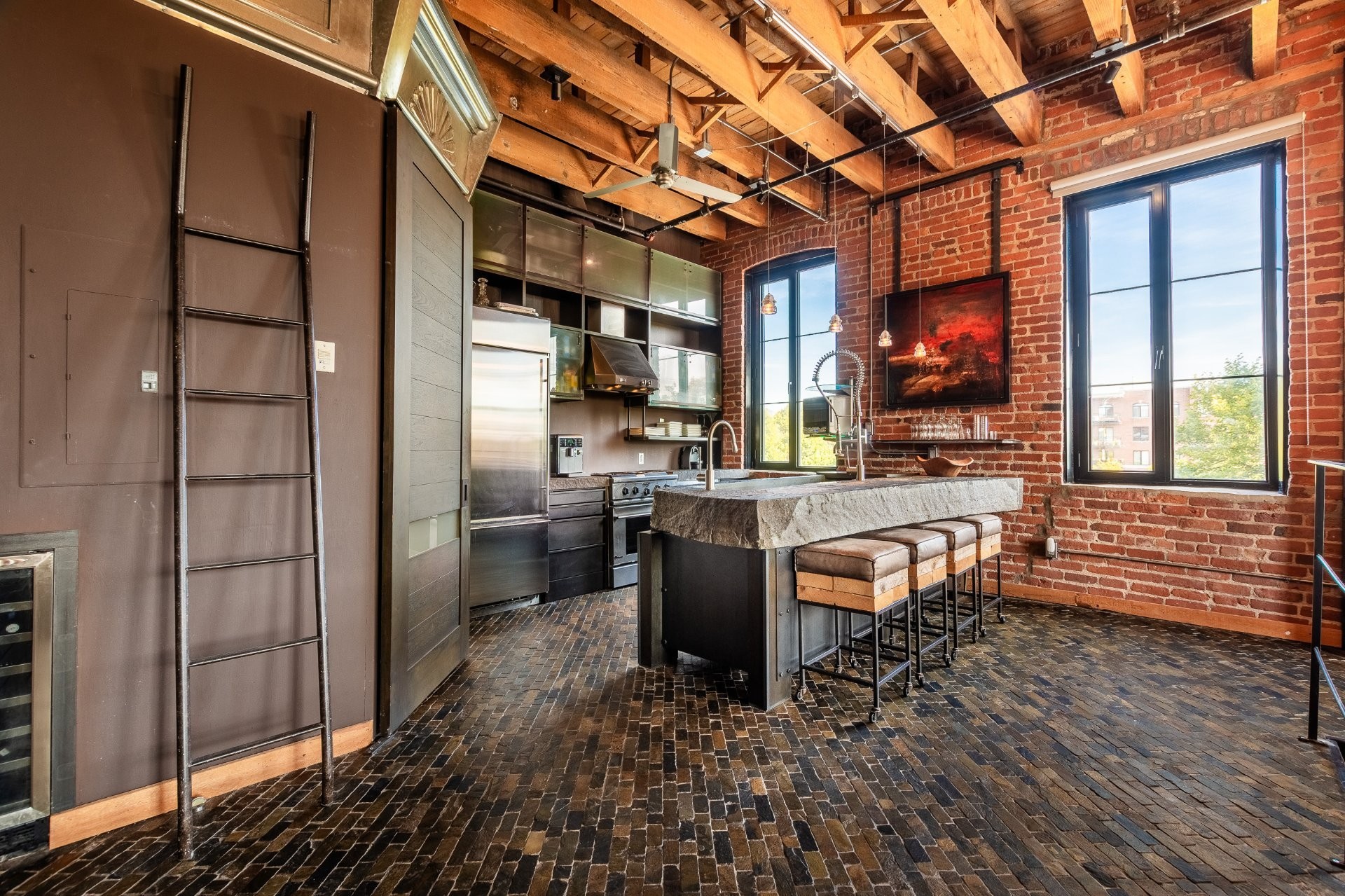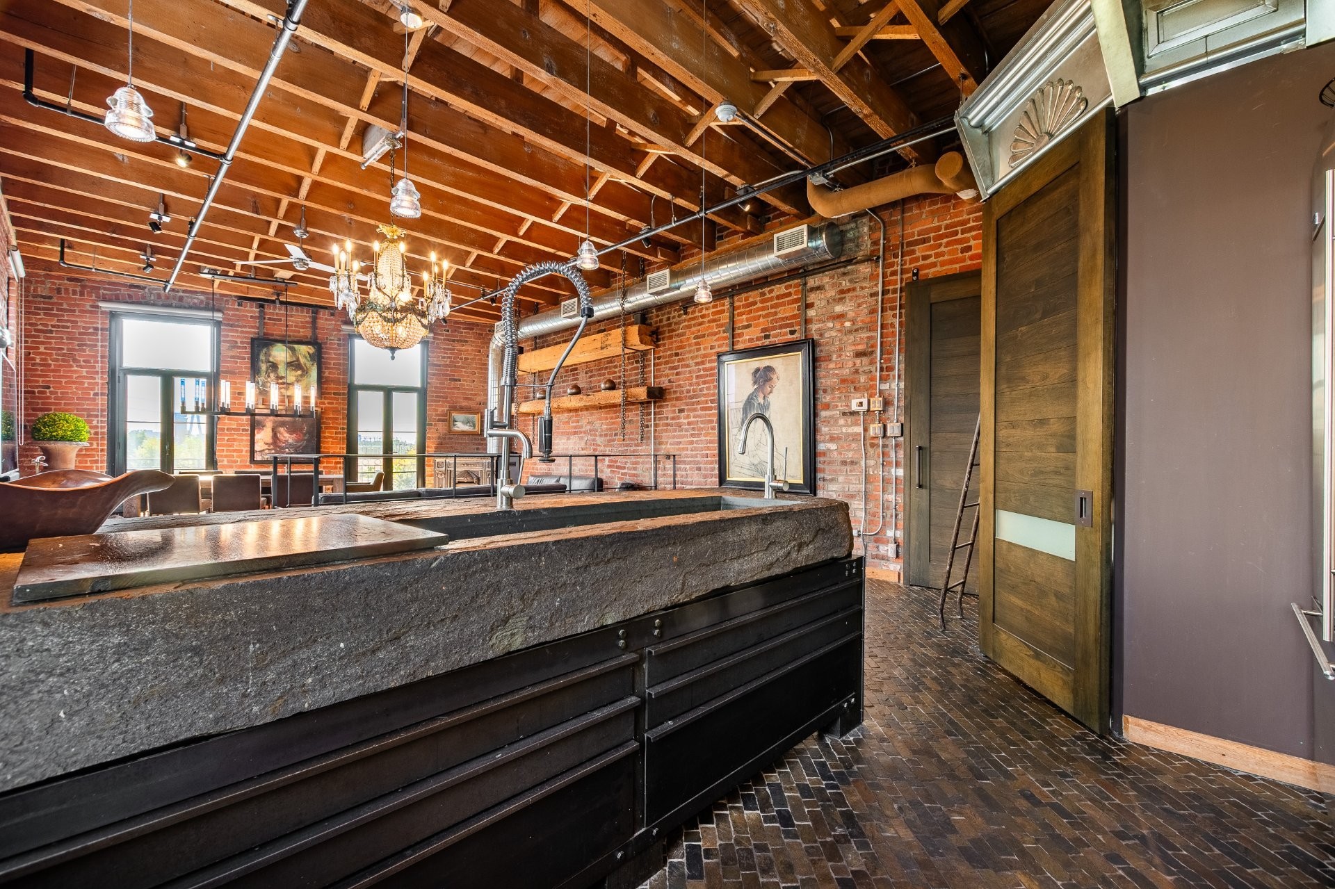 The space is a masterpiece of contrasts and craftsmanship. Soaring 14-foot ceilings, oversized windows, exposed brick, original sliding factory doors, wooden beams, and visible piping all nod to the building's industrial past--while tailor-made, high-end finishes add warmth and elegance throughout. Floors are a striking mix of exotic hardwood and natural slate, setting the tone for a home that's as rich in character as it is in comfort.