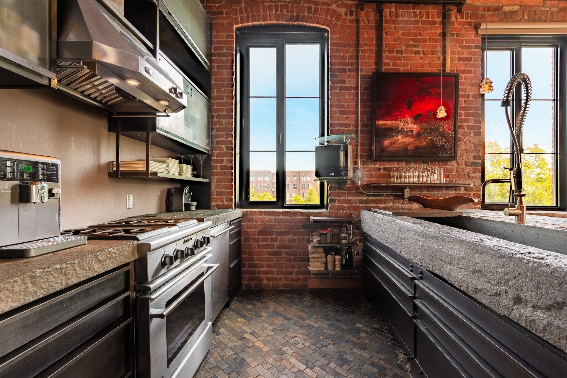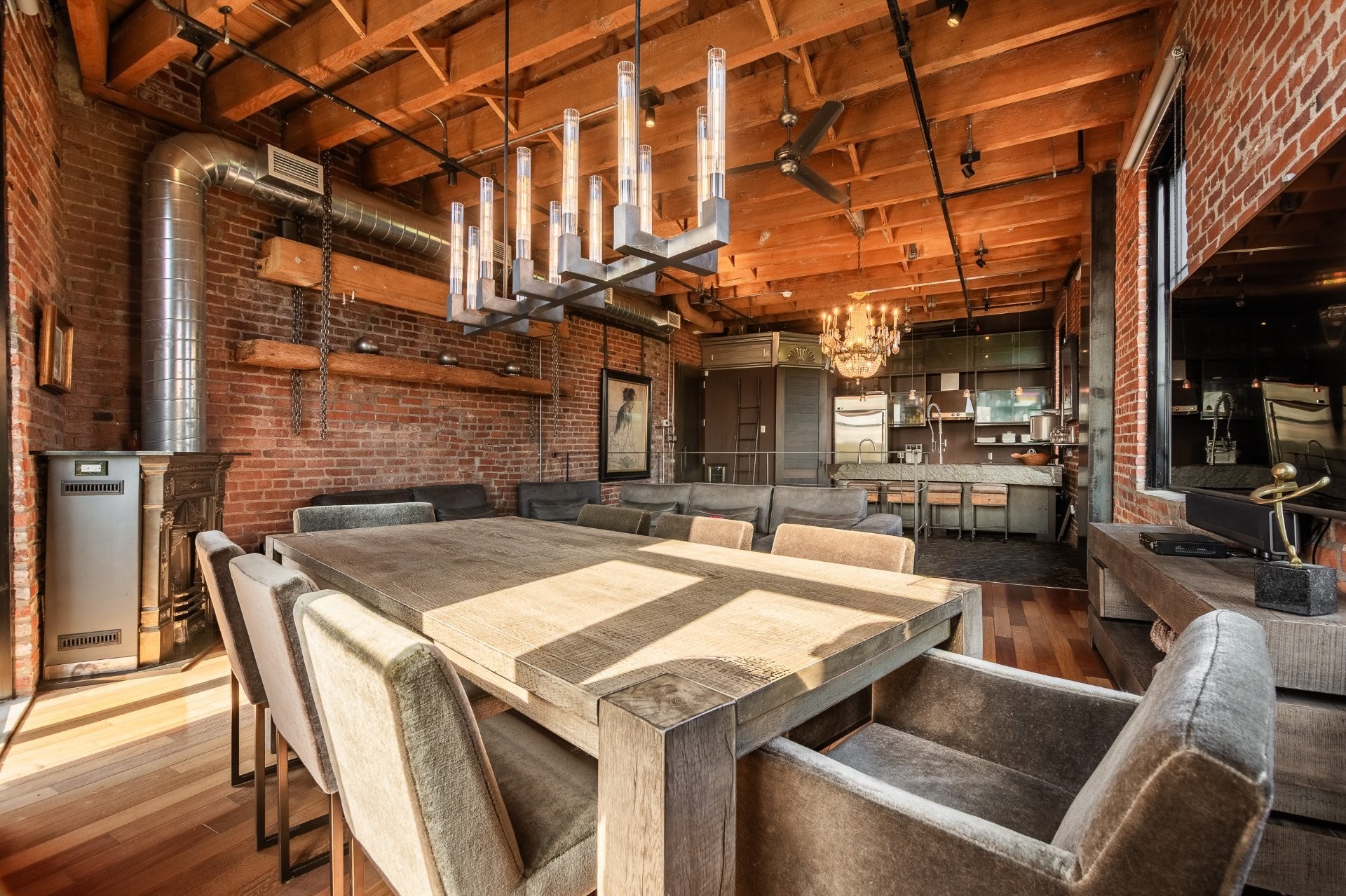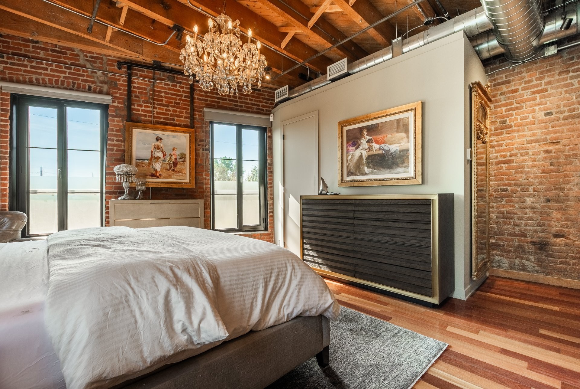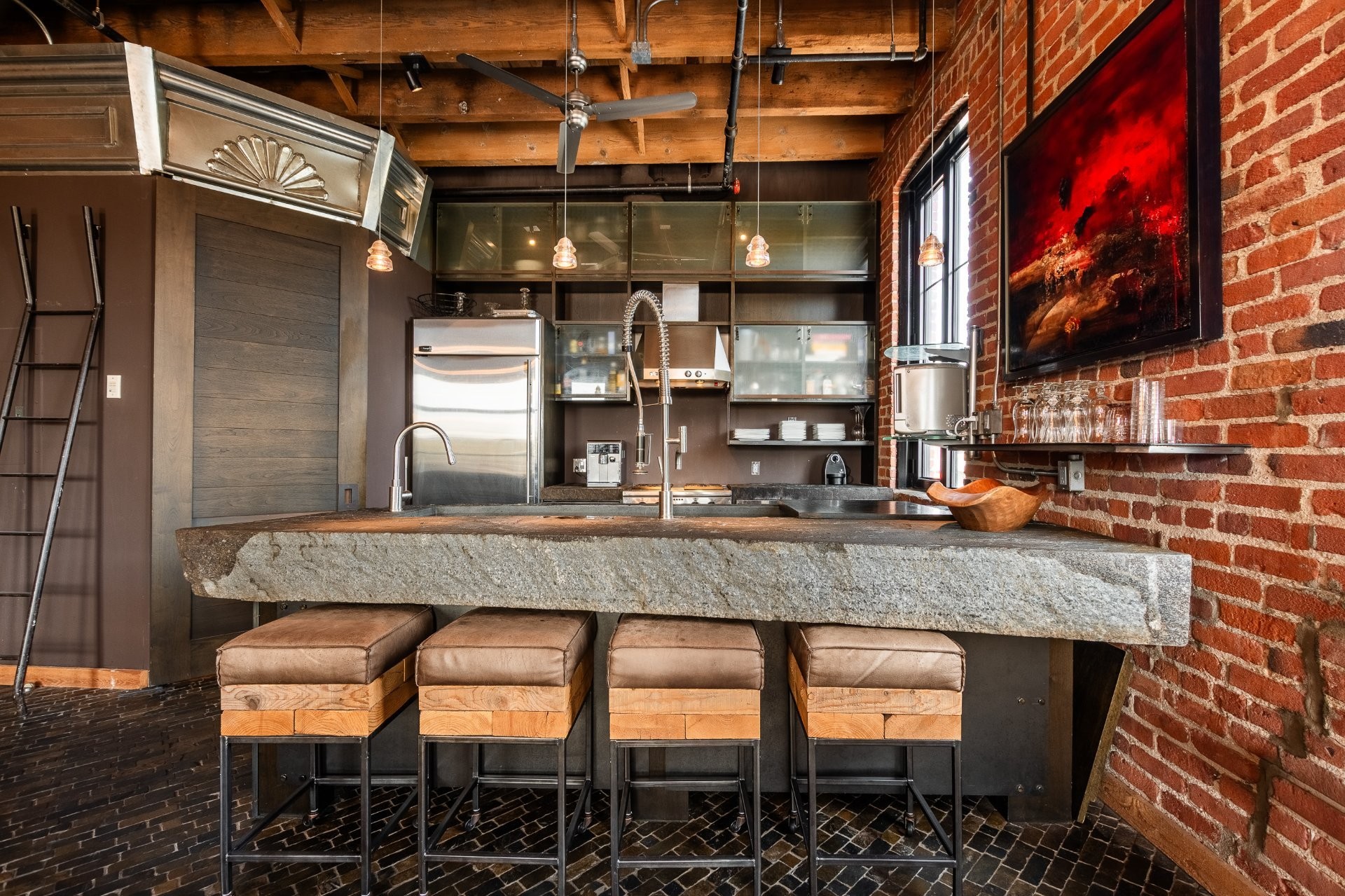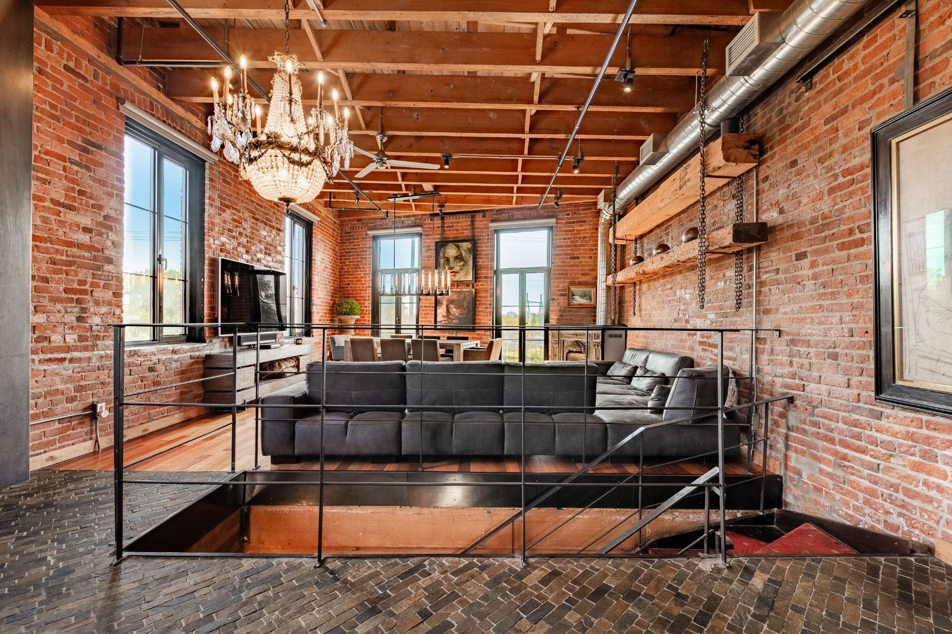 The space is a masterpiece of contrasts and craftsmanship. Soaring 14-foot ceilings, oversized windows, exposed brick, original sliding factory doors, wooden beams, and visible piping all nod to the building's industrial past--while tailor-made, high-end finishes add warmth and elegance throughout. Floors are a striking mix of exotic hardwood and natural slate, setting the tone for a home that's as rich in character as it is in comfort.