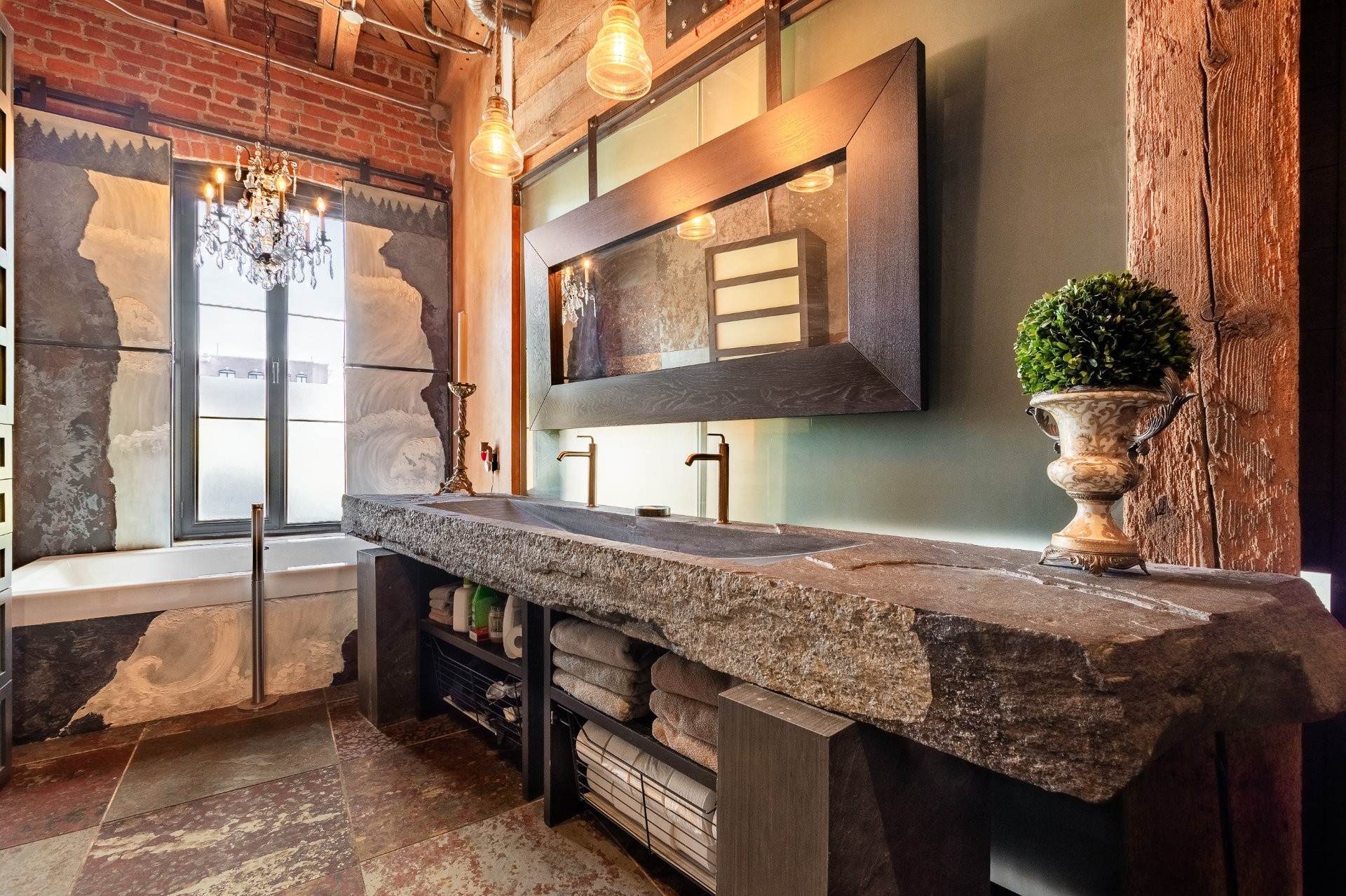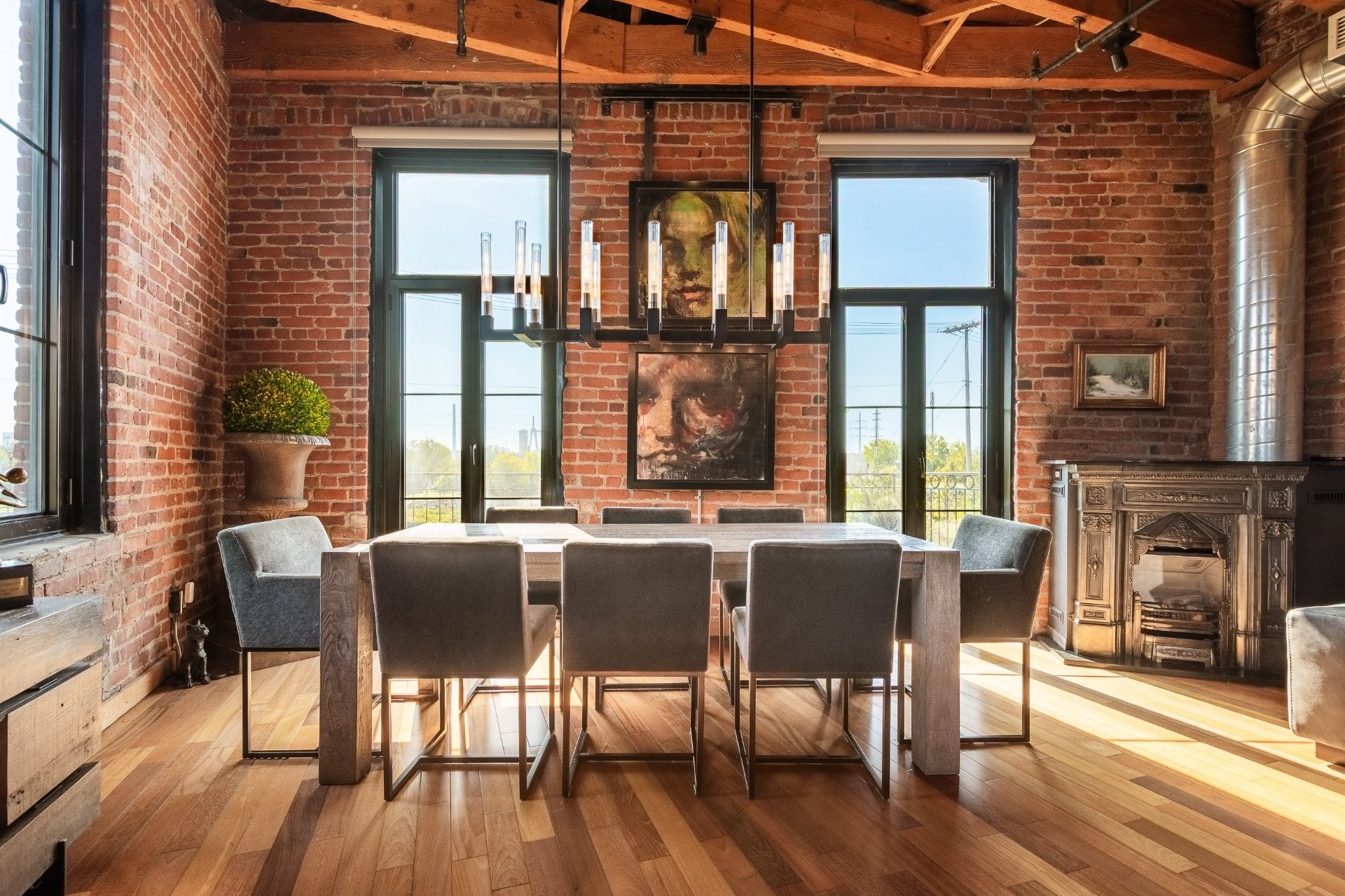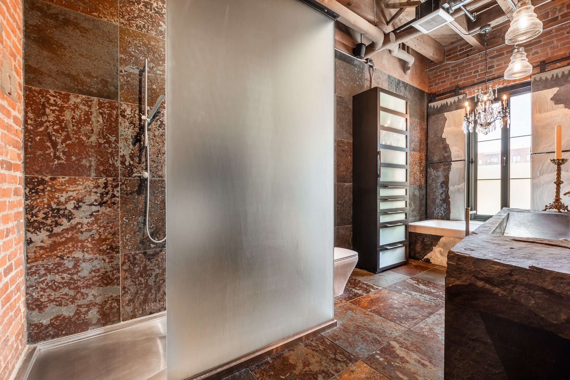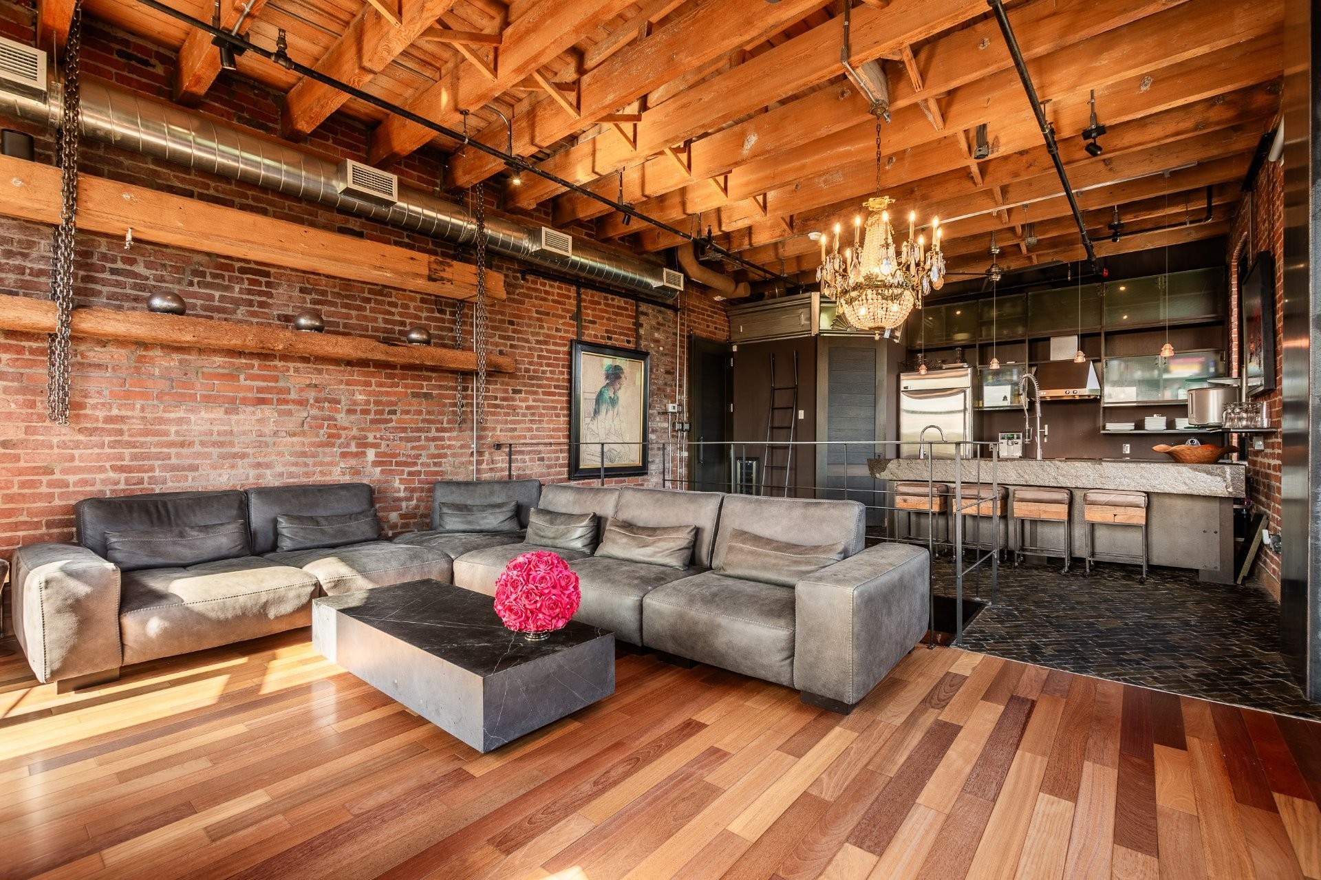 The space is a masterpiece of contrasts and craftsmanship. Soaring 14-foot ceilings, oversized windows, exposed brick, original sliding factory doors, wooden beams, and visible piping all nod to the building's industrial past--while tailor-made, high-end finishes add warmth and elegance throughout. Floors are a striking mix of exotic hardwood and natural slate, setting the tone for a home that's as rich in character as it is in comfort.