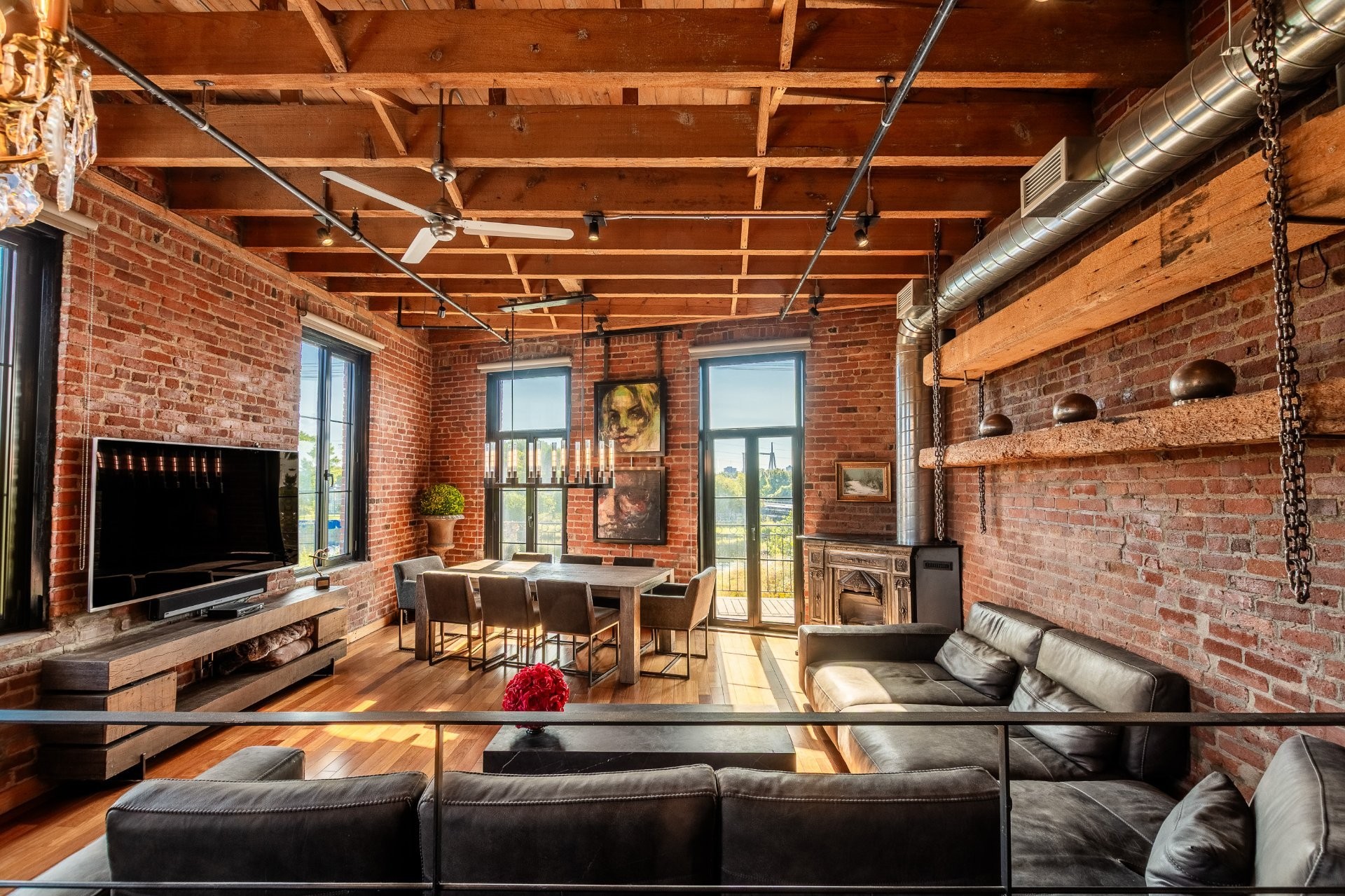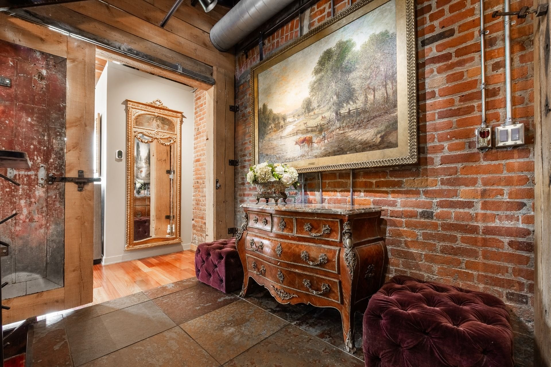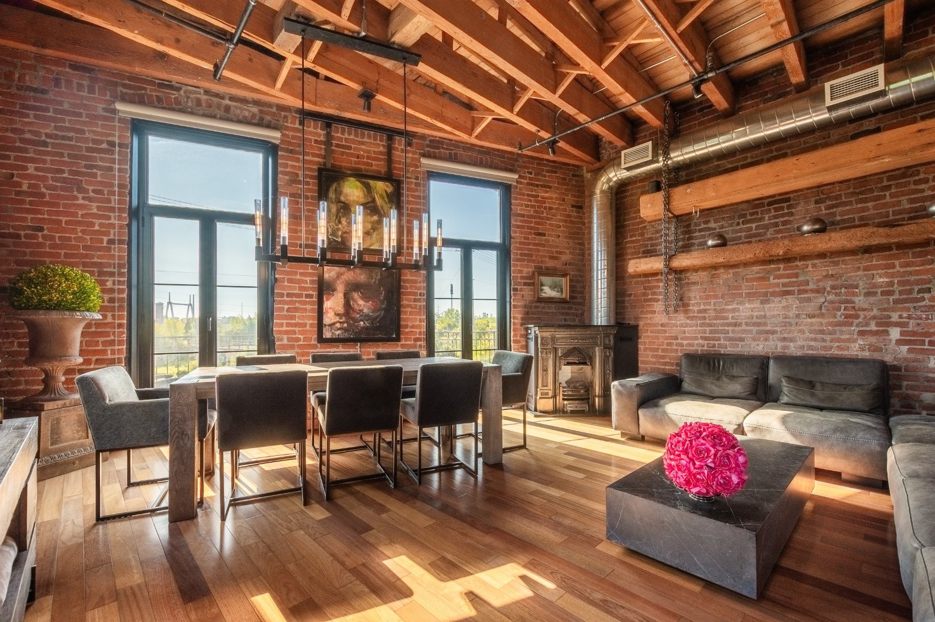 A hidden gem in Clos St-Ambroise! This stunning 2-level condo in a restored St-Henri tannery blends industrial charm with luxury finishes. Featuring 14-ft ceilings, exposed brick, original sliding doors, wood beams, and huge windows with water + city views. High-end materials throughout: exotic wood + slate floors, carved stone counters and sinks. Private entrance, spacious layout, open-concept living, and direct garage access with 2 parking spots. Steps from Atwater Market + Lachine Canal. Stylish, bright, and truly one of a kind!