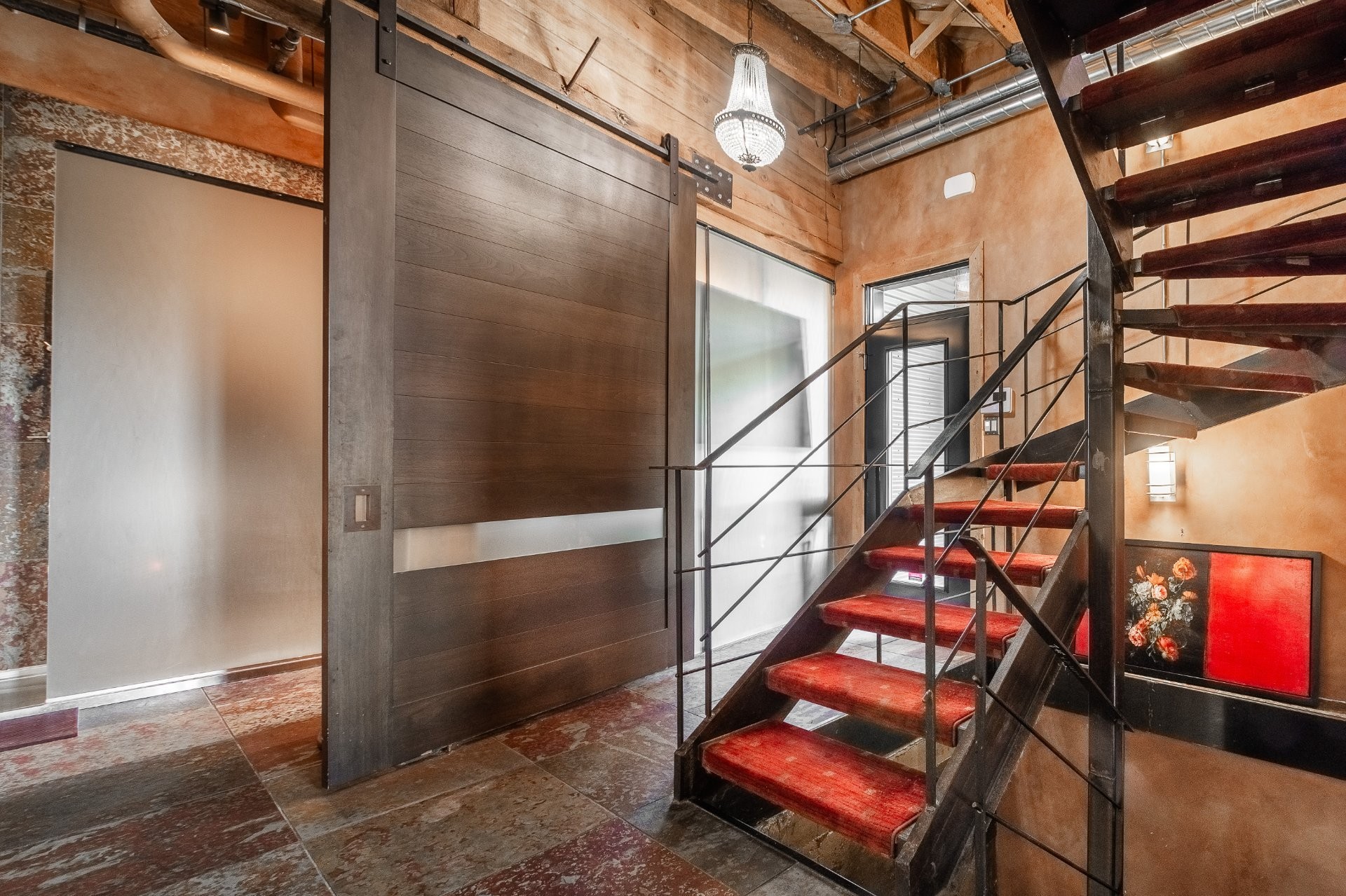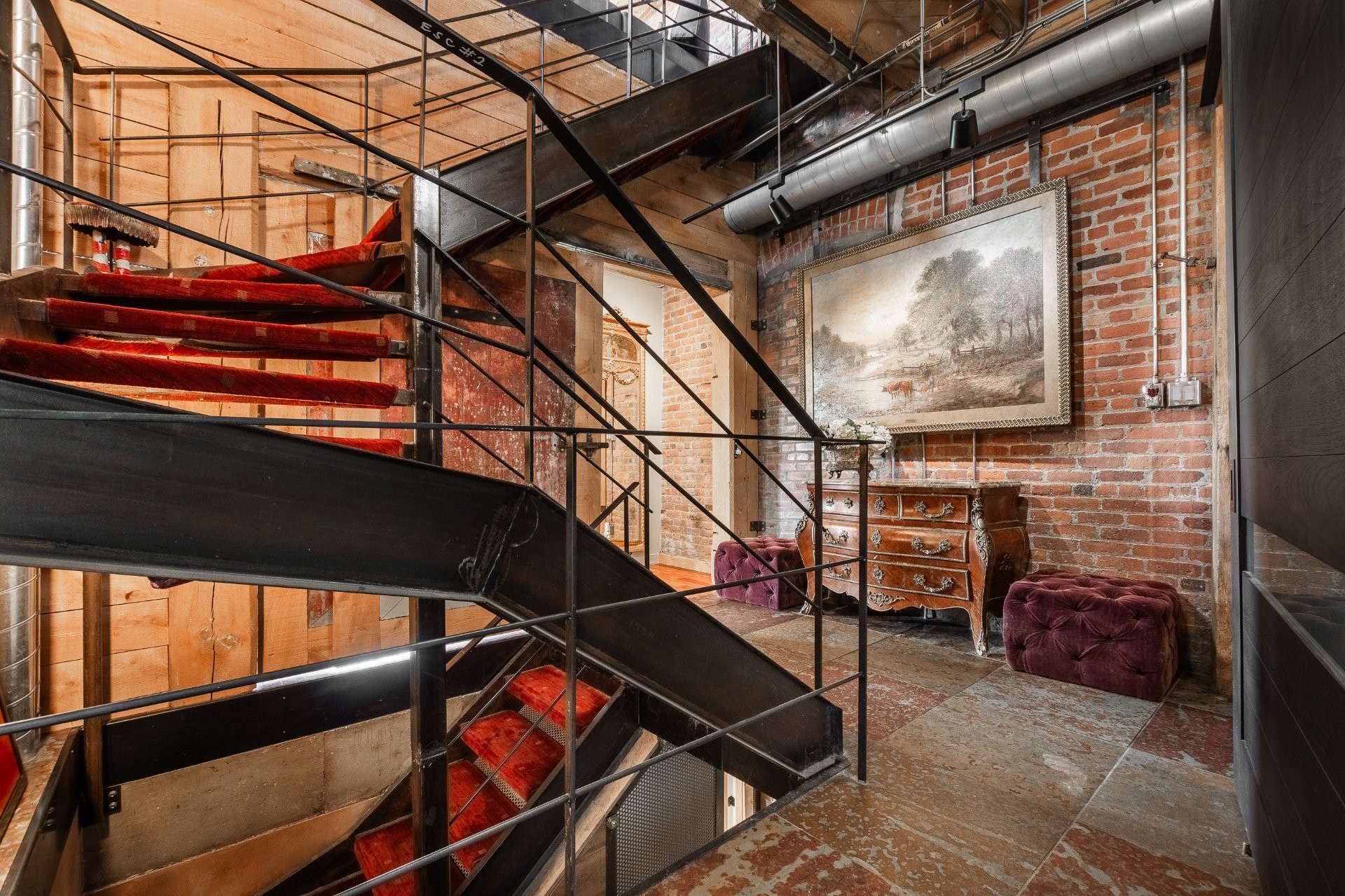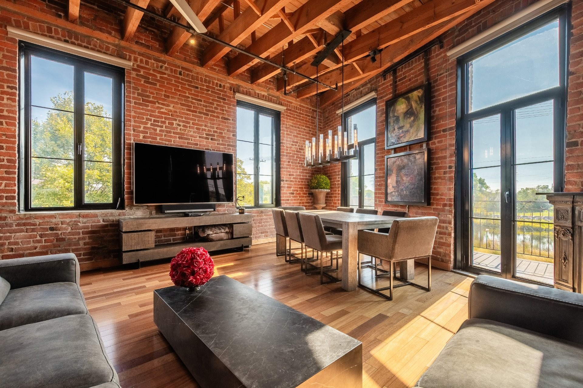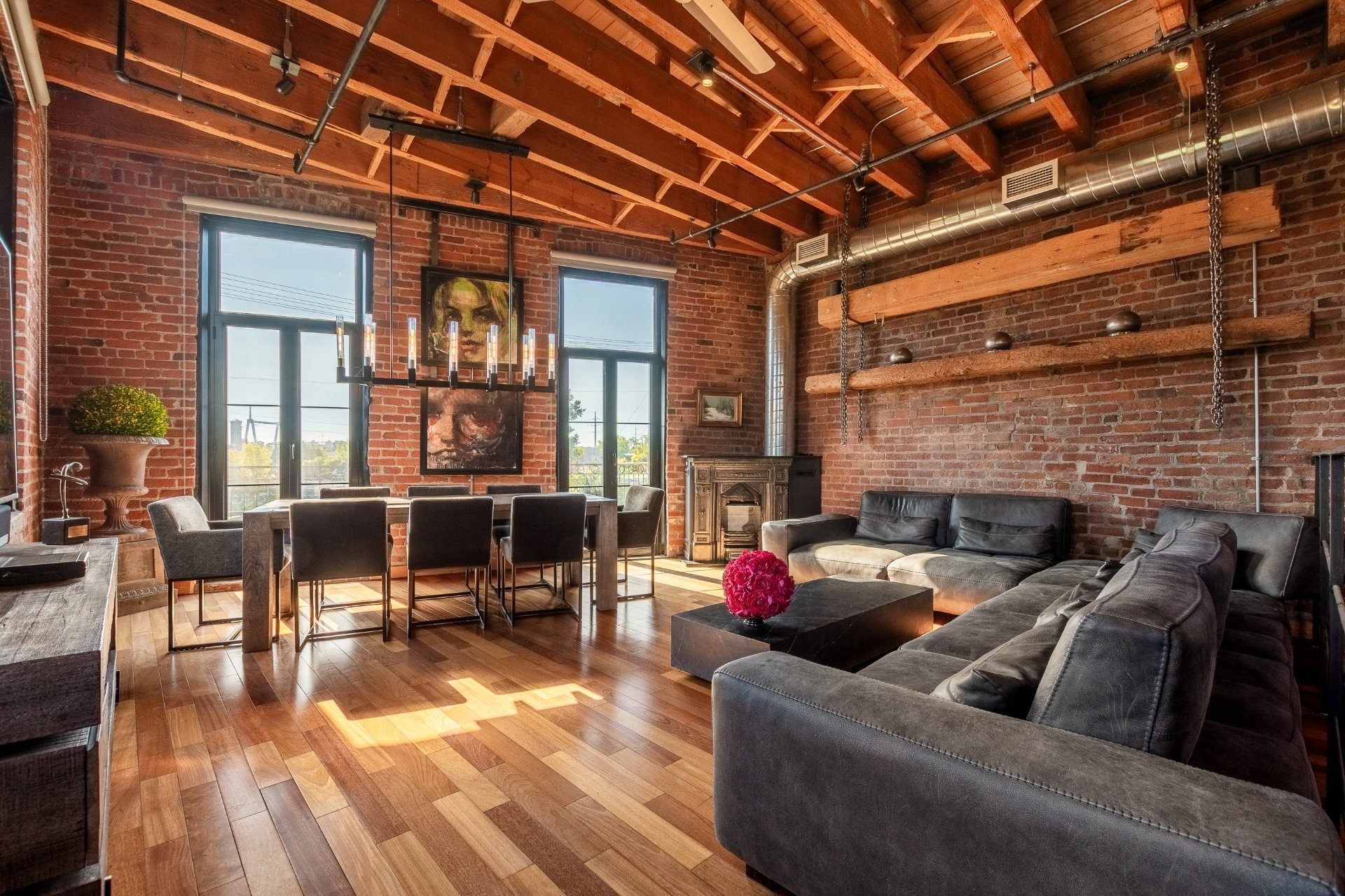 A hidden gem in Clos St-Ambroise! This stunning 2-level condo in a restored St-Henri tannery blends industrial charm with luxury finishes. Featuring 14-ft ceilings, exposed brick, original sliding doors, wood beams, and huge windows with water + city views. High-end materials throughout: exotic wood + slate floors, carved stone counters and sinks. Private entrance, spacious layout, open-concept living, and direct garage access with 2 parking spots. Steps from Atwater Market + Lachine Canal. Stylish, bright, and truly one of a kind!