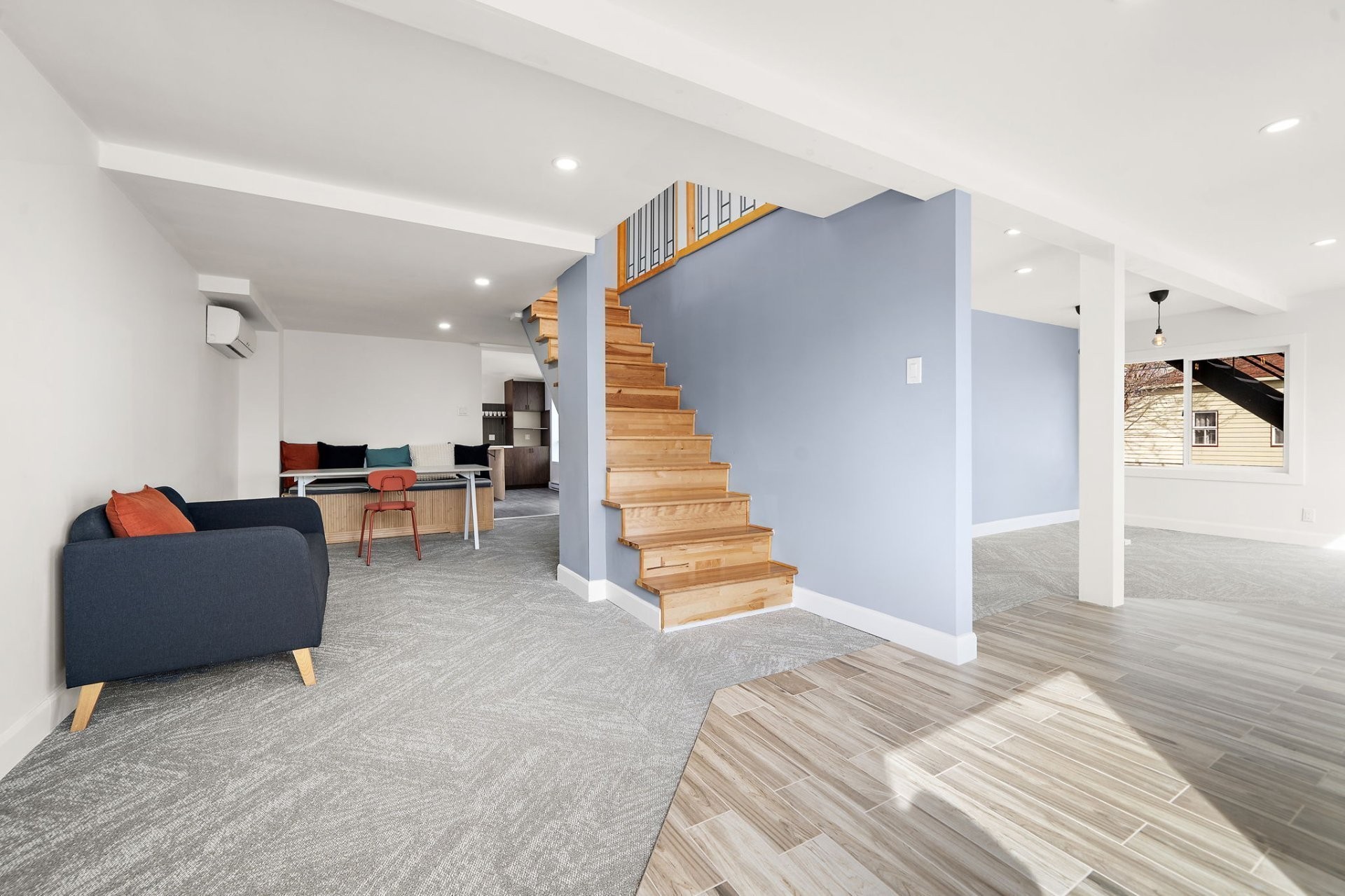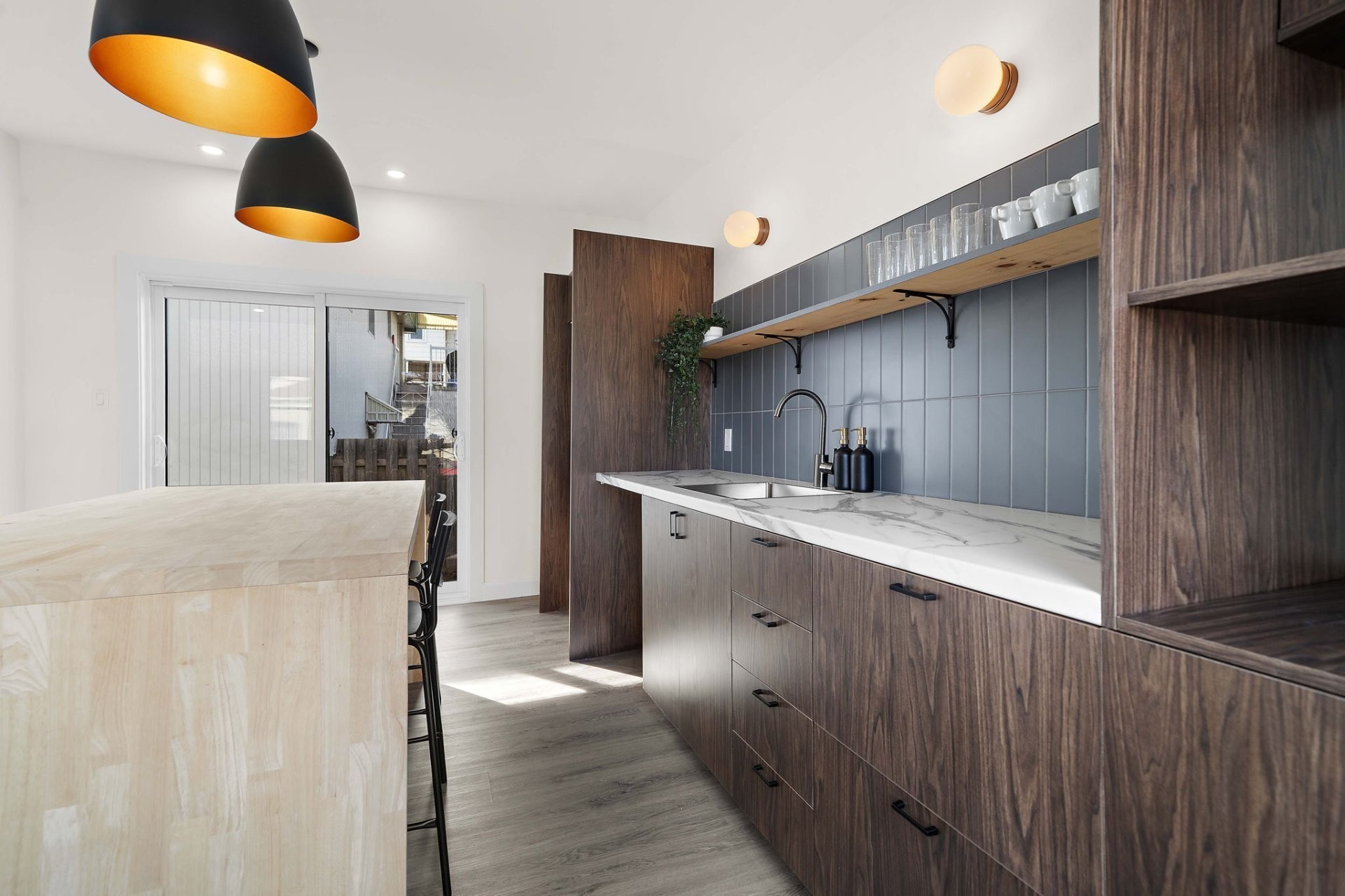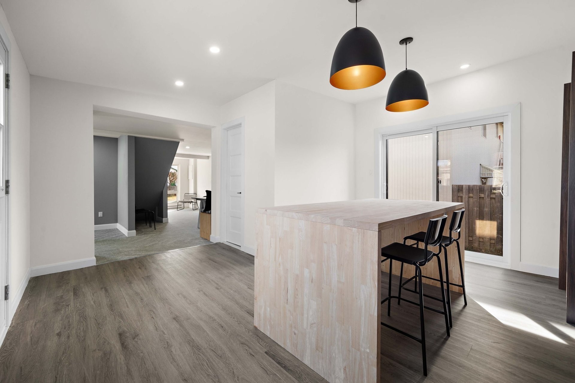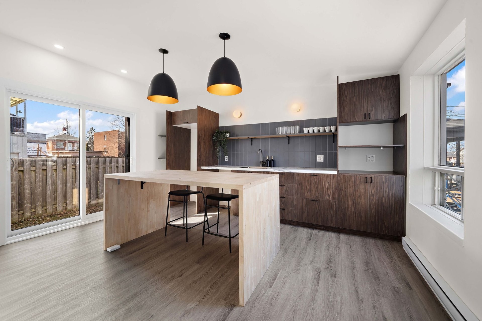 Wall-mounted heat pump, light fixtures, movable island