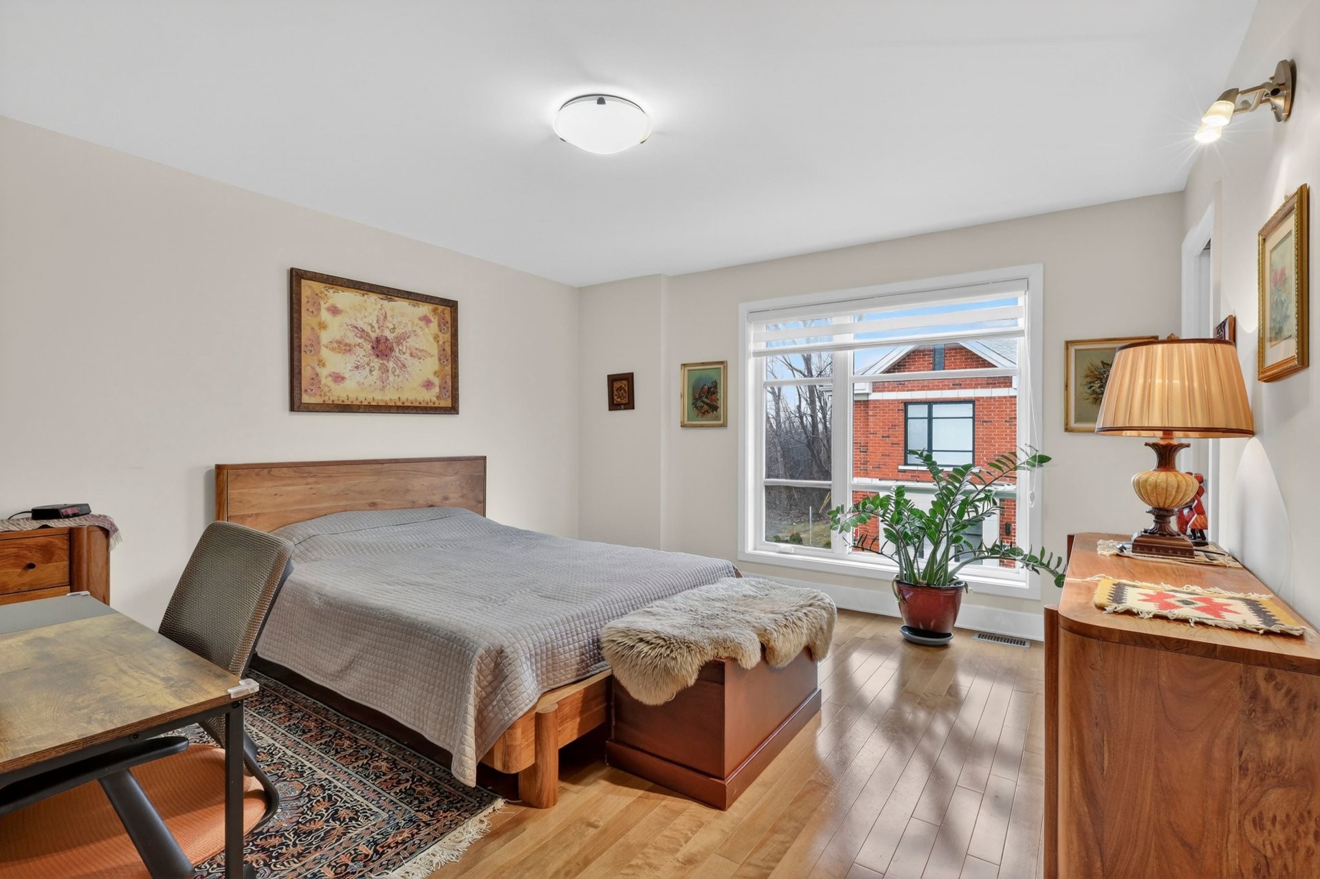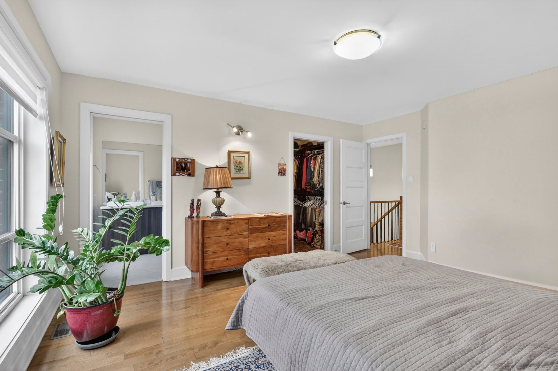 Spacious primary bedroom with ensuite bathroom and walk-in closet. Two additional well-sized bedrooms and a full family bathroom with separate shower and soaker tub. Hardwood floors throughout.