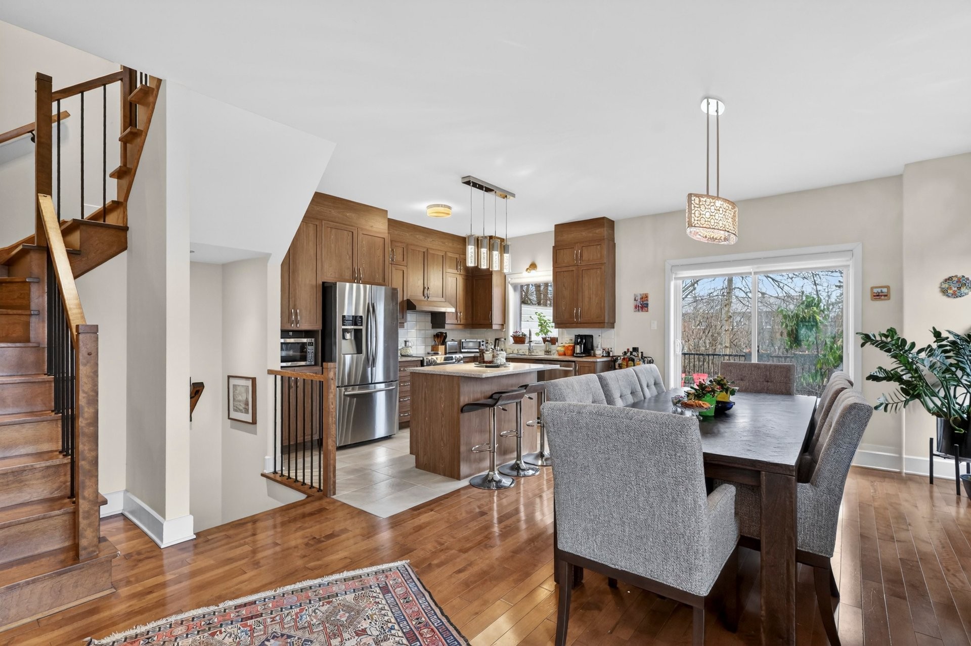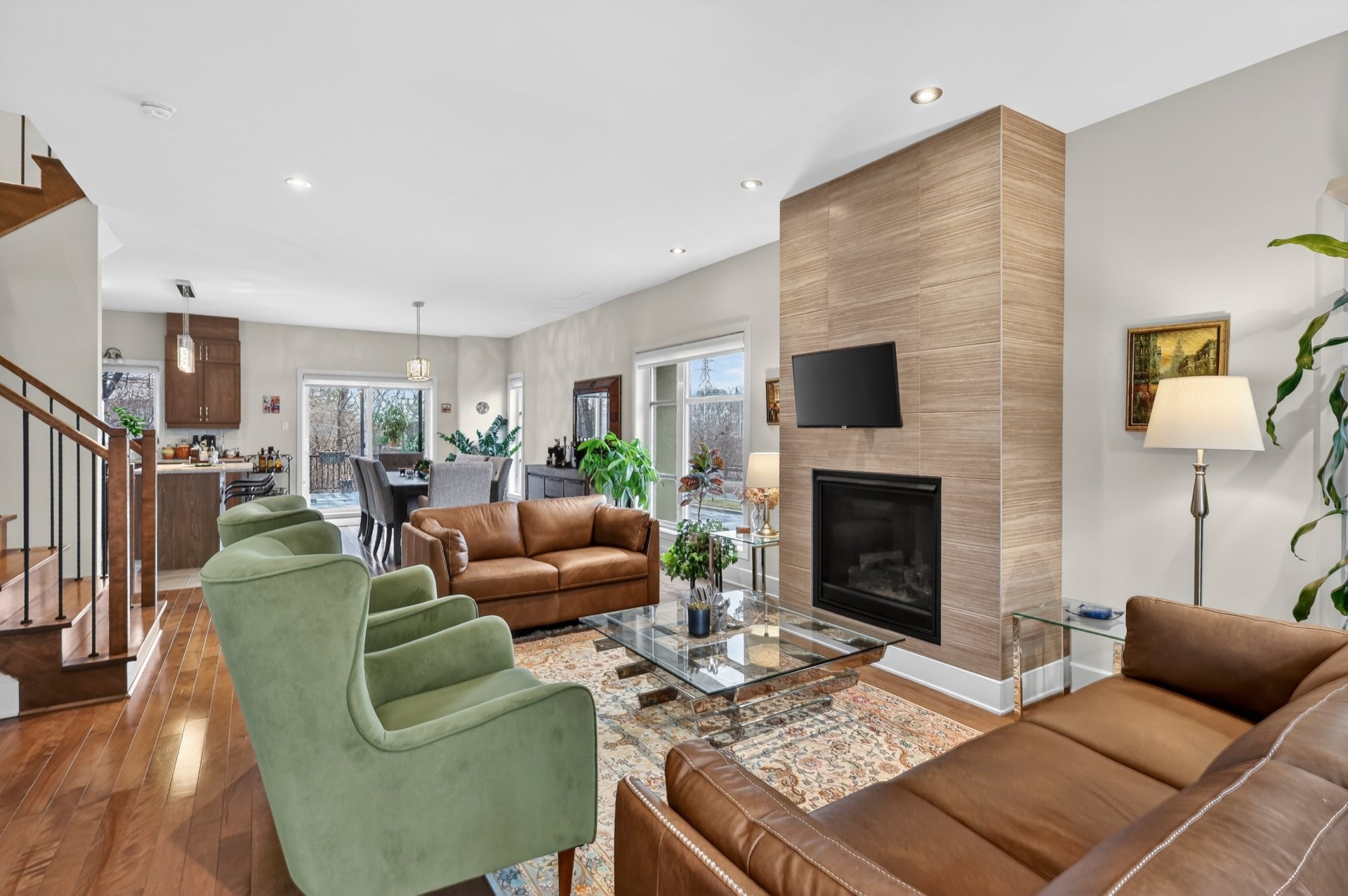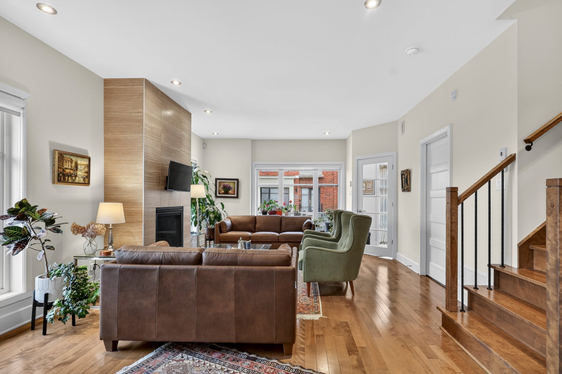 The main floor offers a bright open-concept layout combining the kitchen, dining, and living areas, highlighted by a cozy natural gas fireplace. Features include hardwood floors, 9-foot ceilings, quartz countertops, and custom zebra blinds. The modern kitchen opens onto a large private terrace via patio doors. A powder room with laundry completes this level.