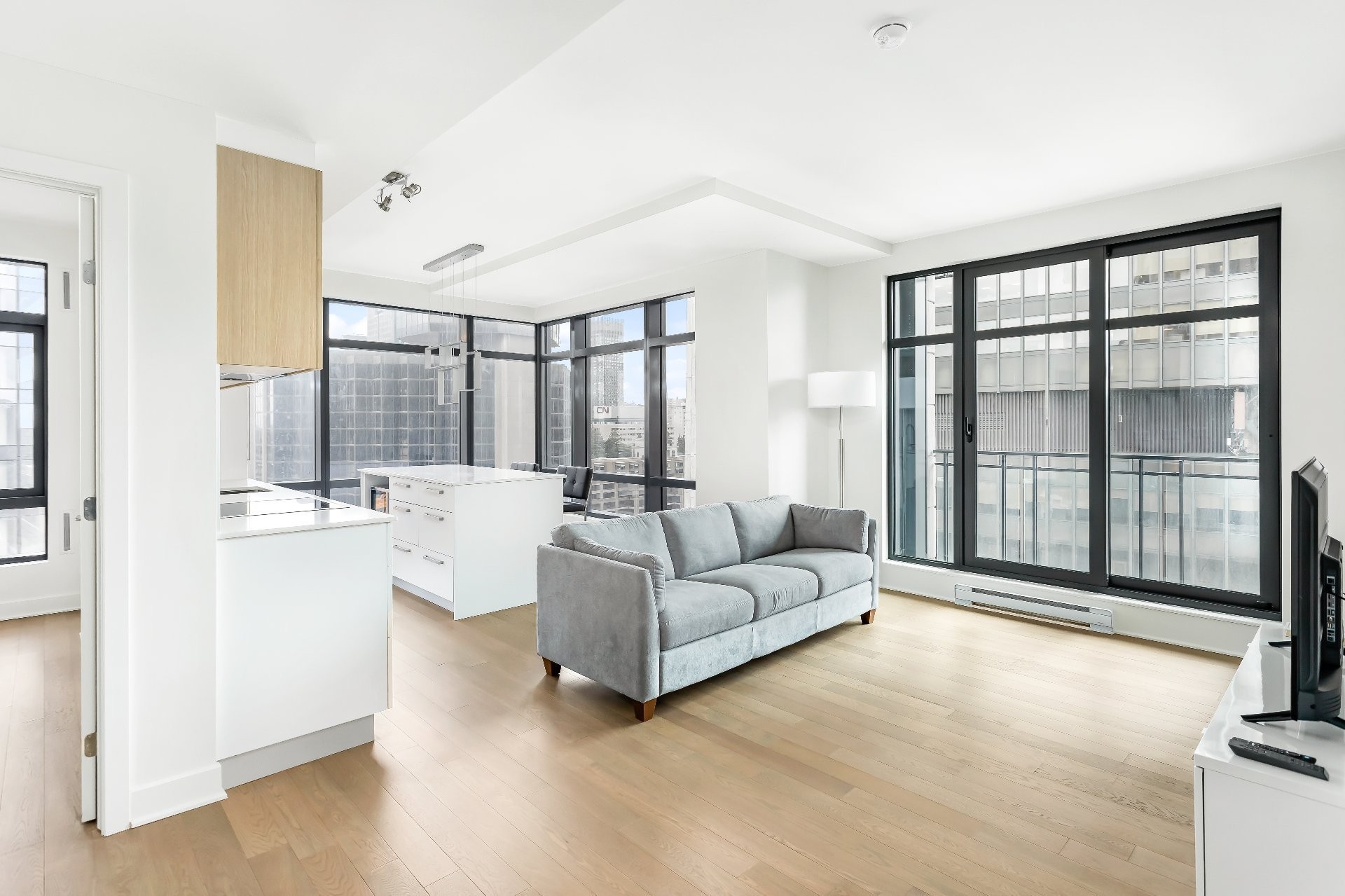 Unité de coin partiellement meublé moderne au YUL avec 2 chambres, 1 salle de bain et espace lumineux à aire ouverte. Fenêtres pleine hauteu...