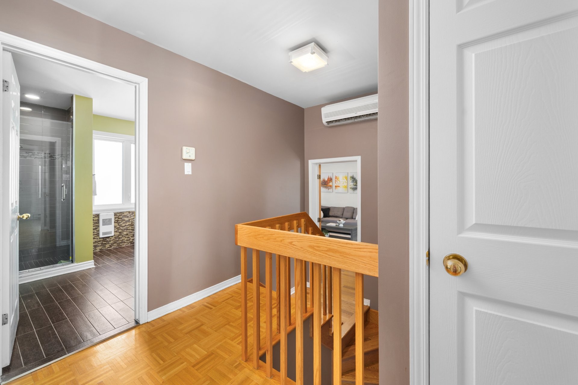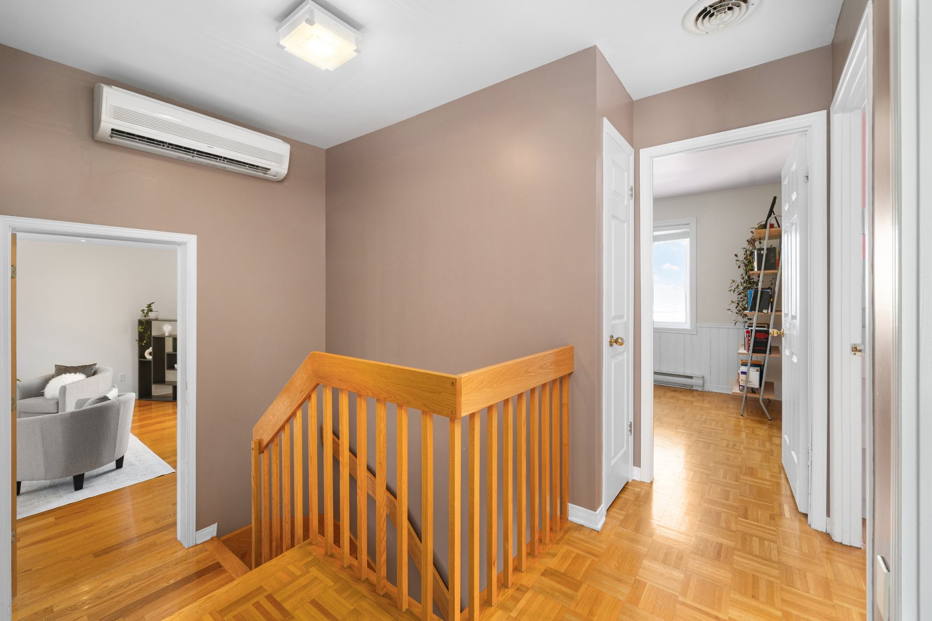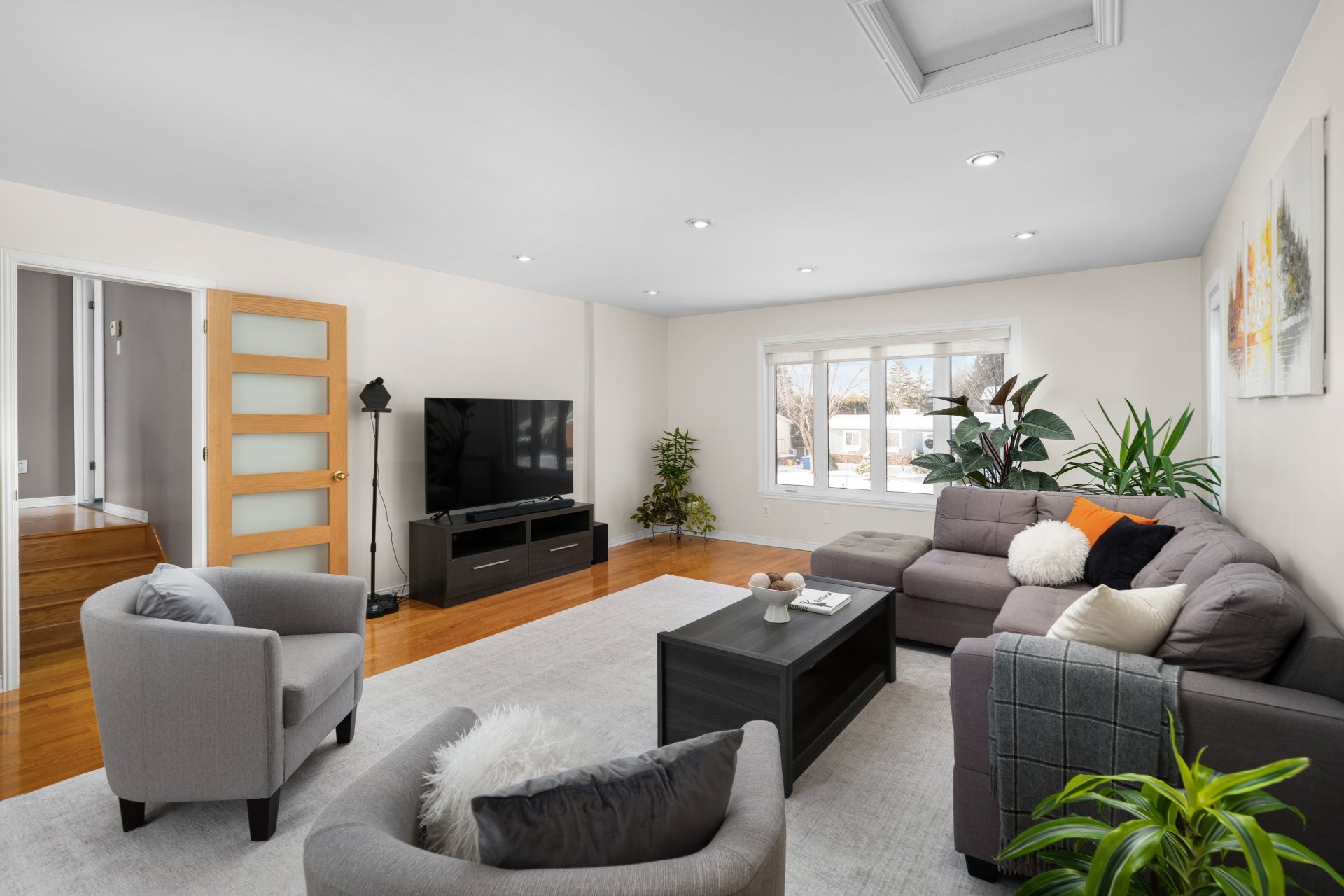 Raised family room of generous size, ideal as a family room, media space, or home office, creating a natural separation between living areas and bedrooms while remaining connected.
