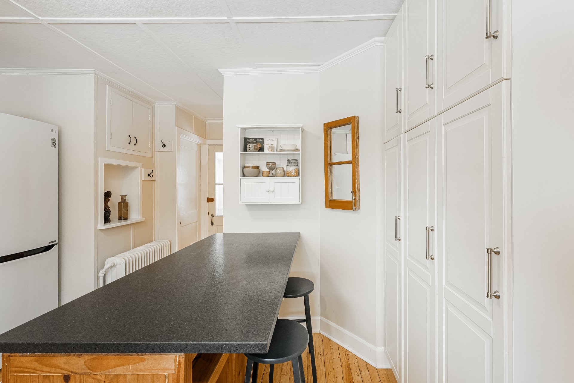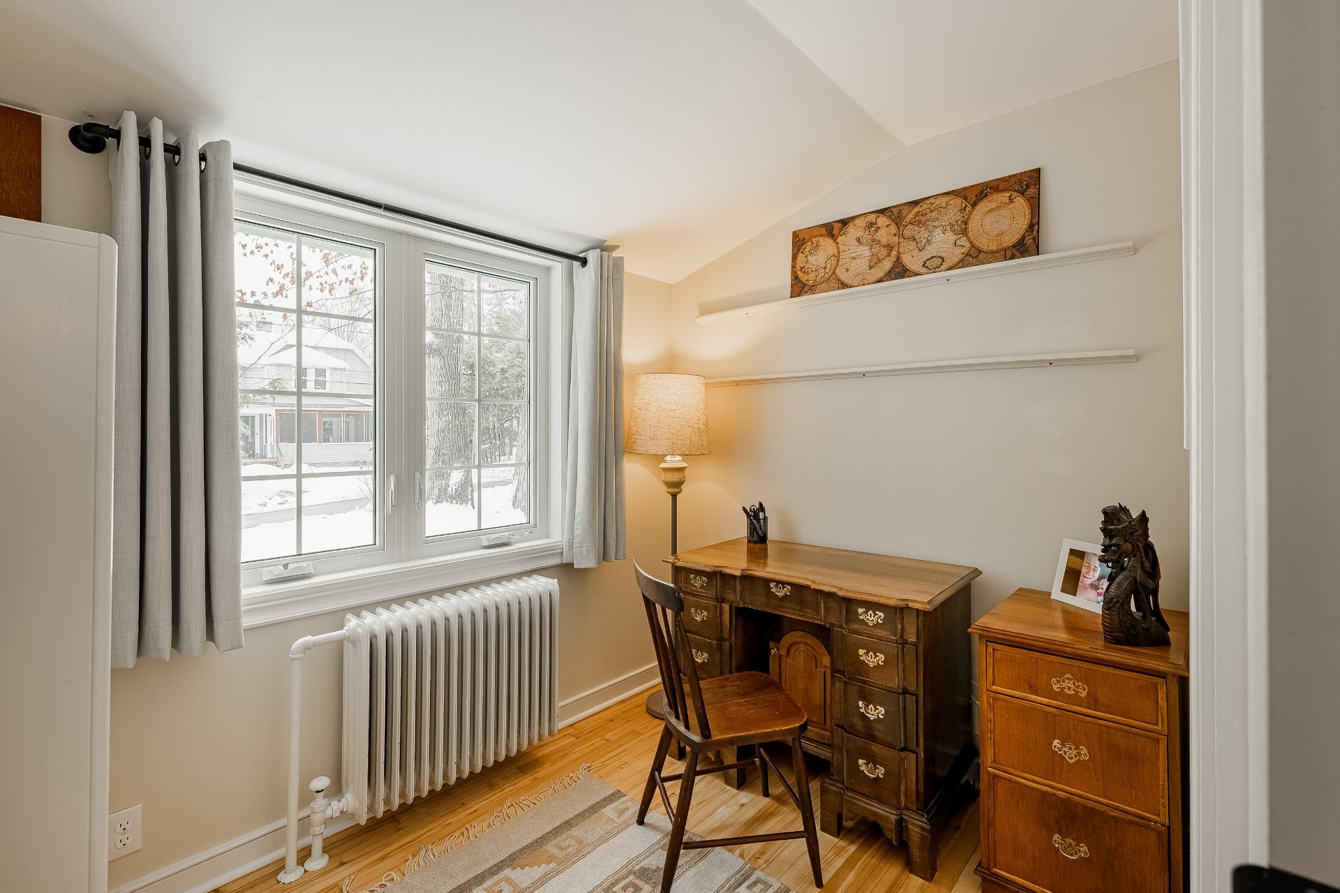 Charming updated bungalow in the heart of the village. This inviting home features one bedroom plus a flexible office ideal for a nursery. Wood floors run throughout, adding warmth and character. The home includes a renovated full bathroom and a convenient powder room. New windows provide excellent natural light and energy efficiency. A private fenced yard and detached garage complete this move-in-ready property, offering comfort, functionality, and easy village living.
