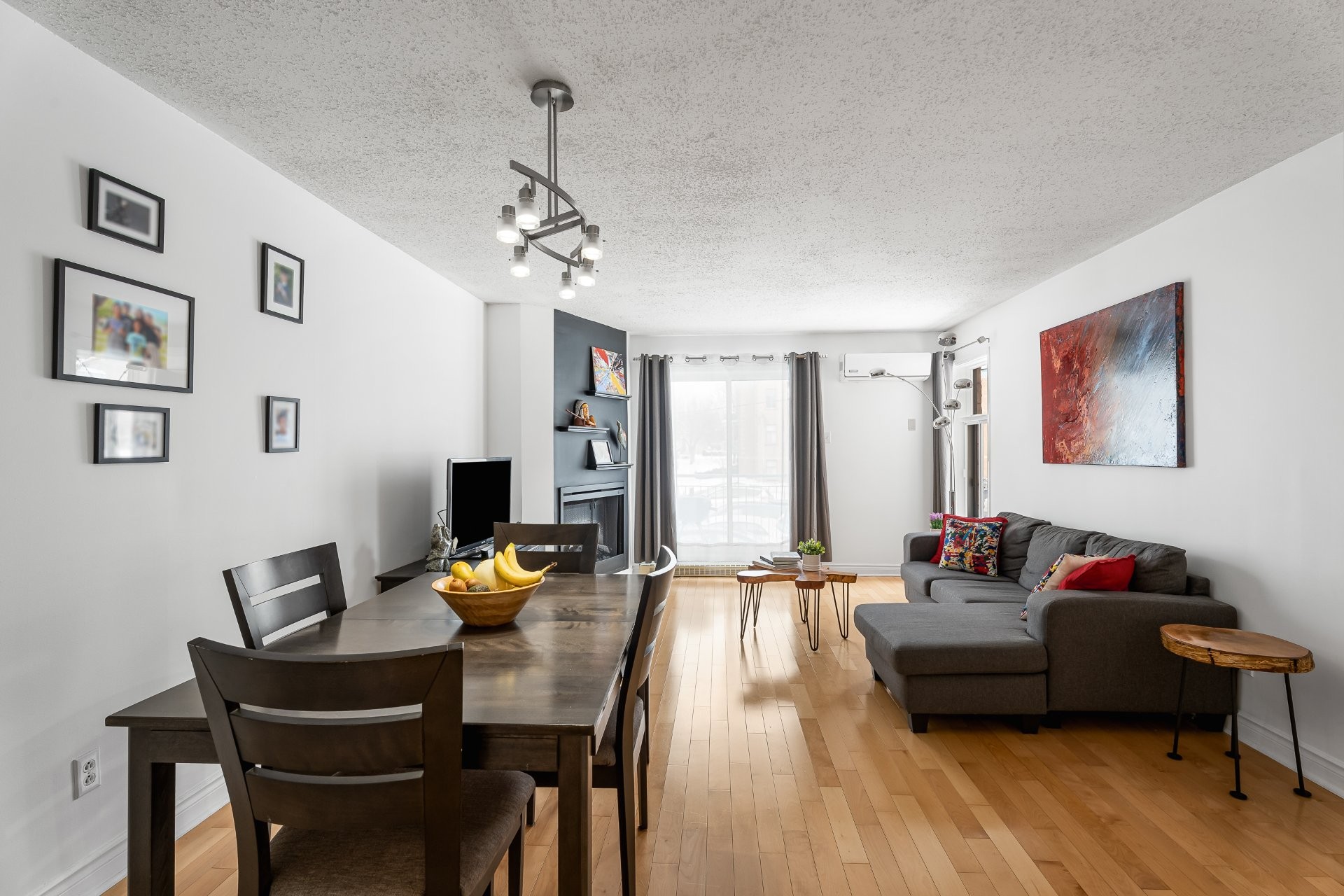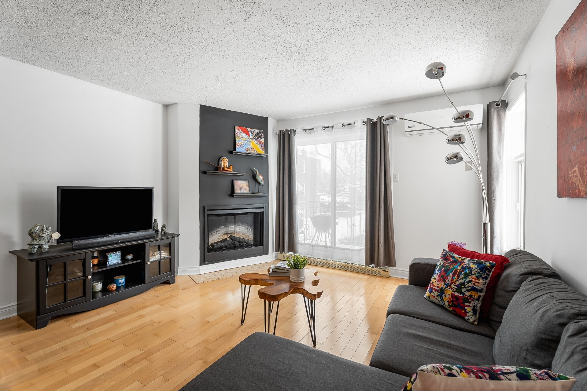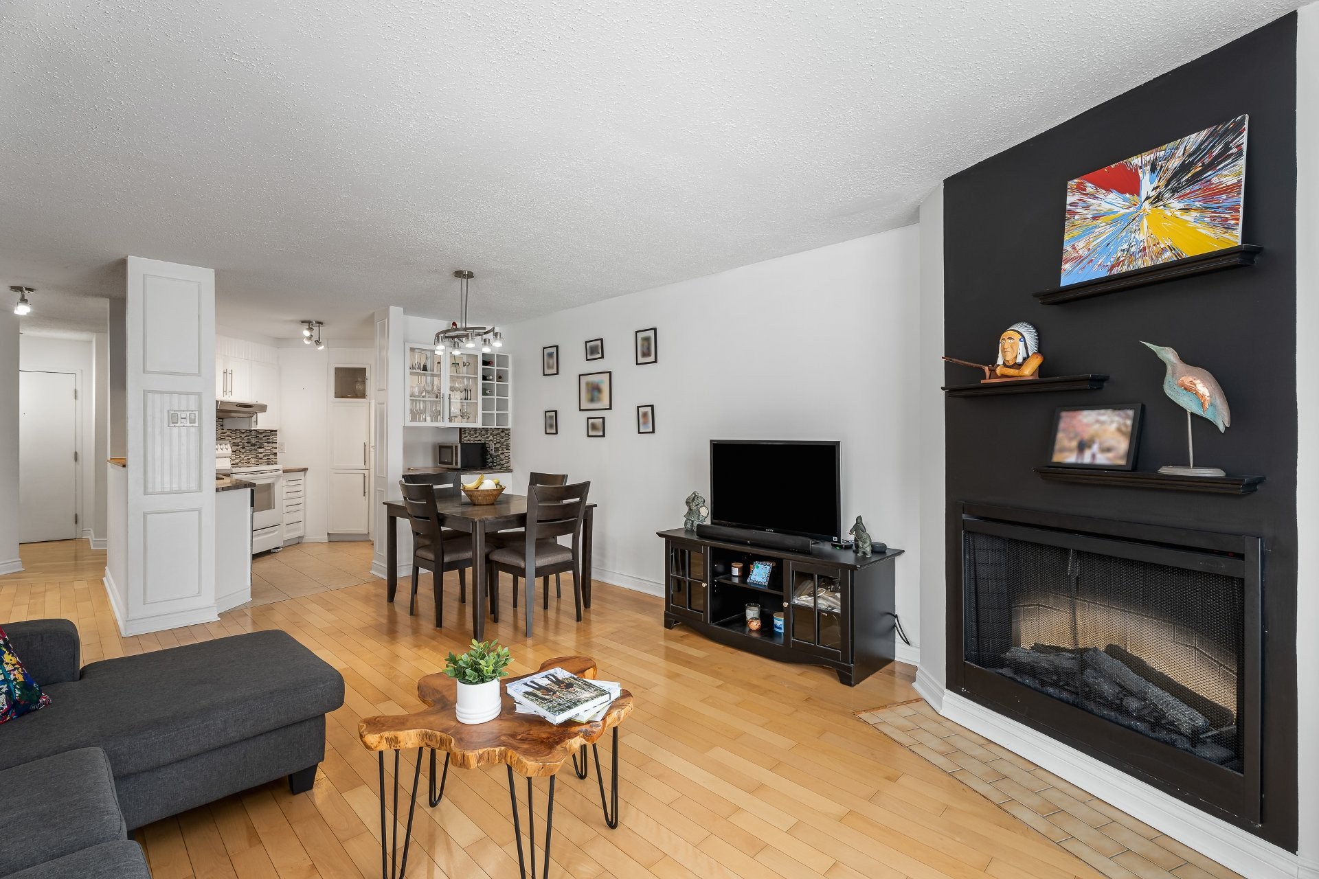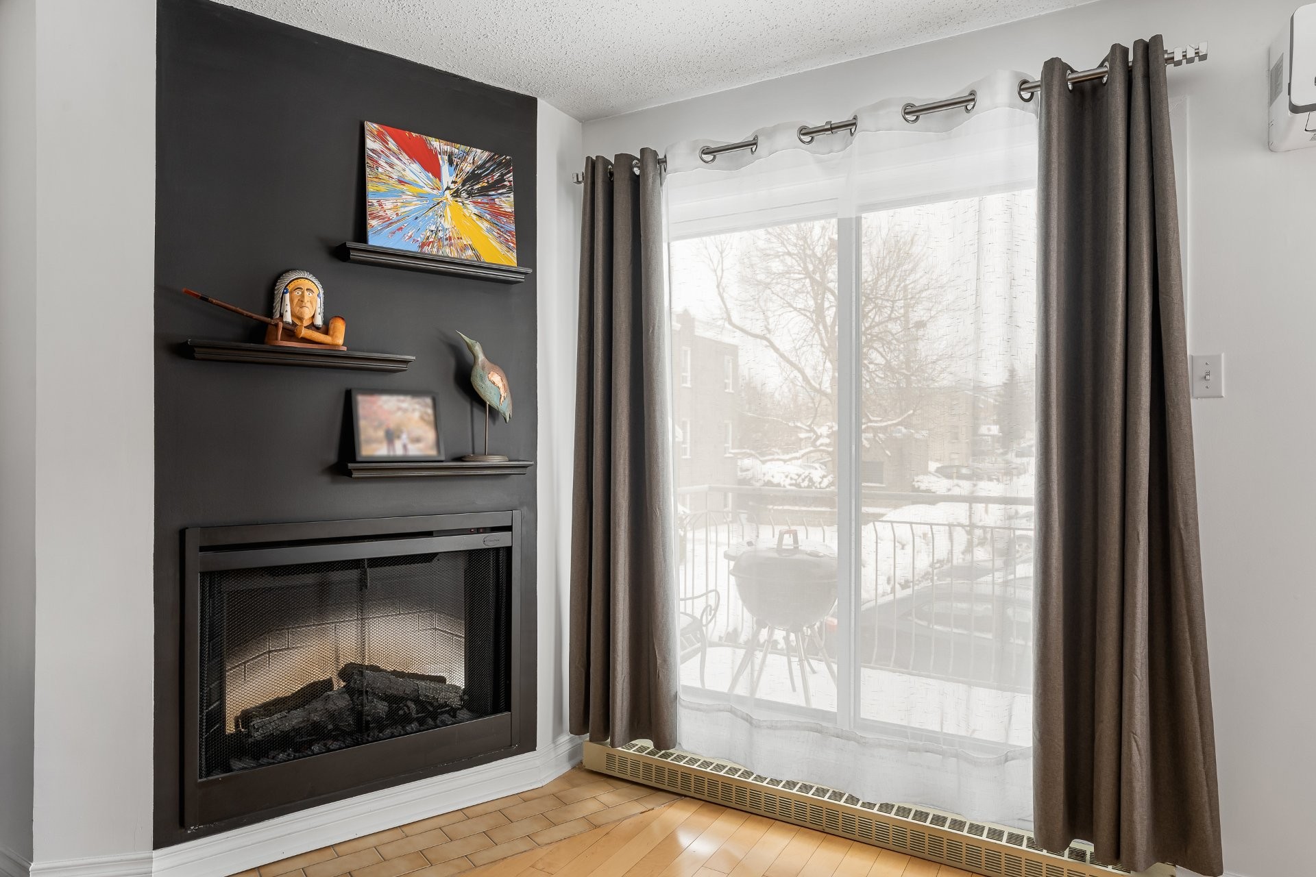 Modern electric fireplace in the living room, creating a warm and inviting atmosphere.
