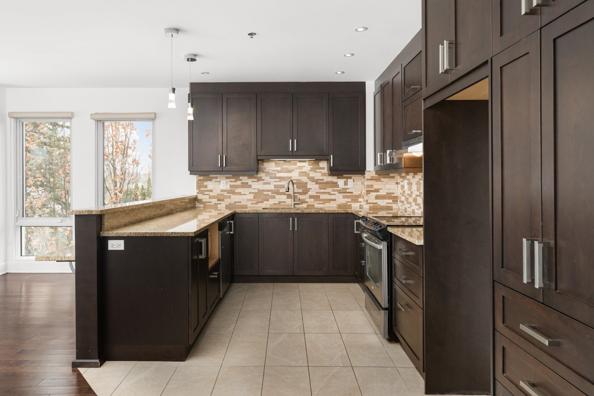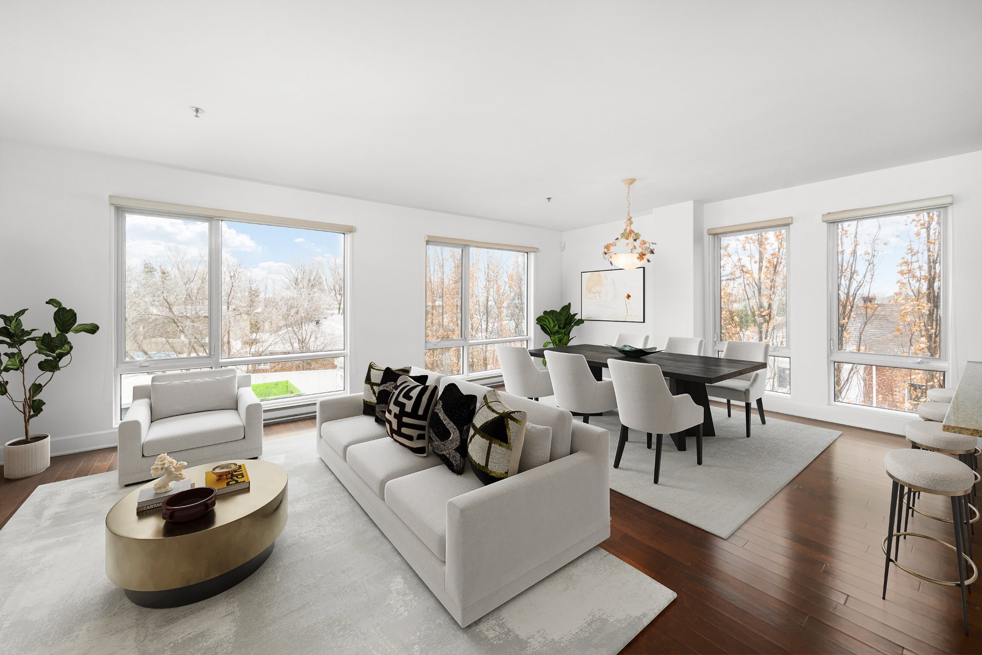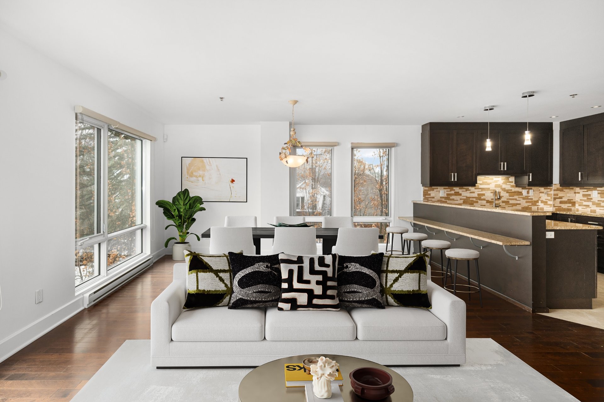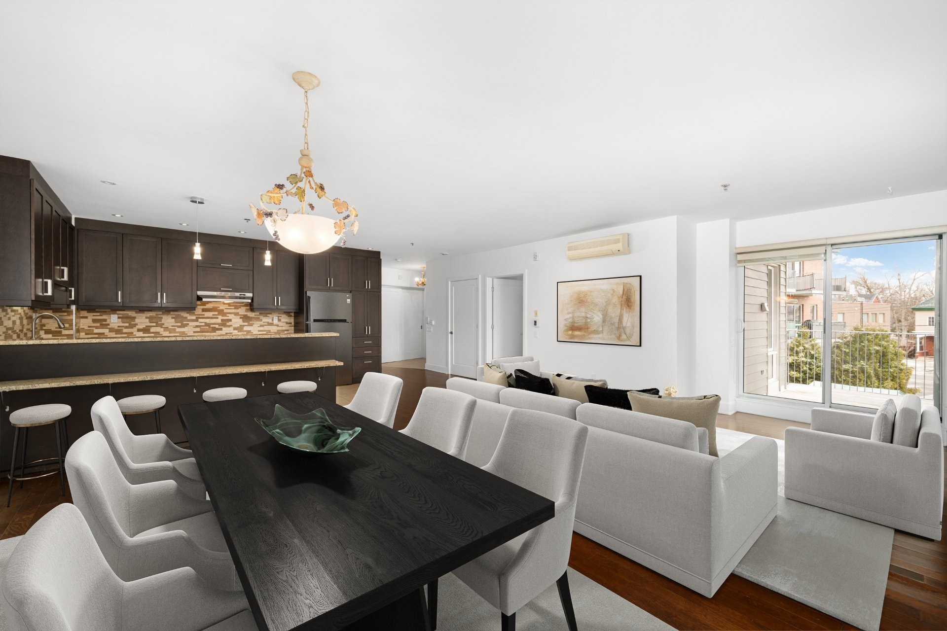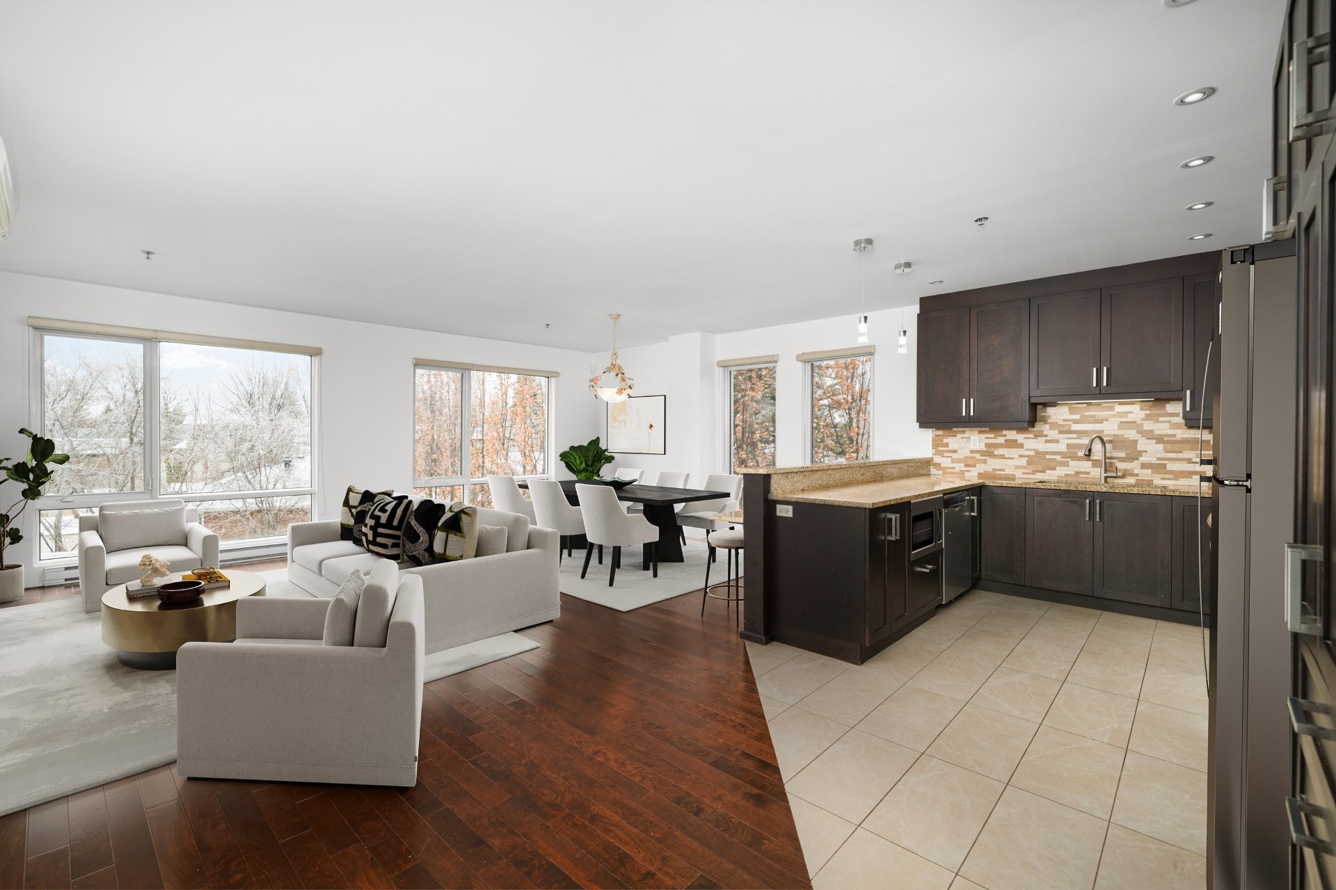 Stunning corner unit located in the heart of Dorval Village, offering over 1,350 sq.ft. of bright and thoughtfully designed living space. Benefiting from abundant natural light throughout the day, this unit also features two private balconies, perfect for enjoying the outdoors. Designed with both quality and comfort in mind, the condo offers a well-planned layout with generous living areas. The spacious kitchen provides ample storage with full-height cabinetry and opens onto a bright and inviting living and dining area, ideal for everyday living and entertaining. This is a condo that truly does not compromise on space. The primary bedroom features a large walk-in closet, while the unit also includes a spacious bathroom with a walk-in Italian-style shower, along with well-proportioned secondary bedroom and bathroom. Two indoor garage spaces and two storage lockers complete this exceptional property. The building also features a heated garage ramp.