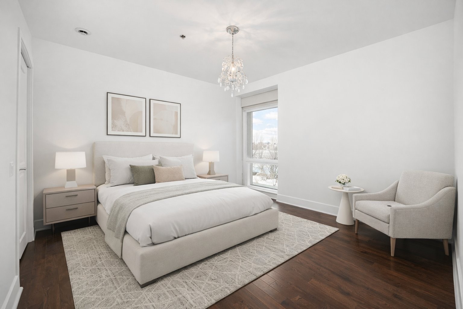 Bright corner unit in the heart of Dorval Village featuring 2 bedrooms and 2 bathrooms, offering over 1,350 sq.ft. of well-designed living space. This spacious condo boasts abundant natural light, a functional layout, a large kitchen with ample storage, and two private balconies. The primary bedroom includes a walk-in closet, and the unit offers generous living areas without compromising on space. Two indoor garage spaces and two storage lockers are included. Ideally located in a sought-after area of Dorval, just steps from the waterfront, parks, shops, public transit, and with easy access to highways and downtown Montréal.