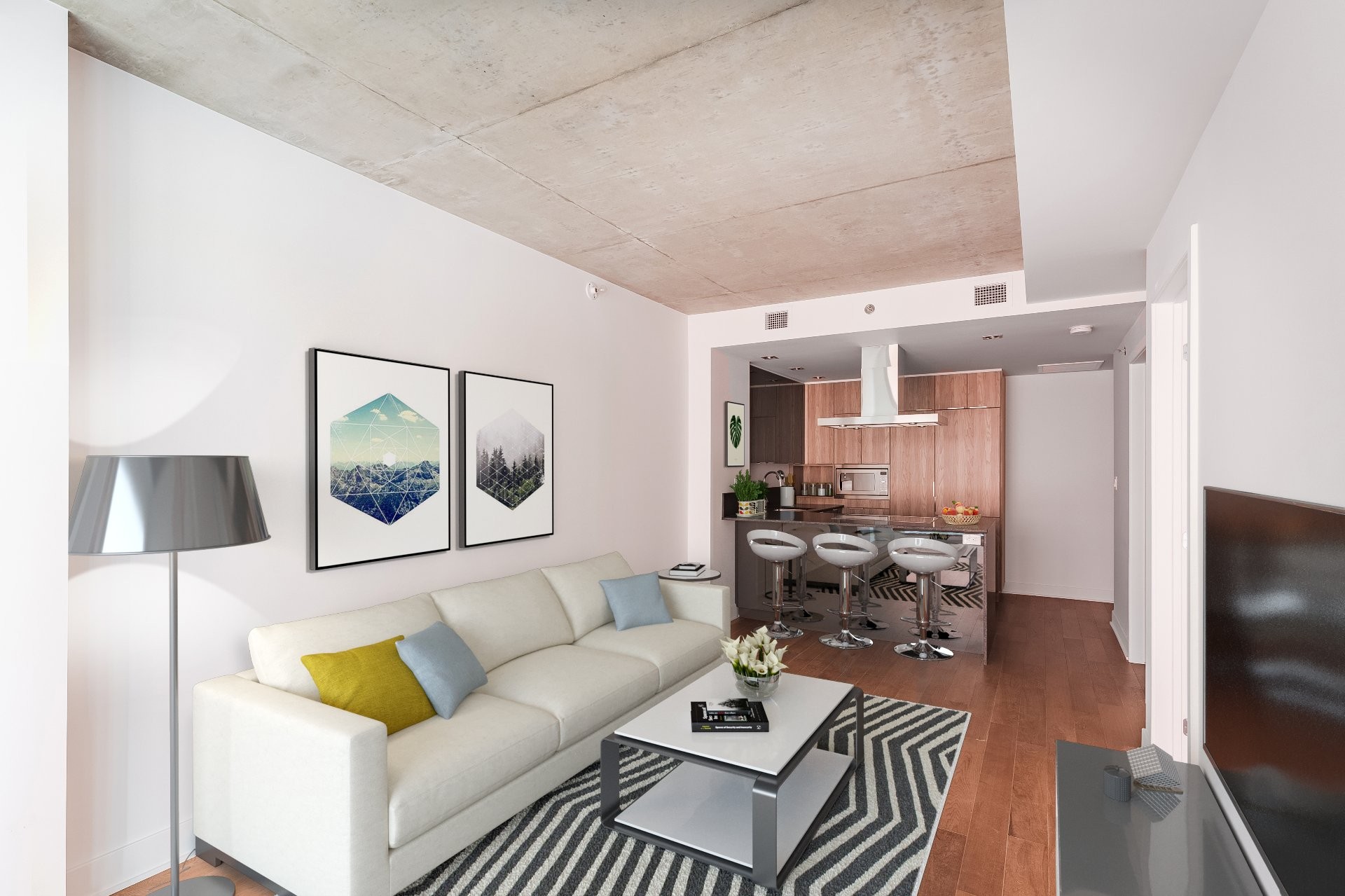 Unité de coin partiellement meublé moderne au YUL avec 2 chambres, 1 salle de bain et espace lumineux à aire ouverte. Fenêtres pleine hauteu...