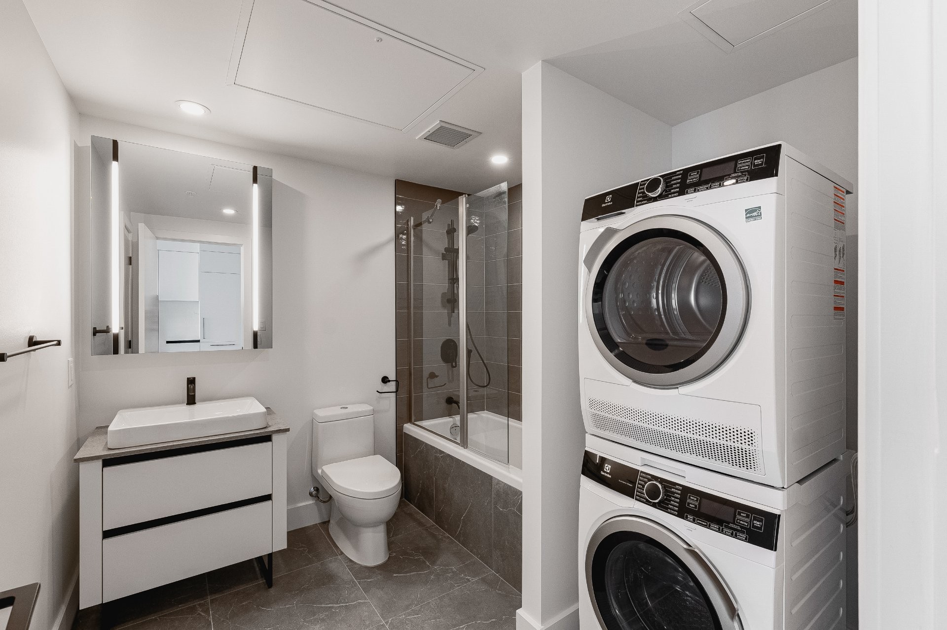 24-inch refrigerator with integrated panel, 24-inch electric cooktop, 24-inch built-in stainless steel speed oven, dishwasher with integrated panel. Front-loading stacked washer and dryer.