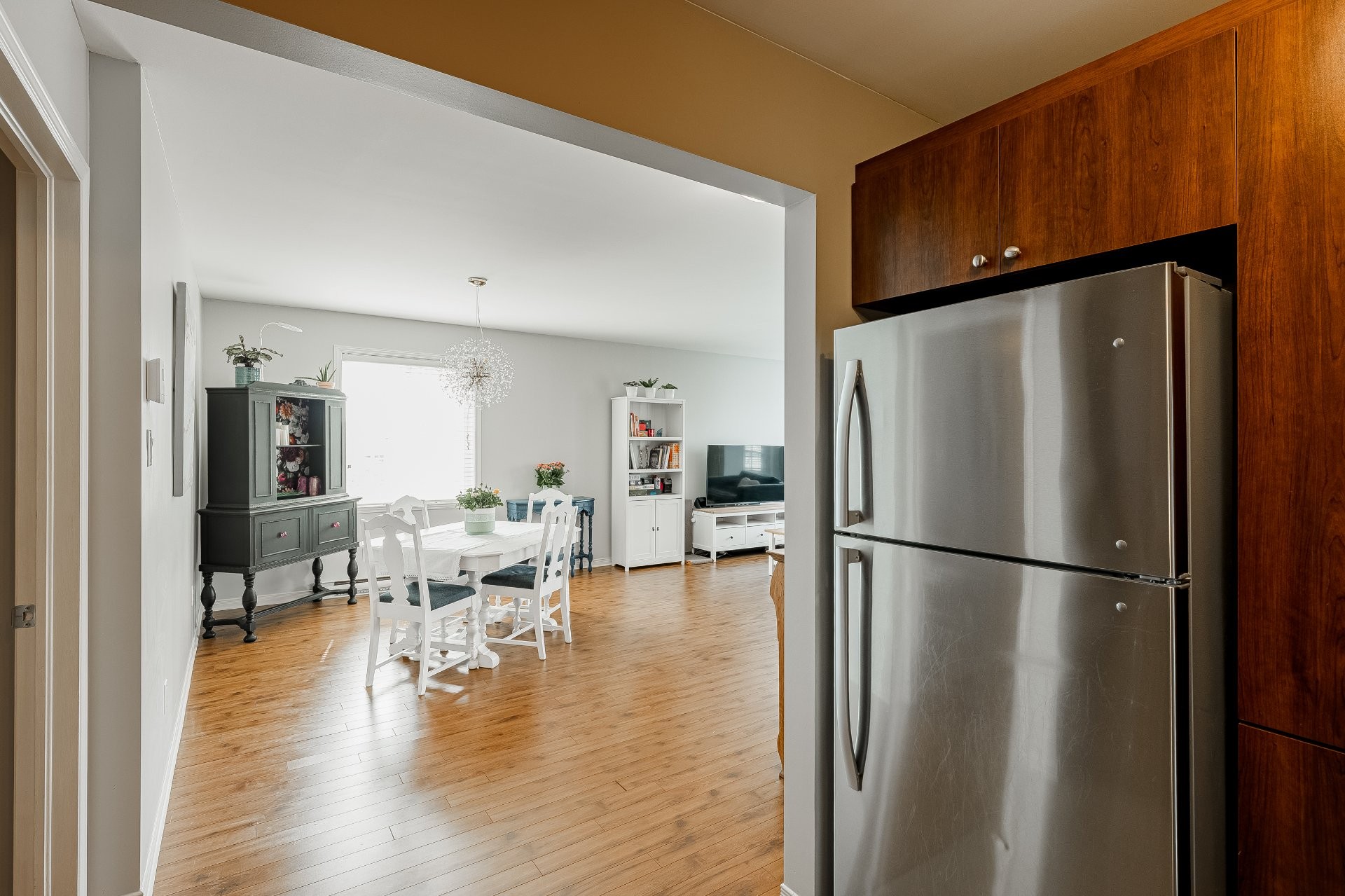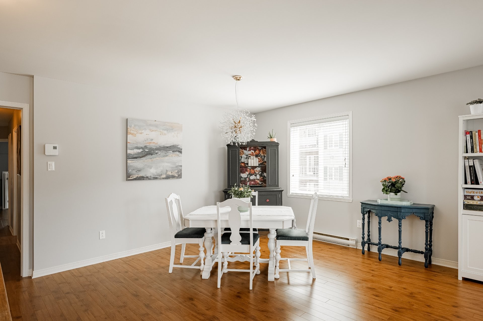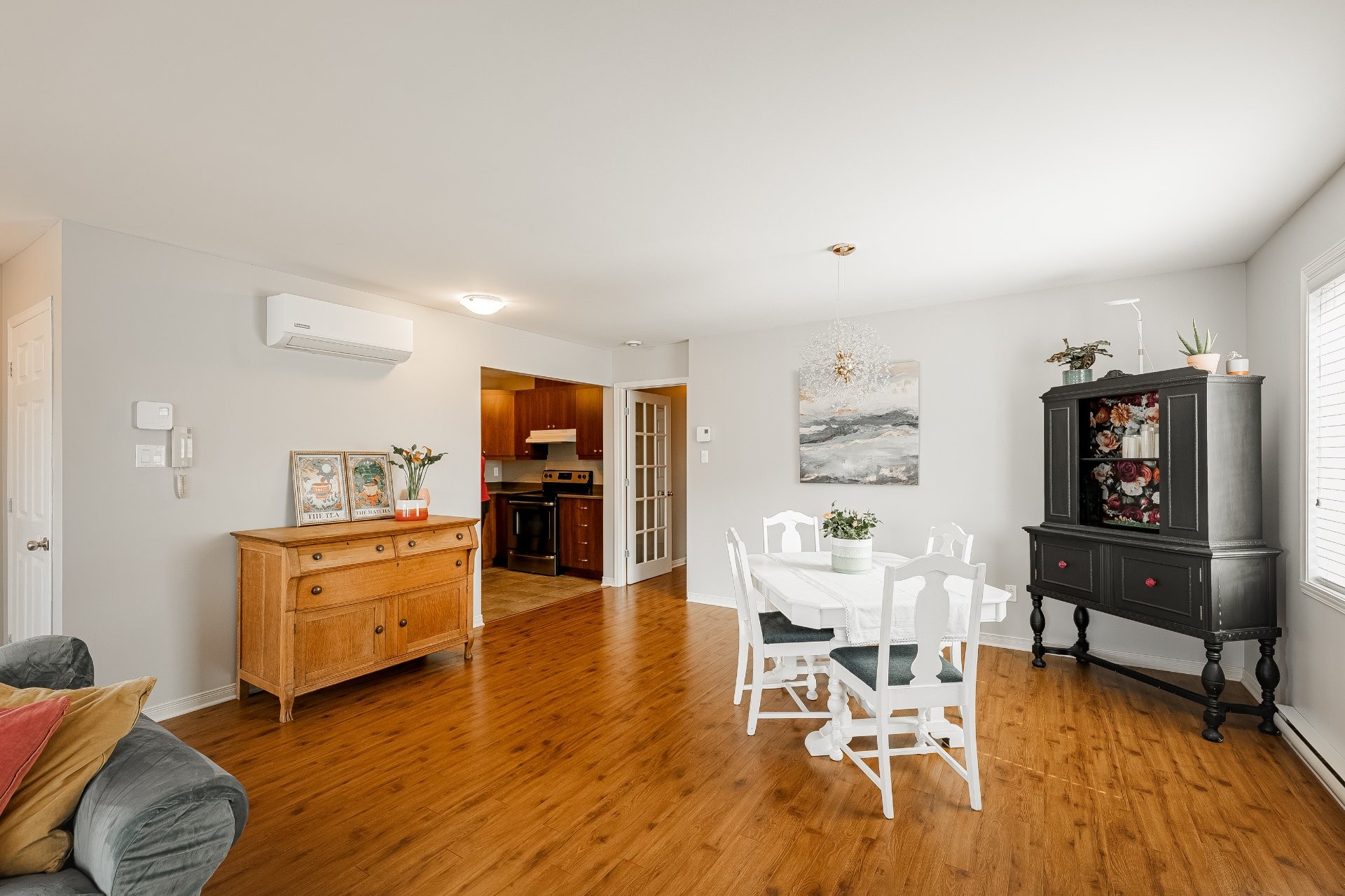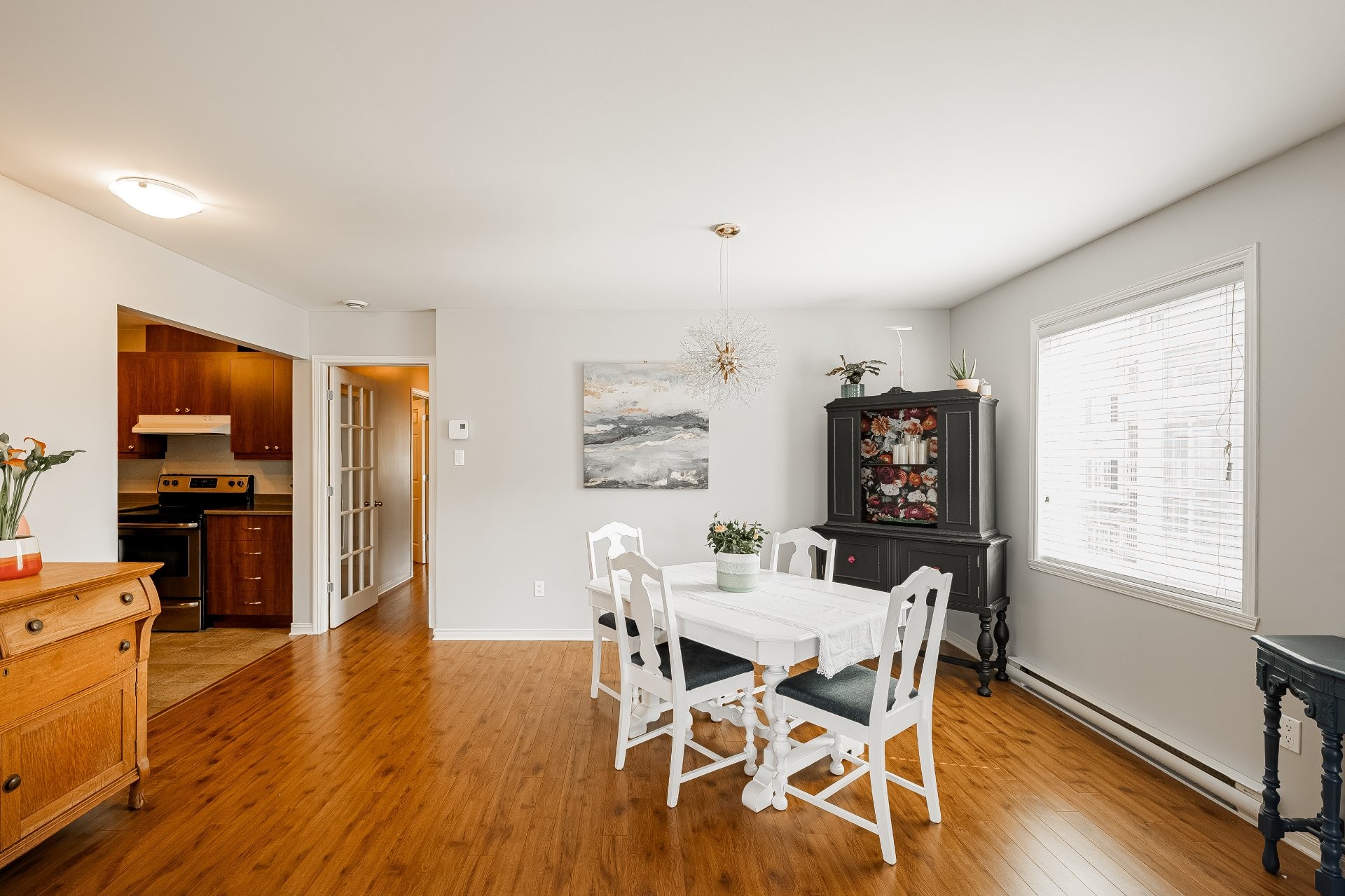 Light fixture in the dining area, as well as the primary bedroom