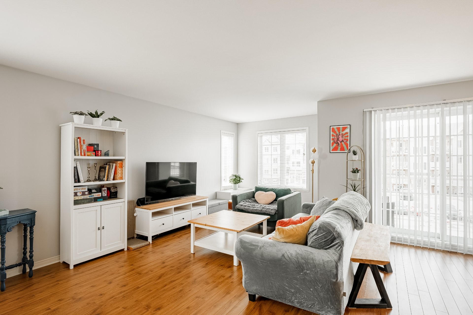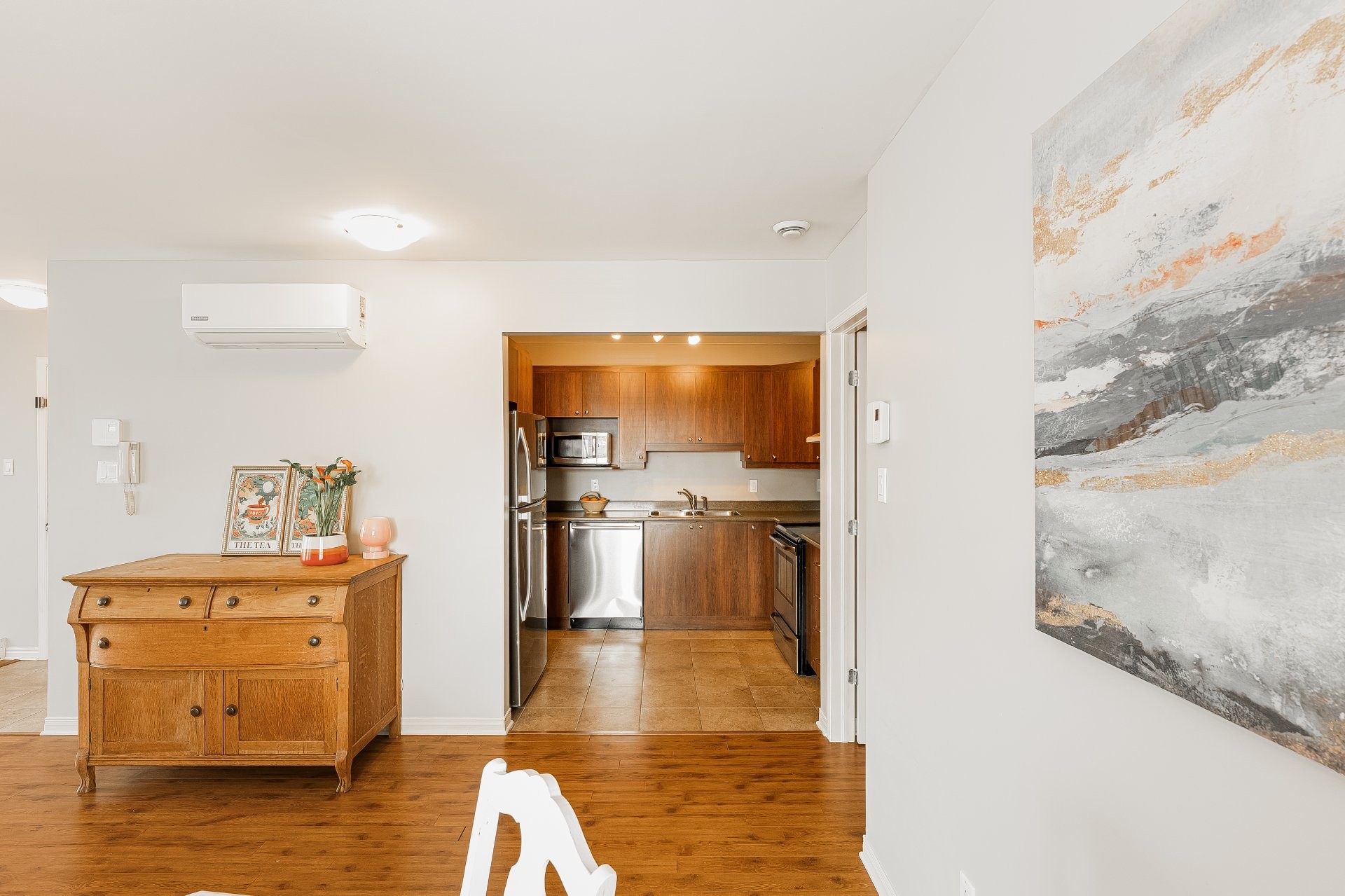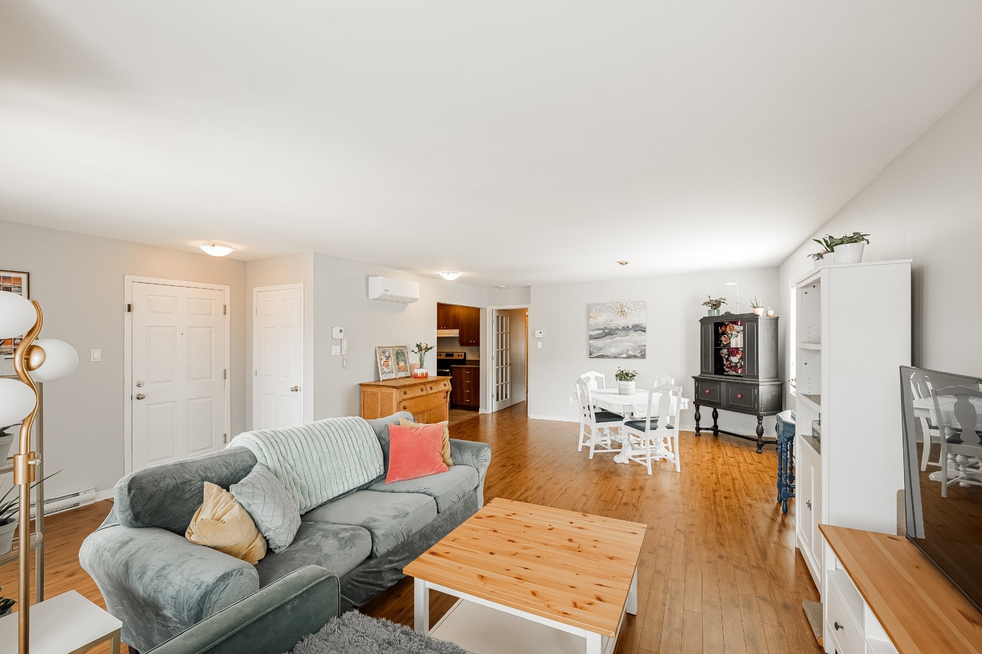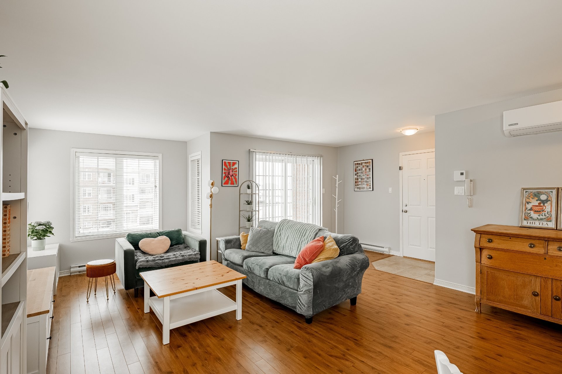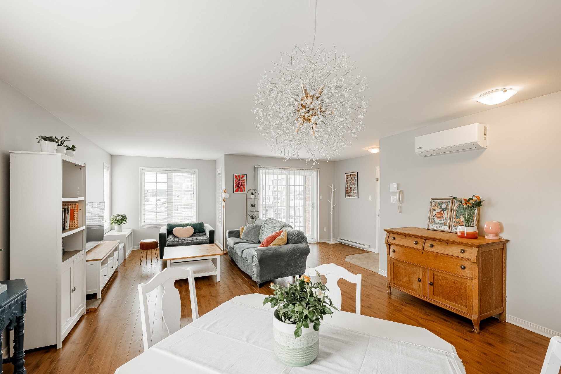 PROPERTY FEATURESThis spacious and bright 2-bedroom condo offers an open-concept layout connecting the kitchen, dining and living areas, creating a welcoming space that is perfect for entertaining family and friends. Comfort is ensured year-round with a wall-mounted air conditioner, allowing you to maintain a pleasant indoor temperature in every season. The property stands out with its massive storage capacity, including 3 walk-in closets (front hall, laundry room and primary bedroom), a rare and highly desirable feature for this type of property. An independent laundry room with generous storage makes day-to-day living even more practical. Two included parking spaces are a significant asset in this growing area.