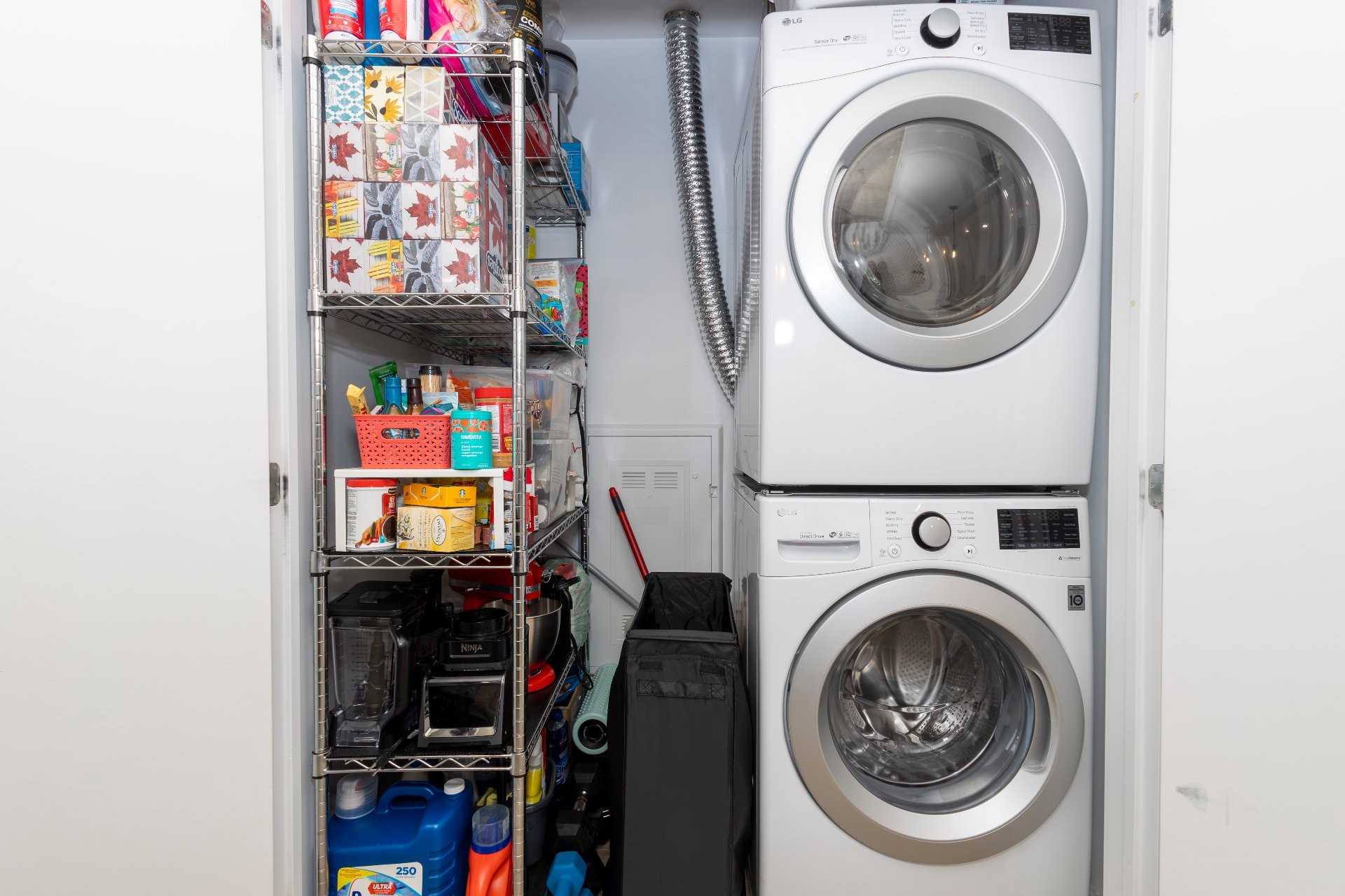 Fridge, stove, hood, dishwasher, microwave, washer, dryer, hot water, window coverings, kitchen table and 6 chairs, sofa, 2 throw cushions, ottoman, tv stand, queen bed and frame, 2 bedroom side tables, white cabinet in entrance, wall art, living room mirror, closet dresser and shelving unit, 2 balcony chairs