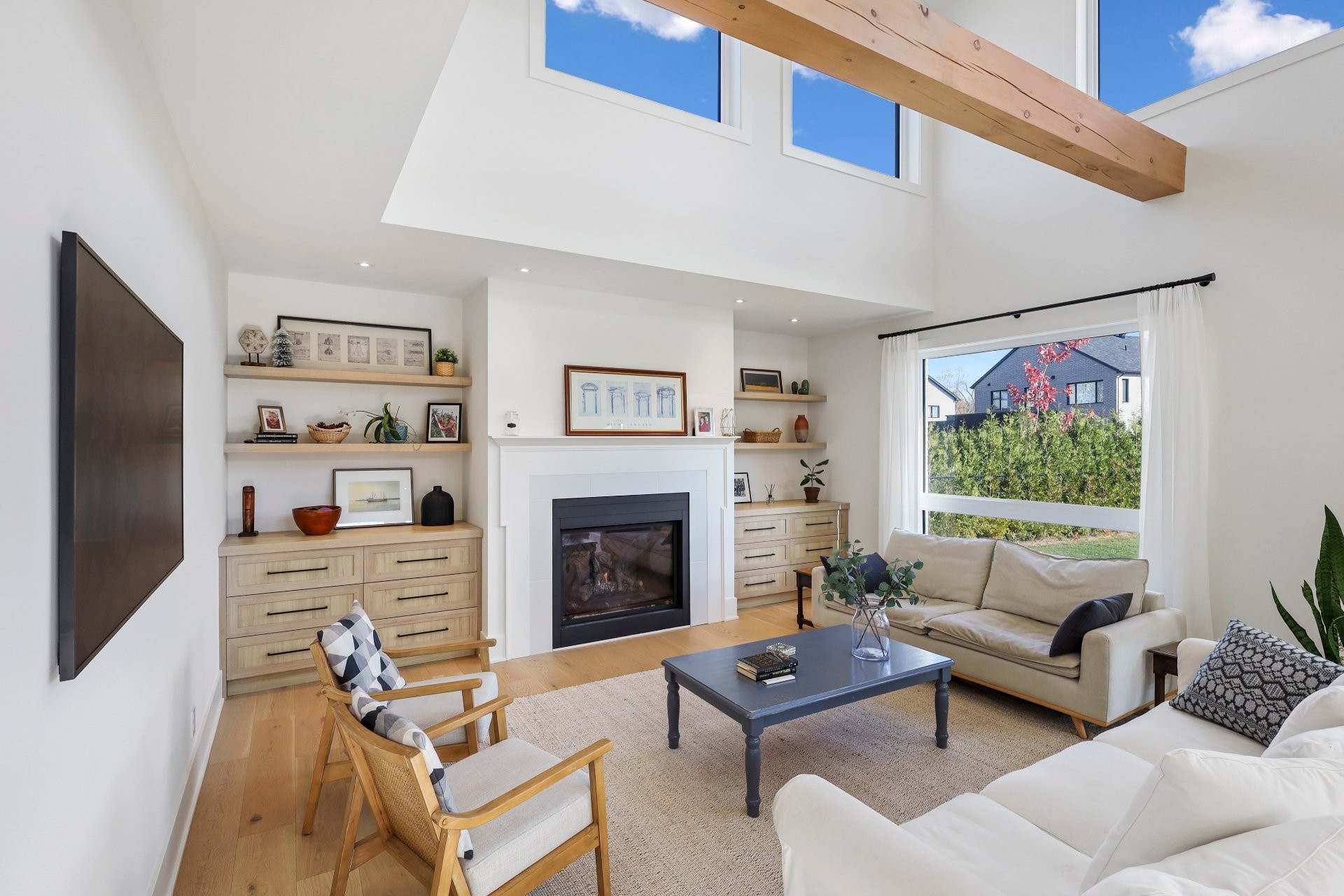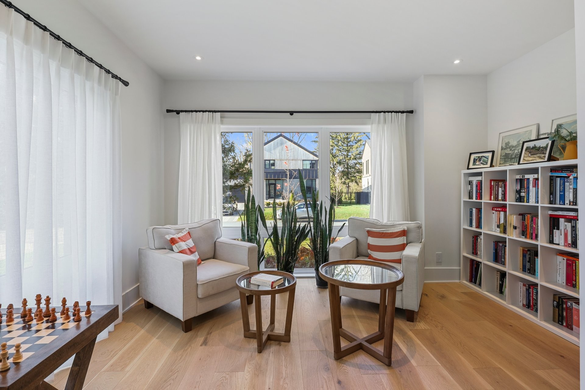 The main level also includes a large laundry room with access to the mudroom and double garage with epoxy floors, as well as a versatile den ideal for a home office.