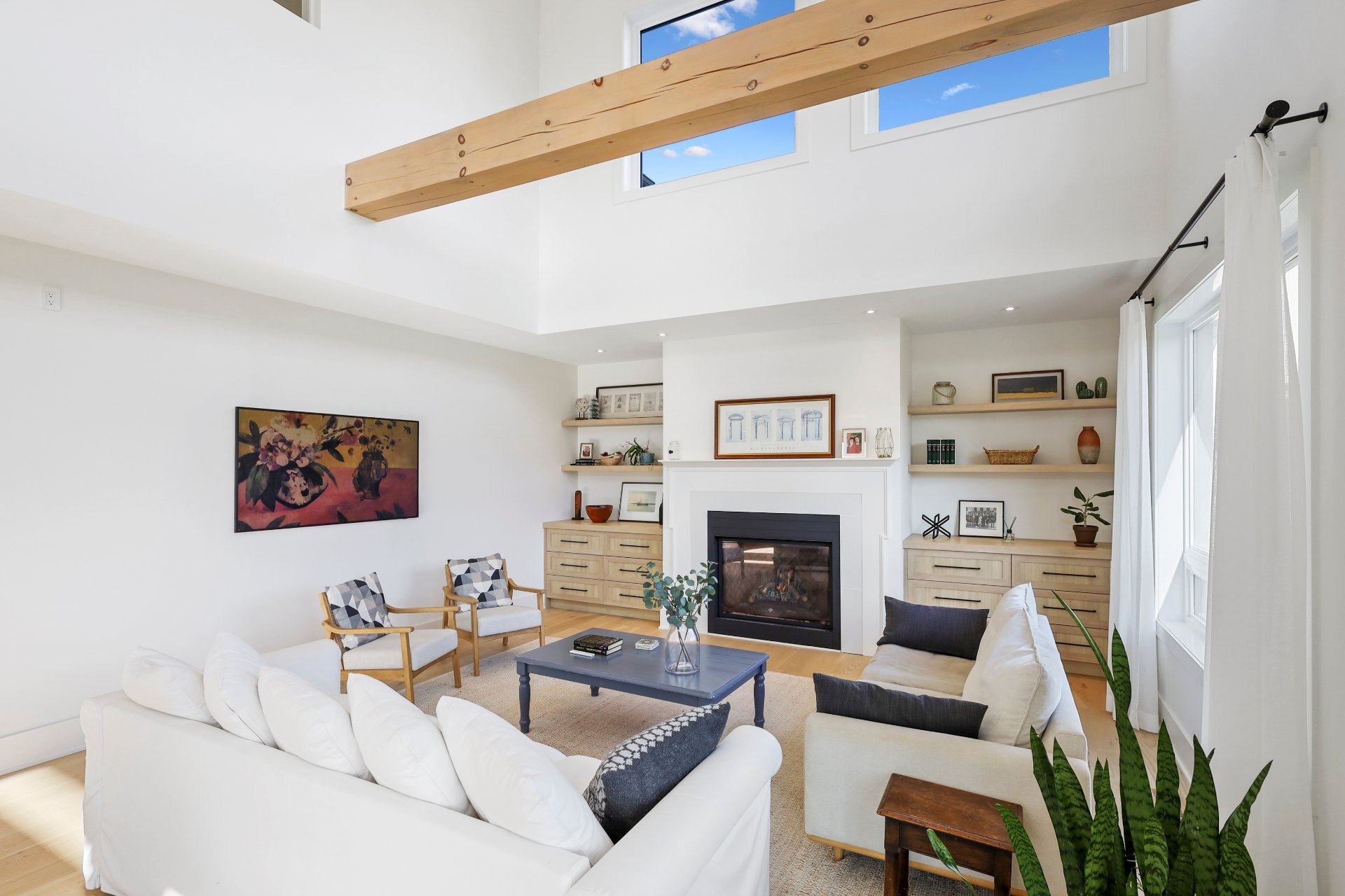 At the heart of the home, the gourmet kitchen features a large center island, quartz countertops and backsplash, a pot filler, and a discreet entry to a spacious 5.9 x 9.9 butler's pantry. The kitchen opens seamlessly to the dinette and elegant living room, where custom built-ins and a gas fireplace create a warm, inviting ambiance.