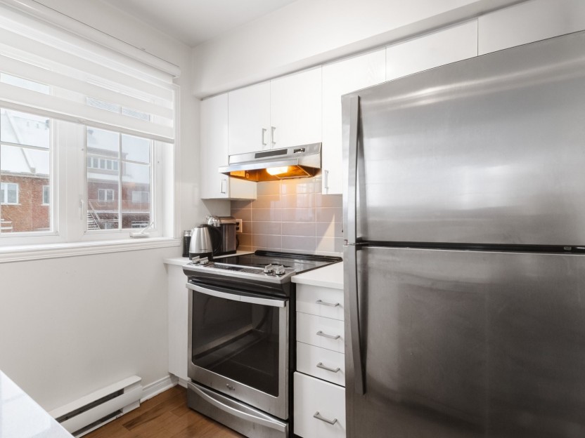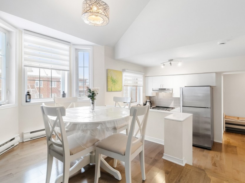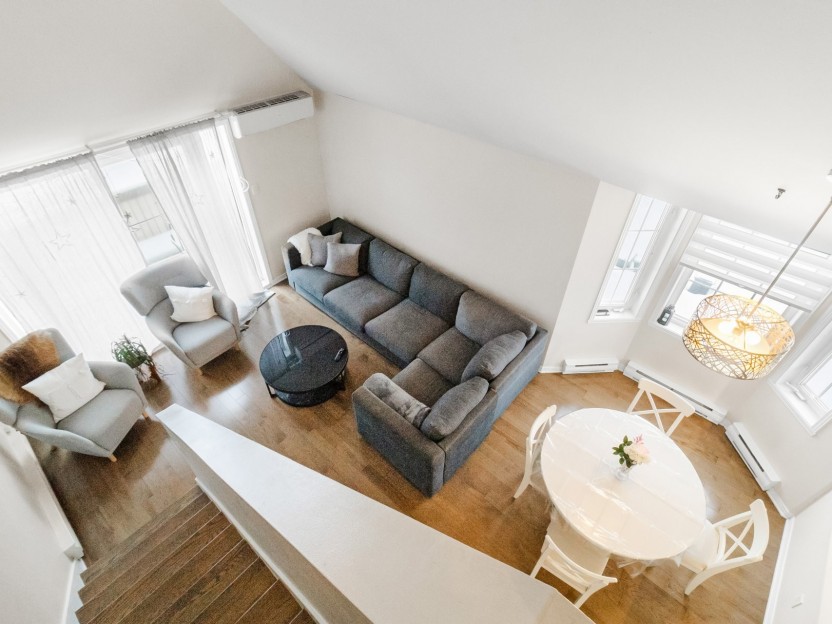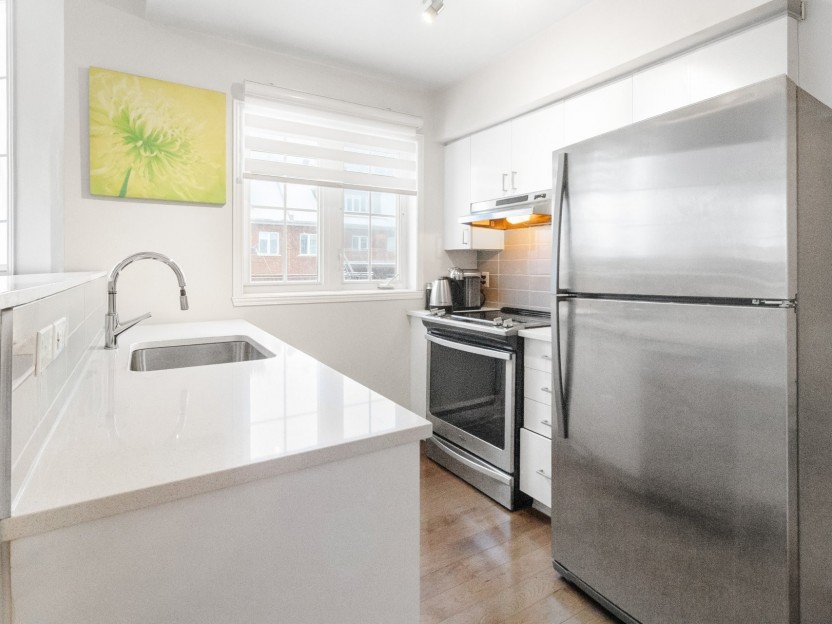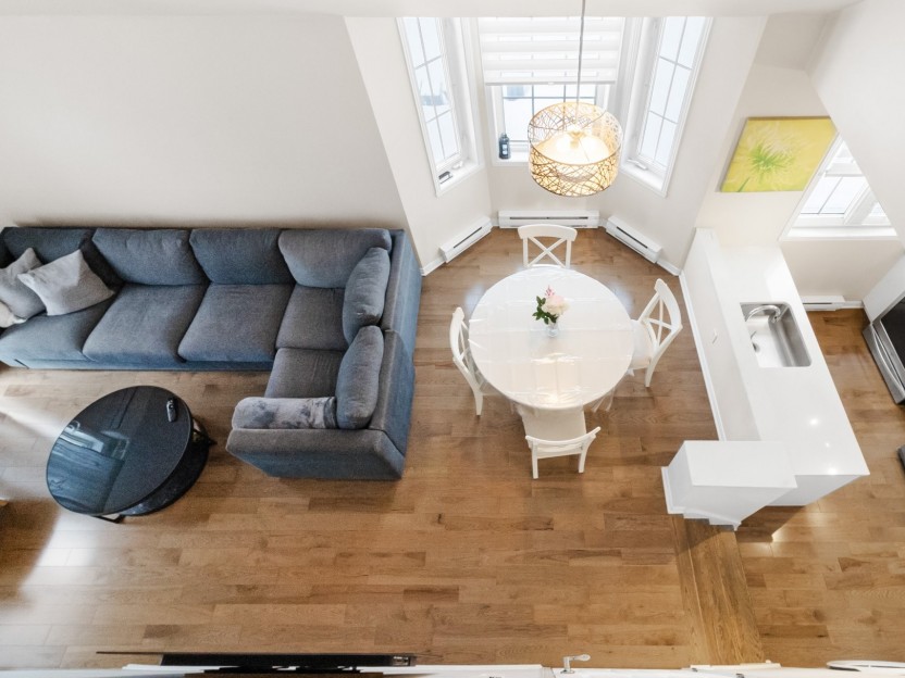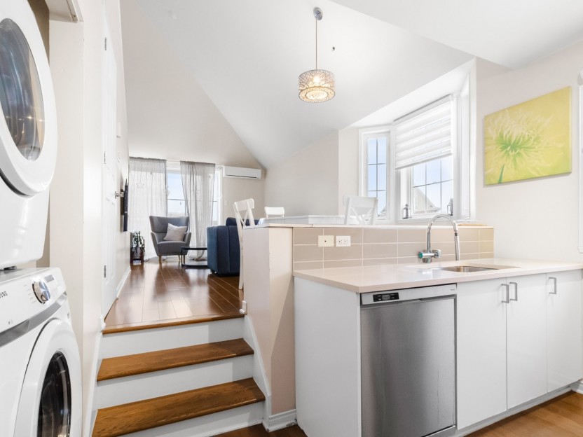 Unité lumineuse et aérée de 1 chambre sur deux niveaux, avec chambre en mezzanine et plafonds de 15 pieds. Cuisine rénovée avec comptoirs en...