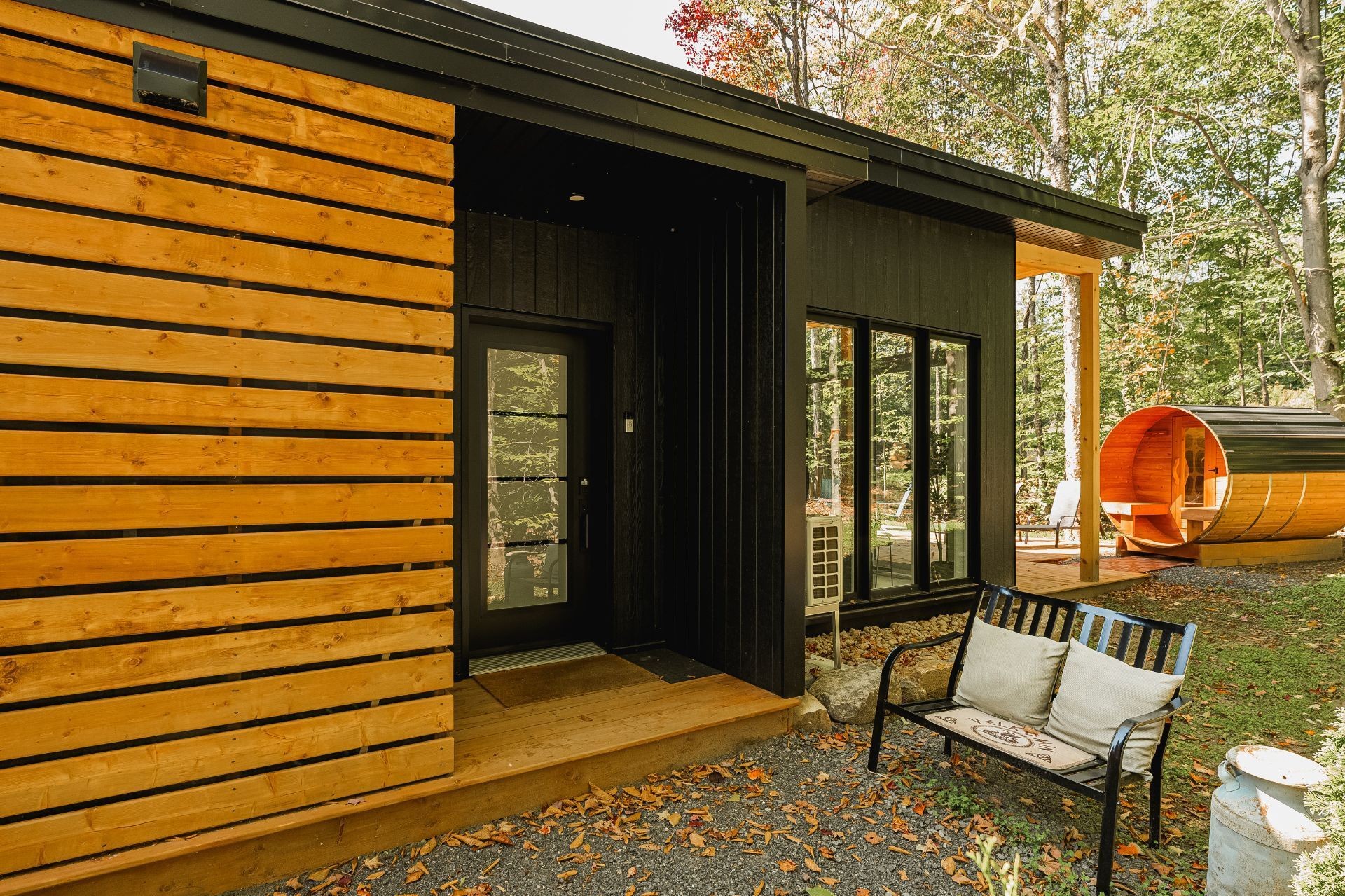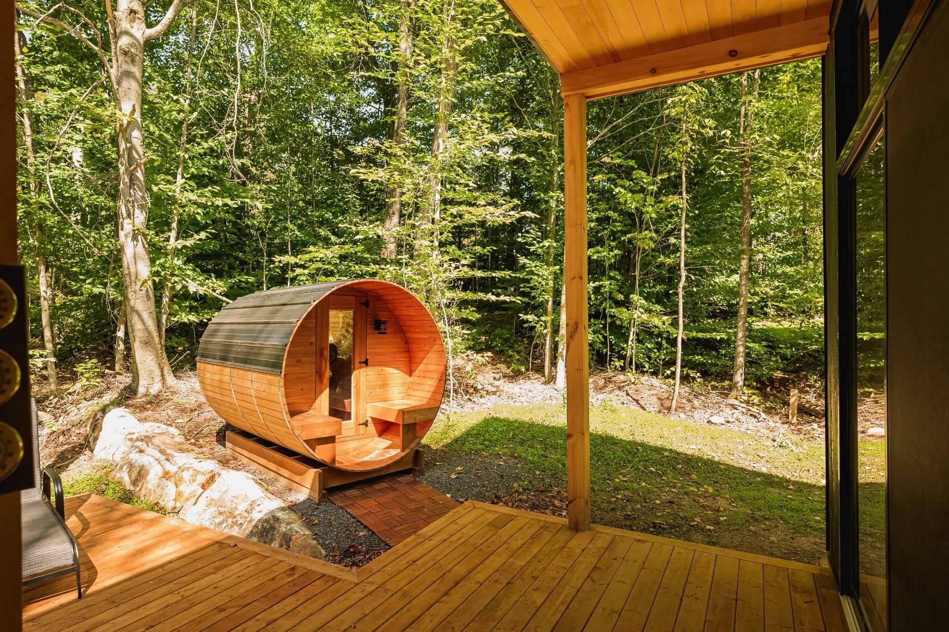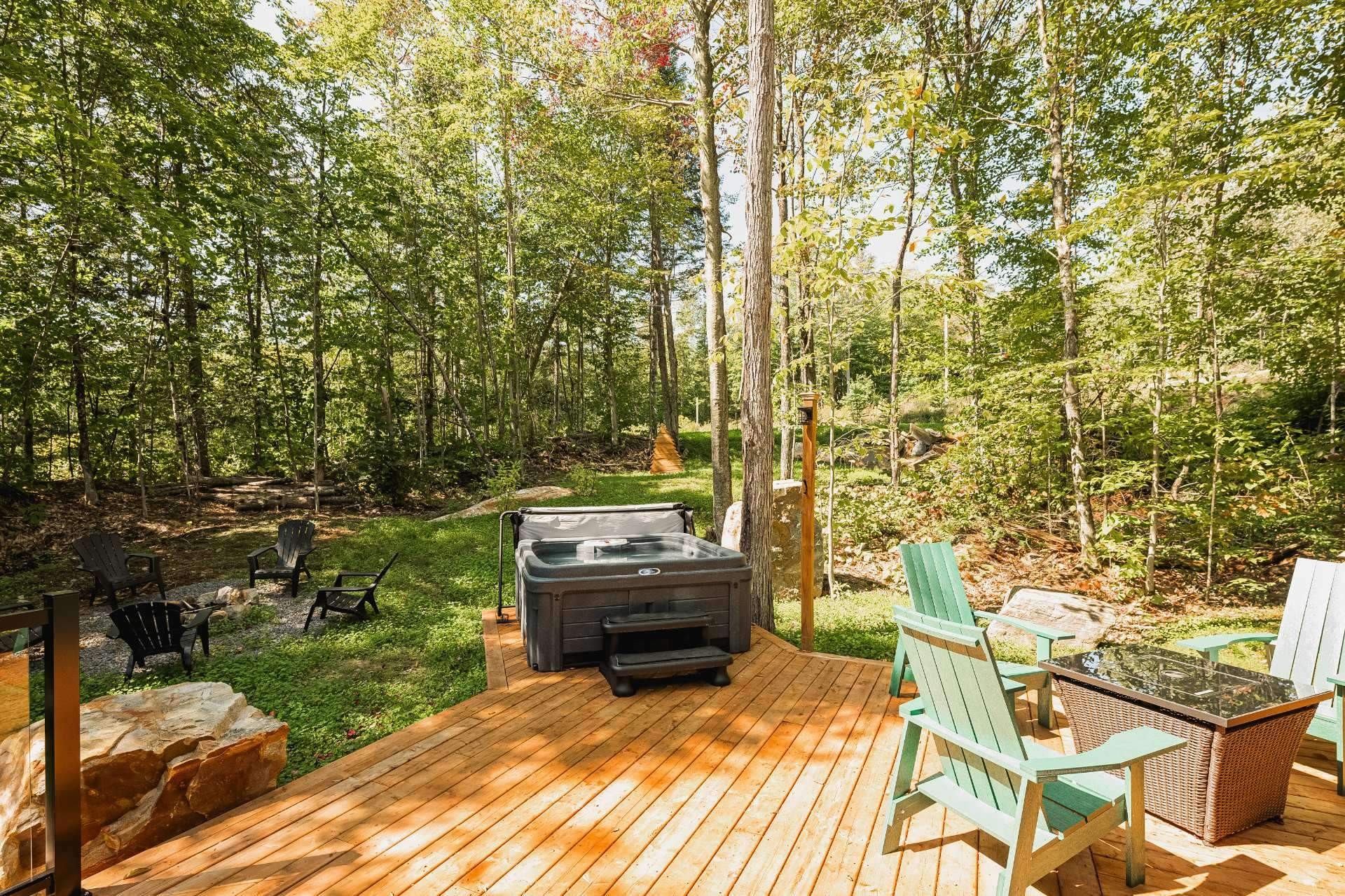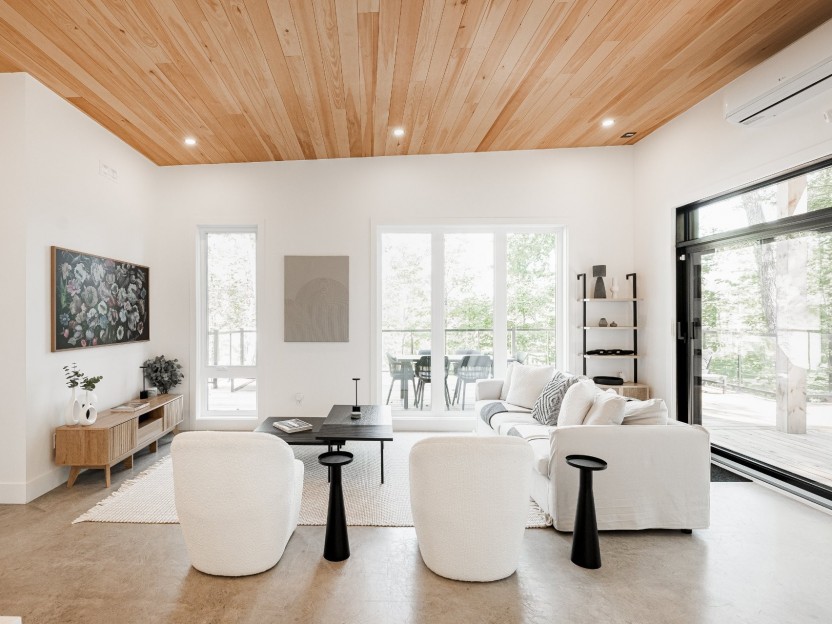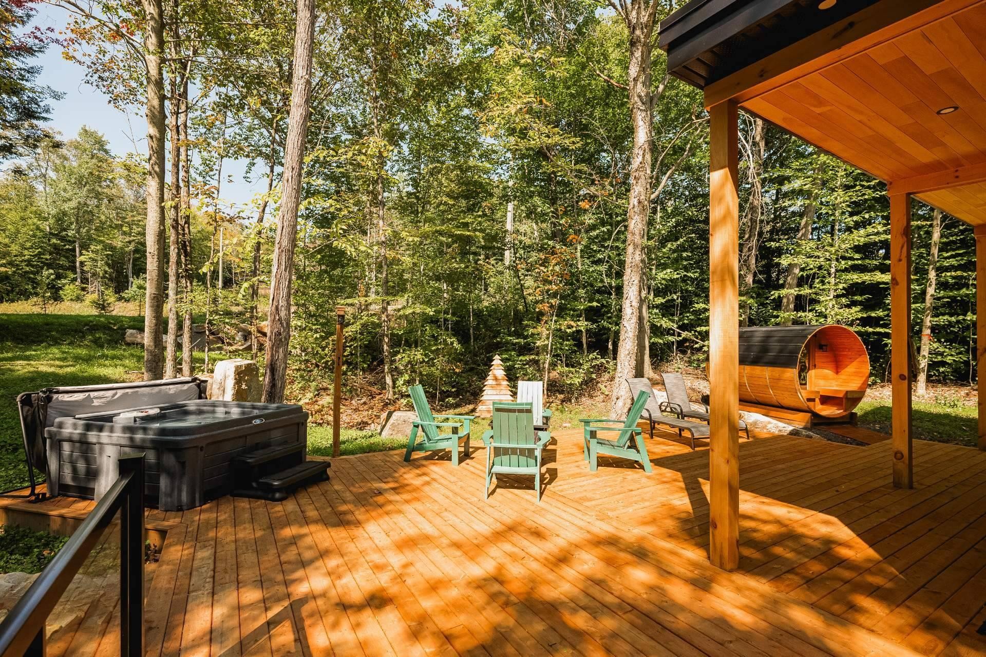 SHORT-TERM RENTALS PERMITTED! Stunning luxury cottage with 2 bedrooms and 1 bathroom, located just 12 minutes from Mont-Tremblant. Modern design, high-end materials, heated floors, large terrace with jacuzzi. A perfect balance between comfort, nature, and return on investment. A turnkey investment combining pleasure and profitability, in the heart of the ChicShack estate!