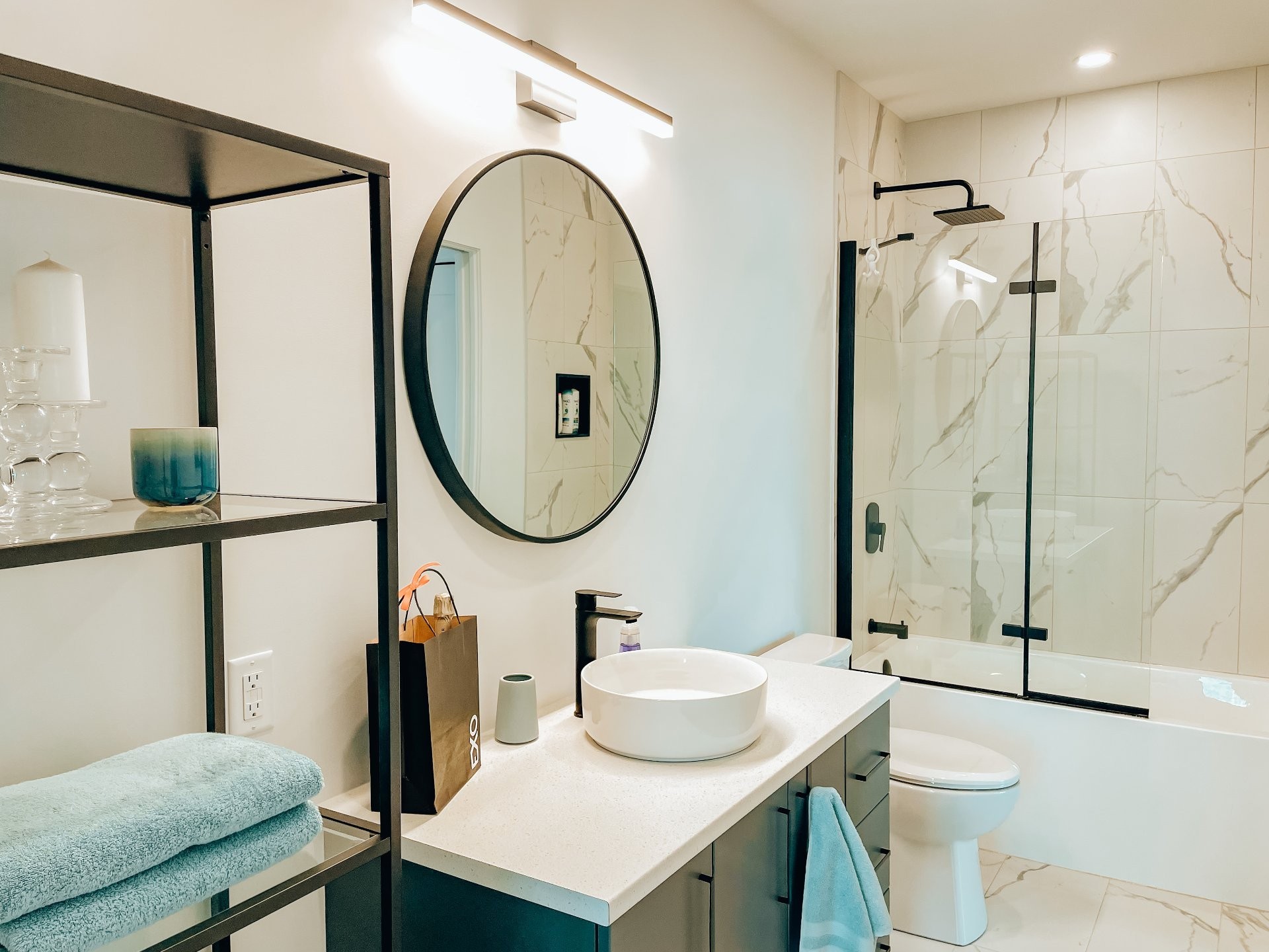 High-end finishes: quartz countertops, radiant floors, nearly 9' ceilings, and superior soundproofing.
