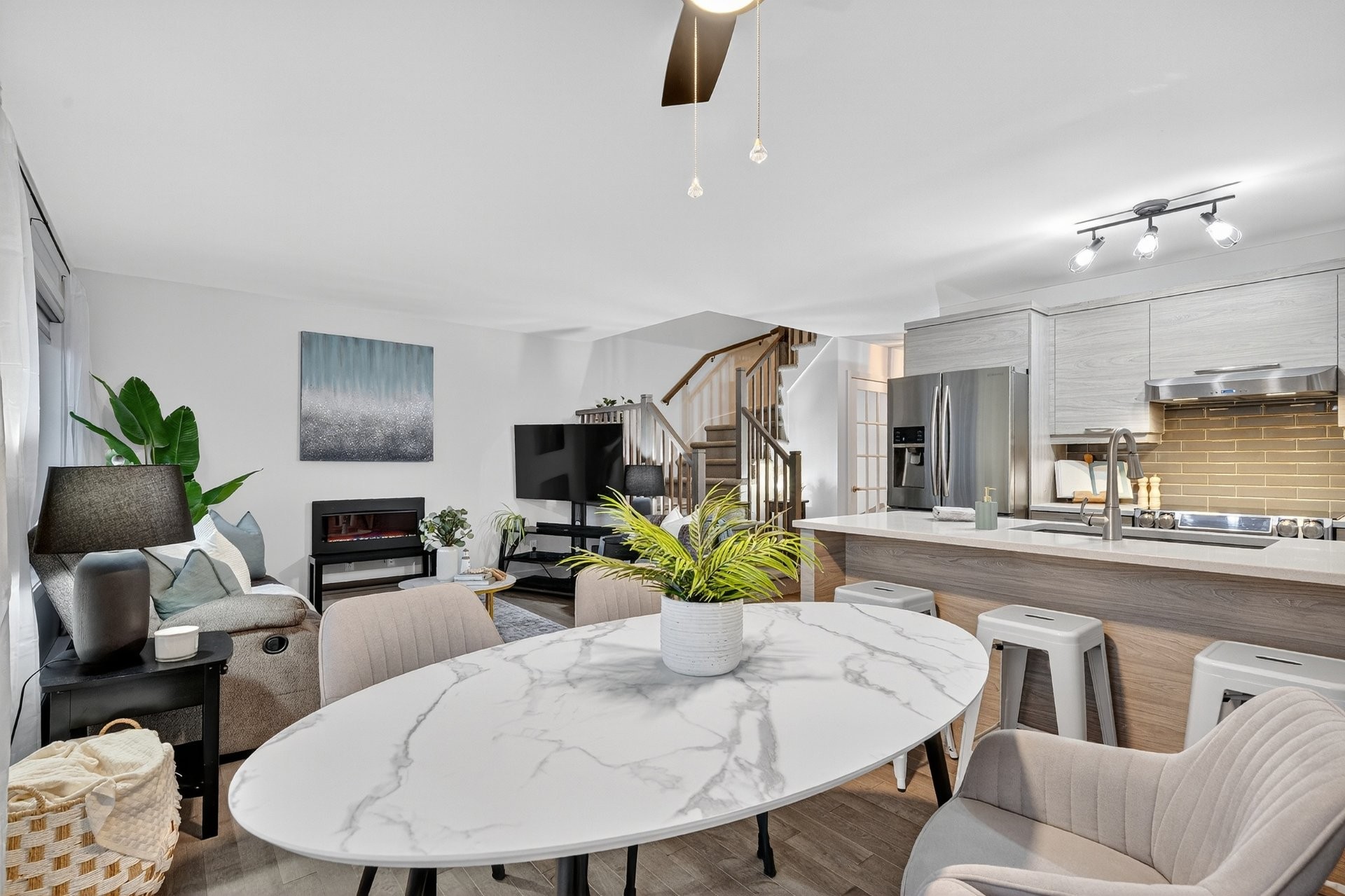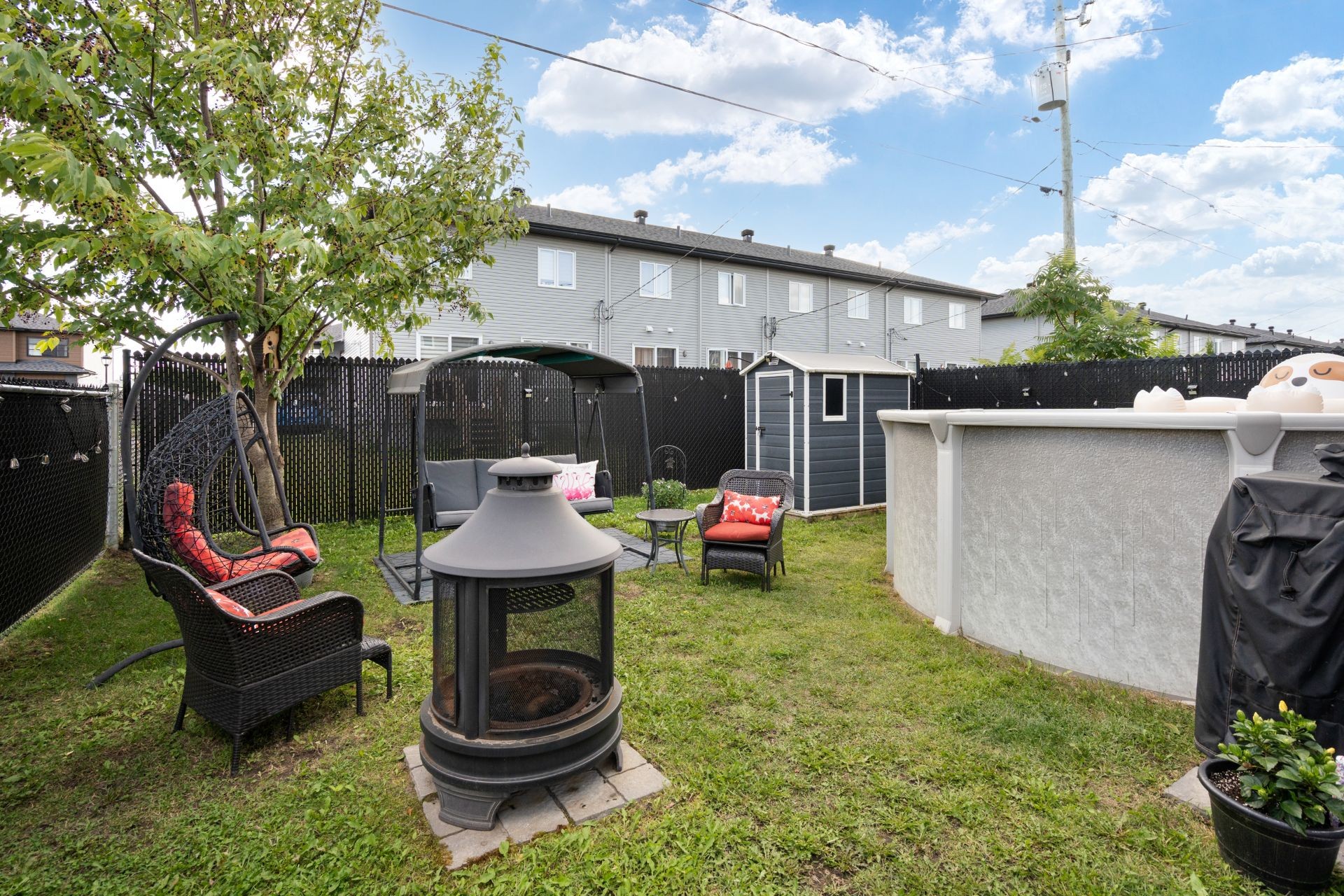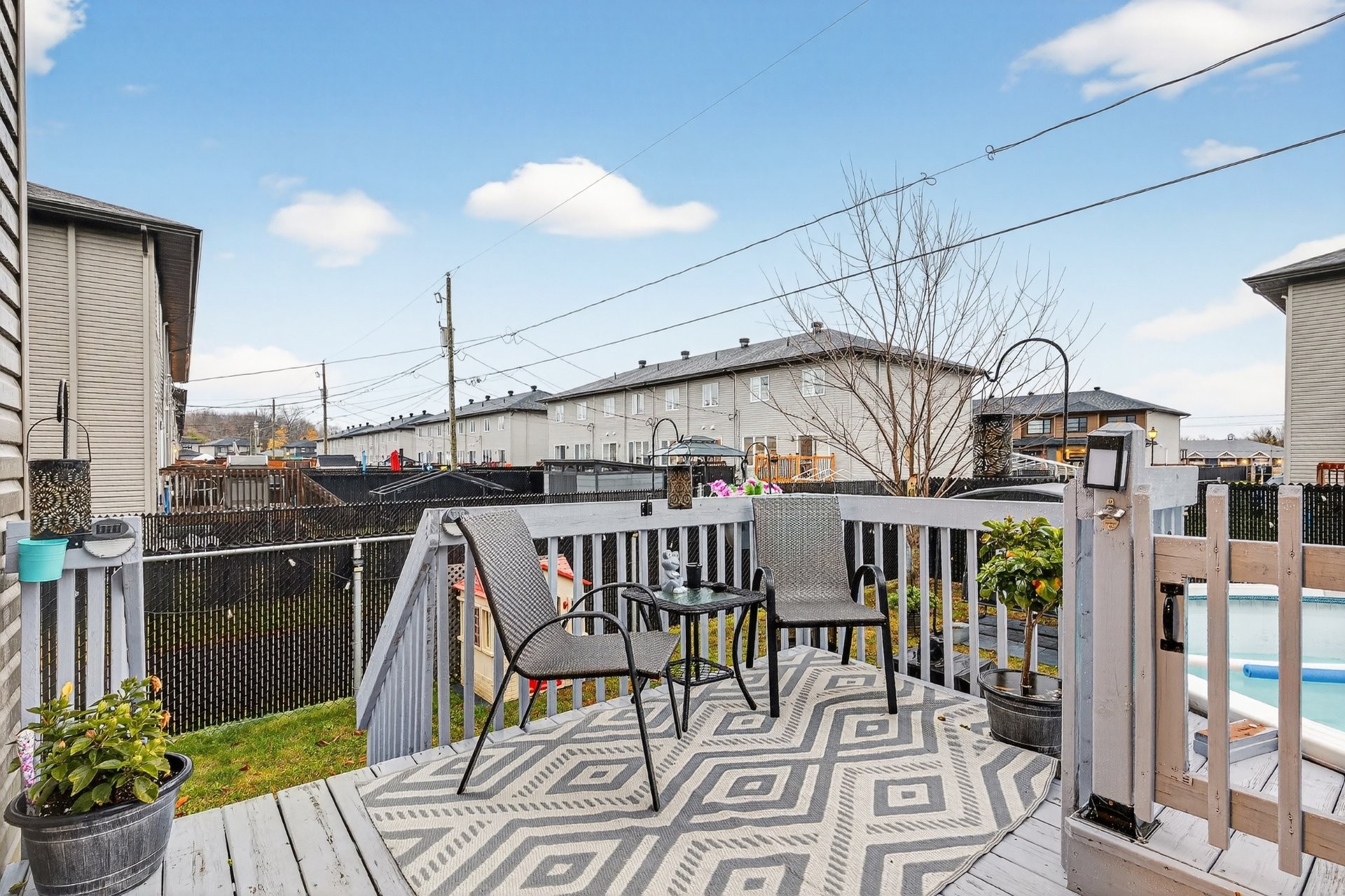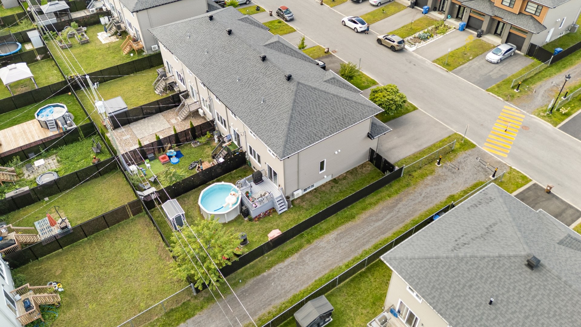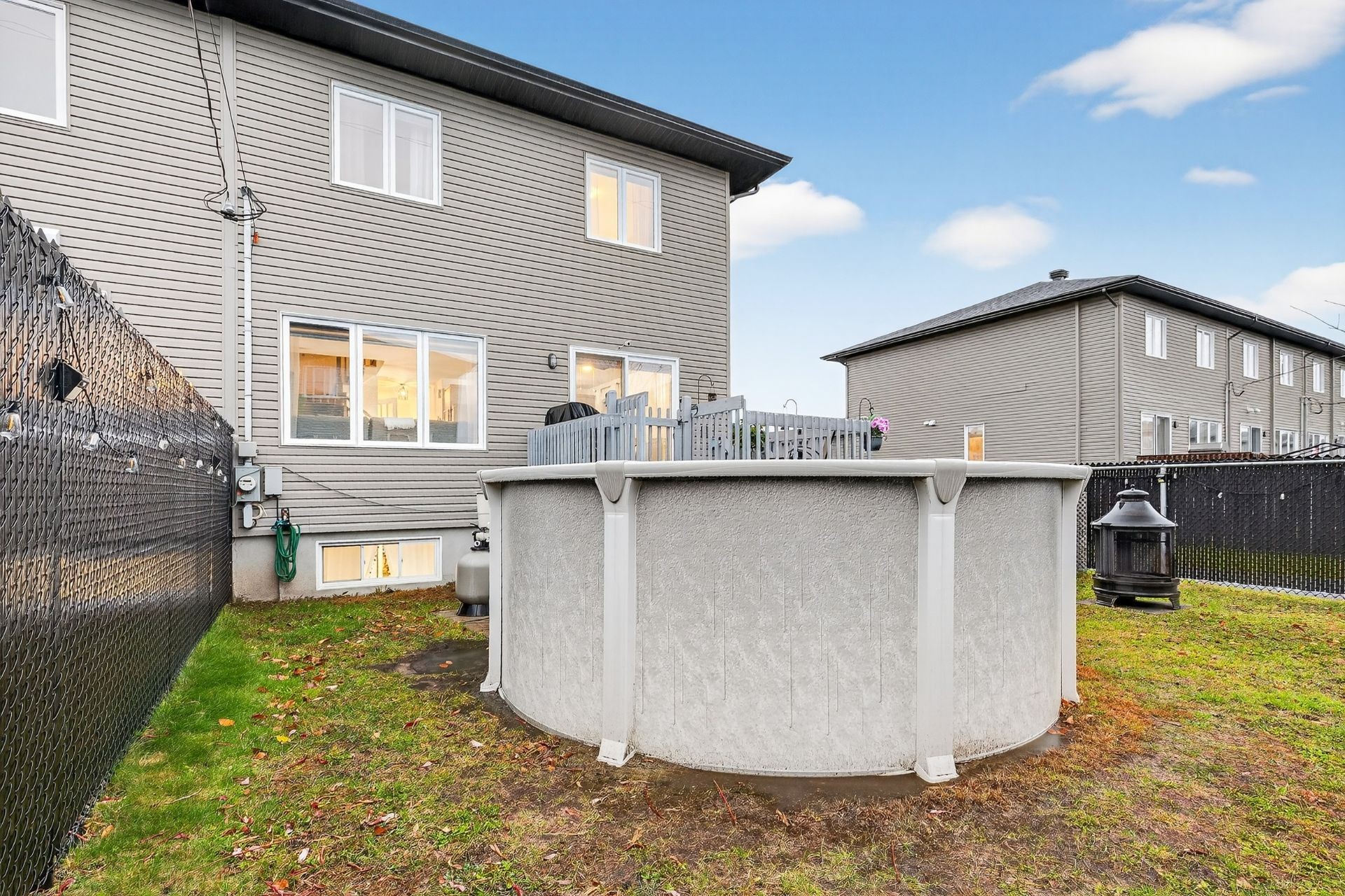 Spacious corner unit in Cité des Papillons on a private lot with a heated saltwater pool and direct gate to walking path. Modern open concept with granite island, two electric fireplaces, and garage access. Three large bedrooms upstairs with a stylish bath, separate laundry, and bright windows. The basement offers a sixteen-by-twenty-foot family room with storage. Updated lighting, window coverings, and finishes make this home turnkey. Prime location near highways, schools, daycares, and the new hospital--perfect for families or investors.