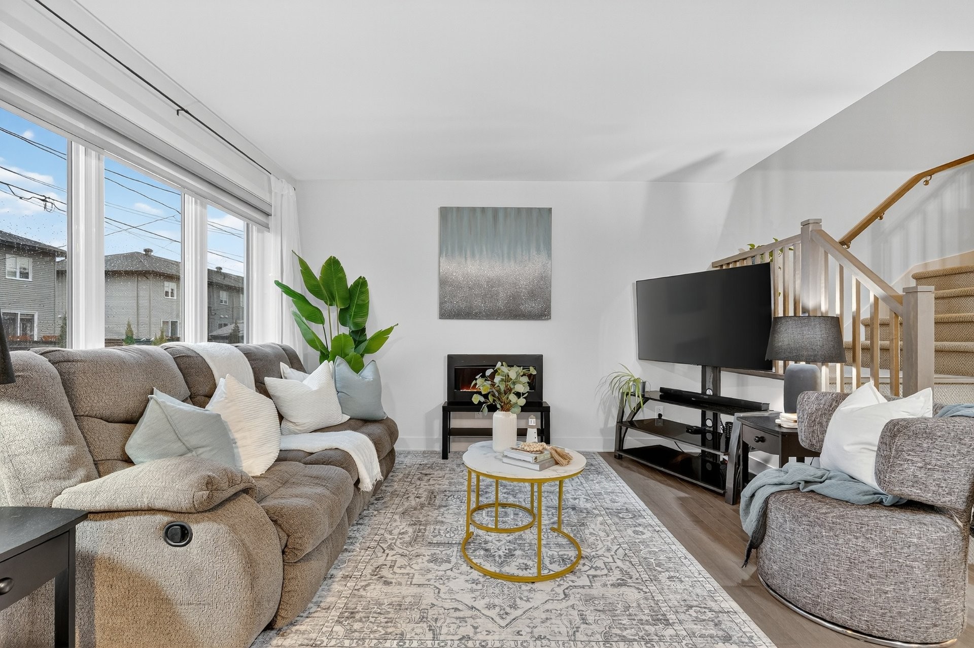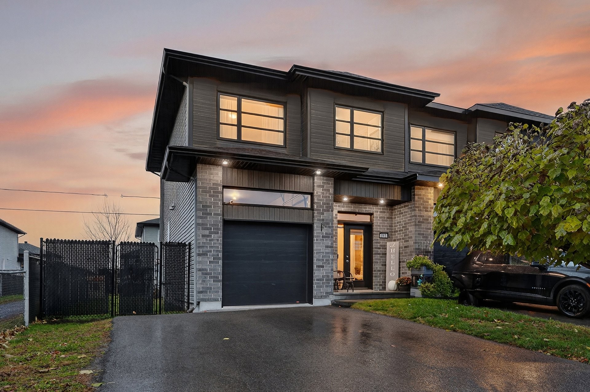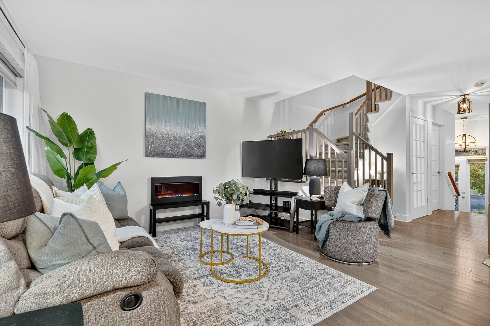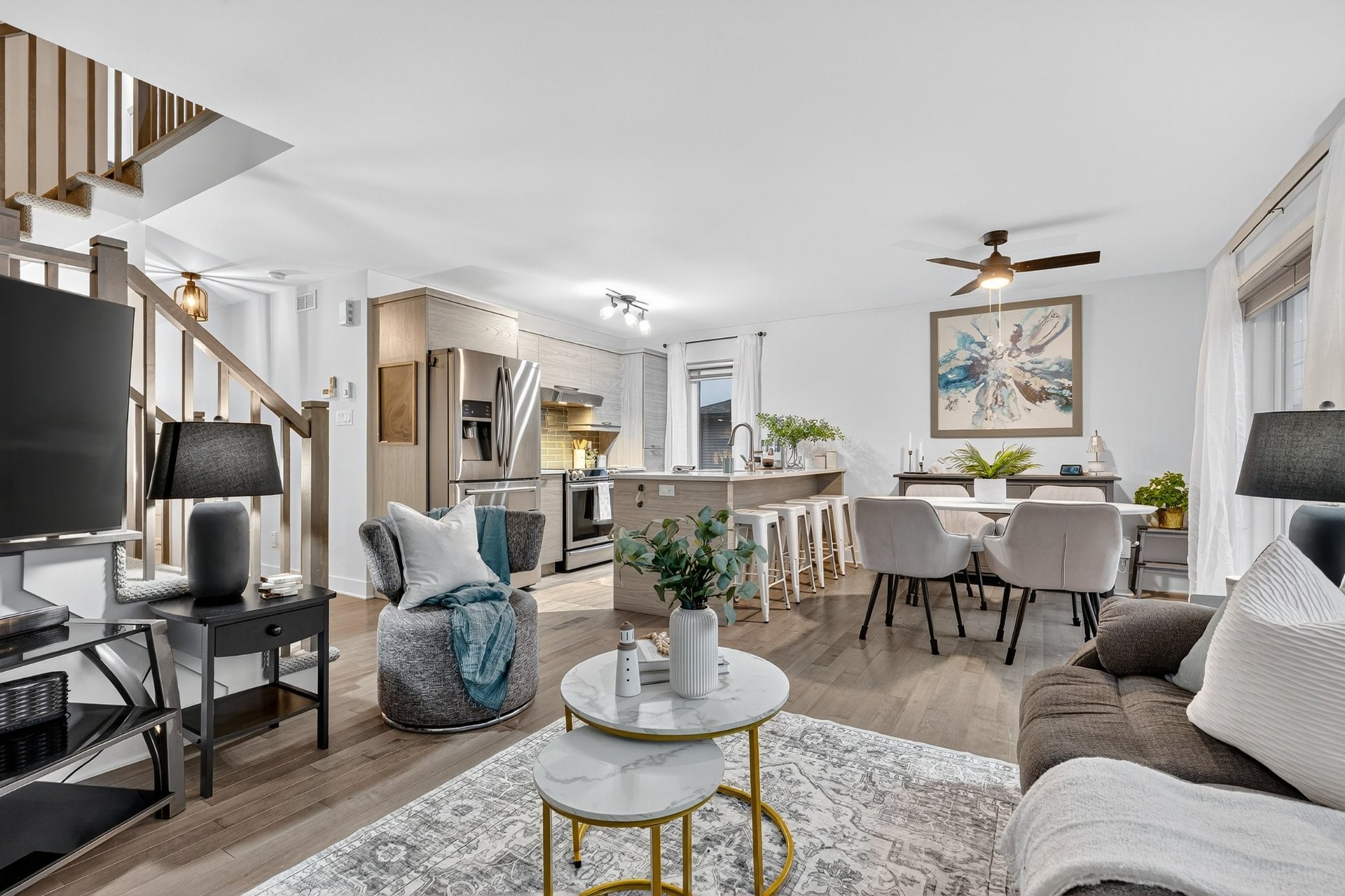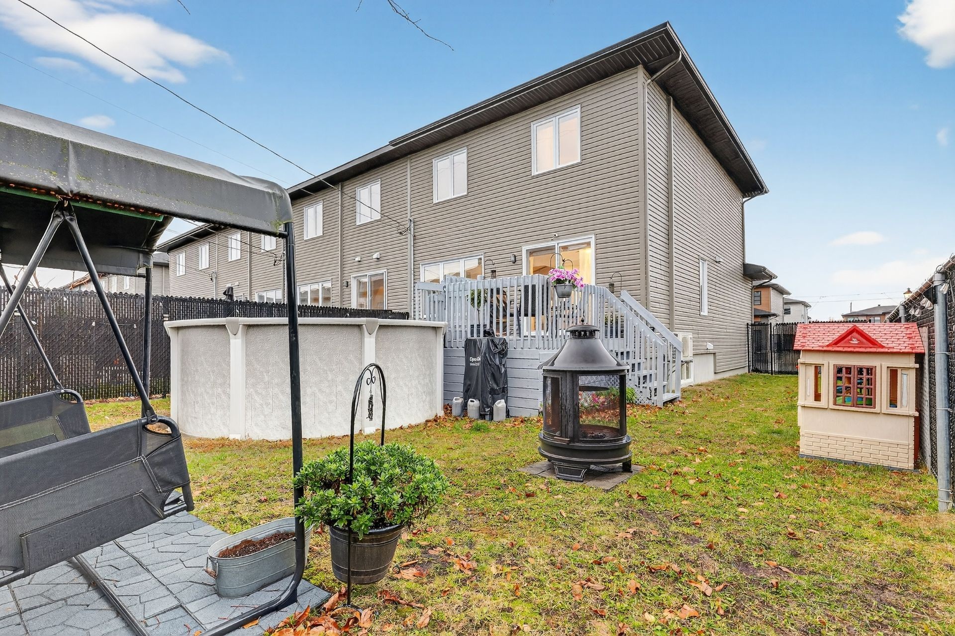 Spacious corner unit in Cité des Papillons on a private lot with a heated saltwater pool and direct gate to walking path. Modern open concept with granite island, two electric fireplaces, and garage access. Three large bedrooms upstairs with a stylish bath, separate laundry, and bright windows. The basement offers a sixteen-by-twenty-foot family room with storage. Updated lighting, window coverings, and finishes make this home turnkey. Prime location near highways, schools, daycares, and the new hospital--perfect for families or investors.