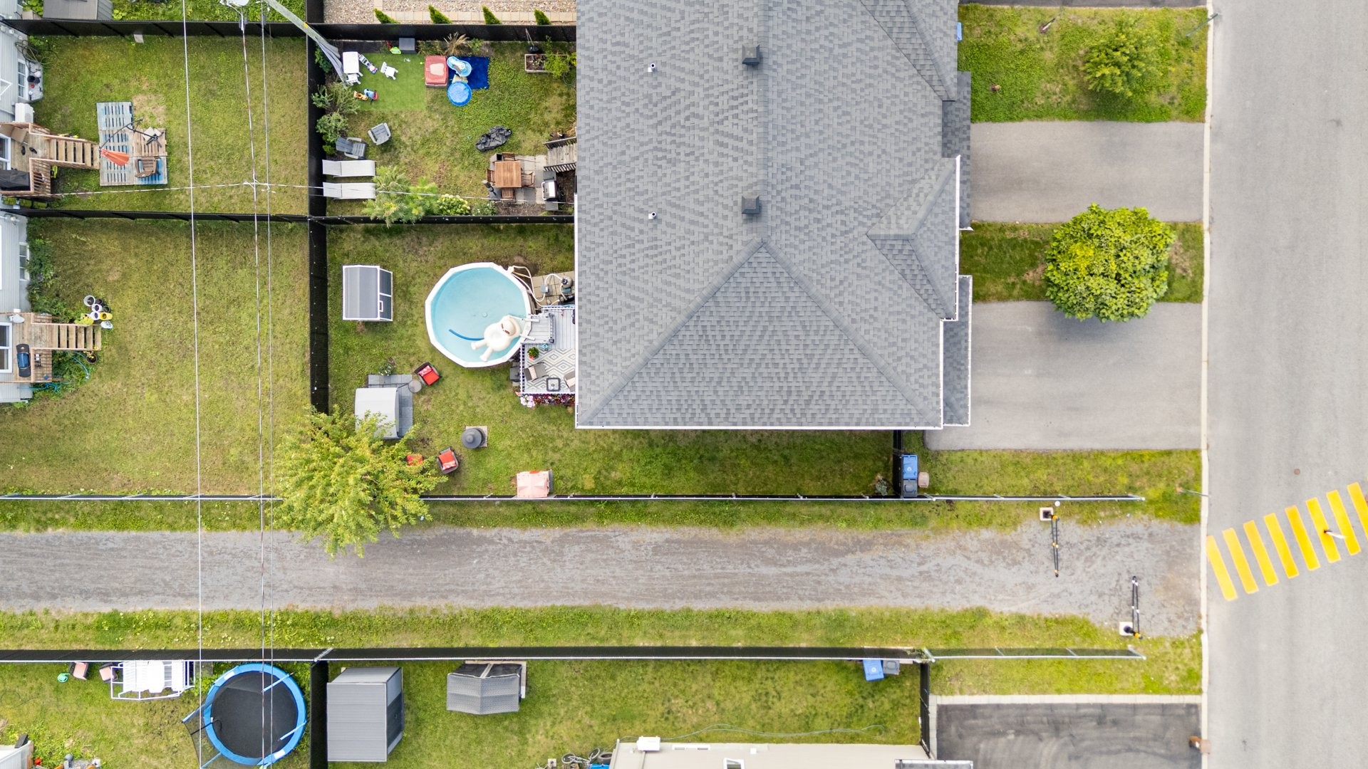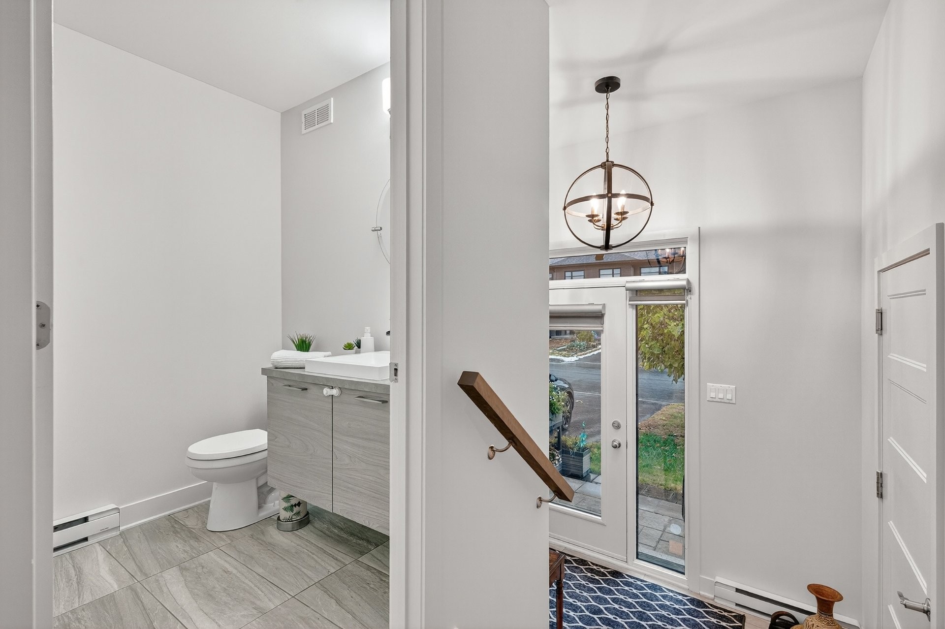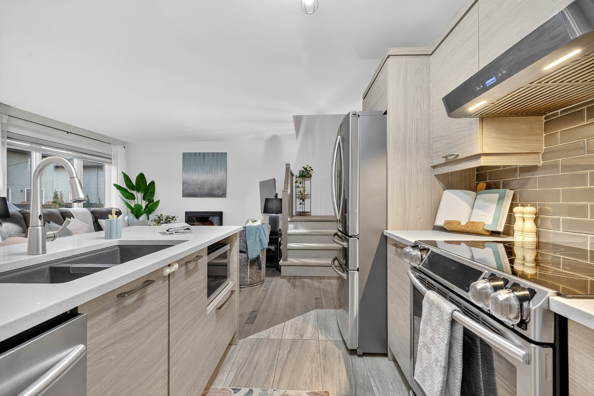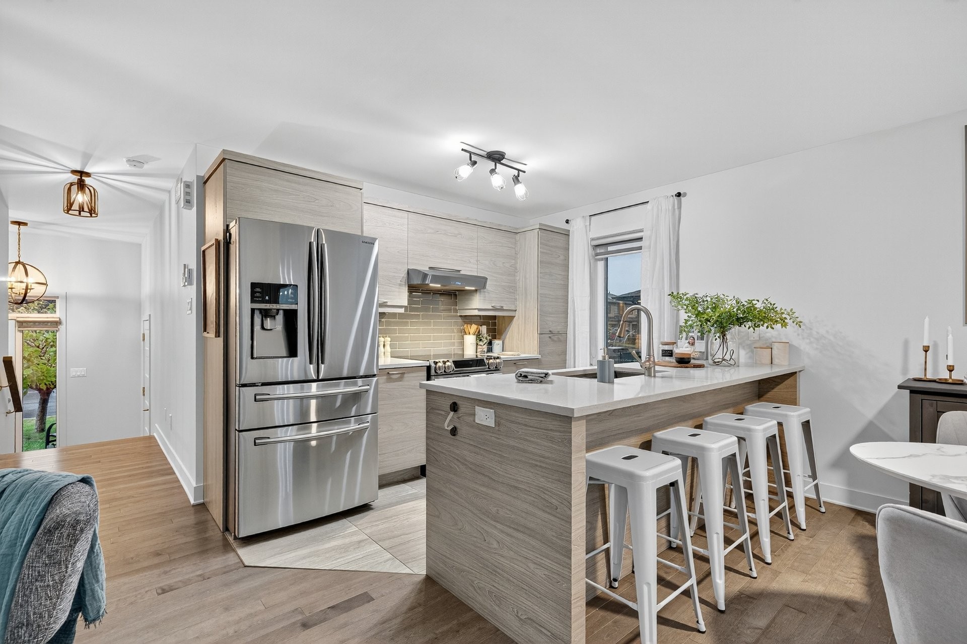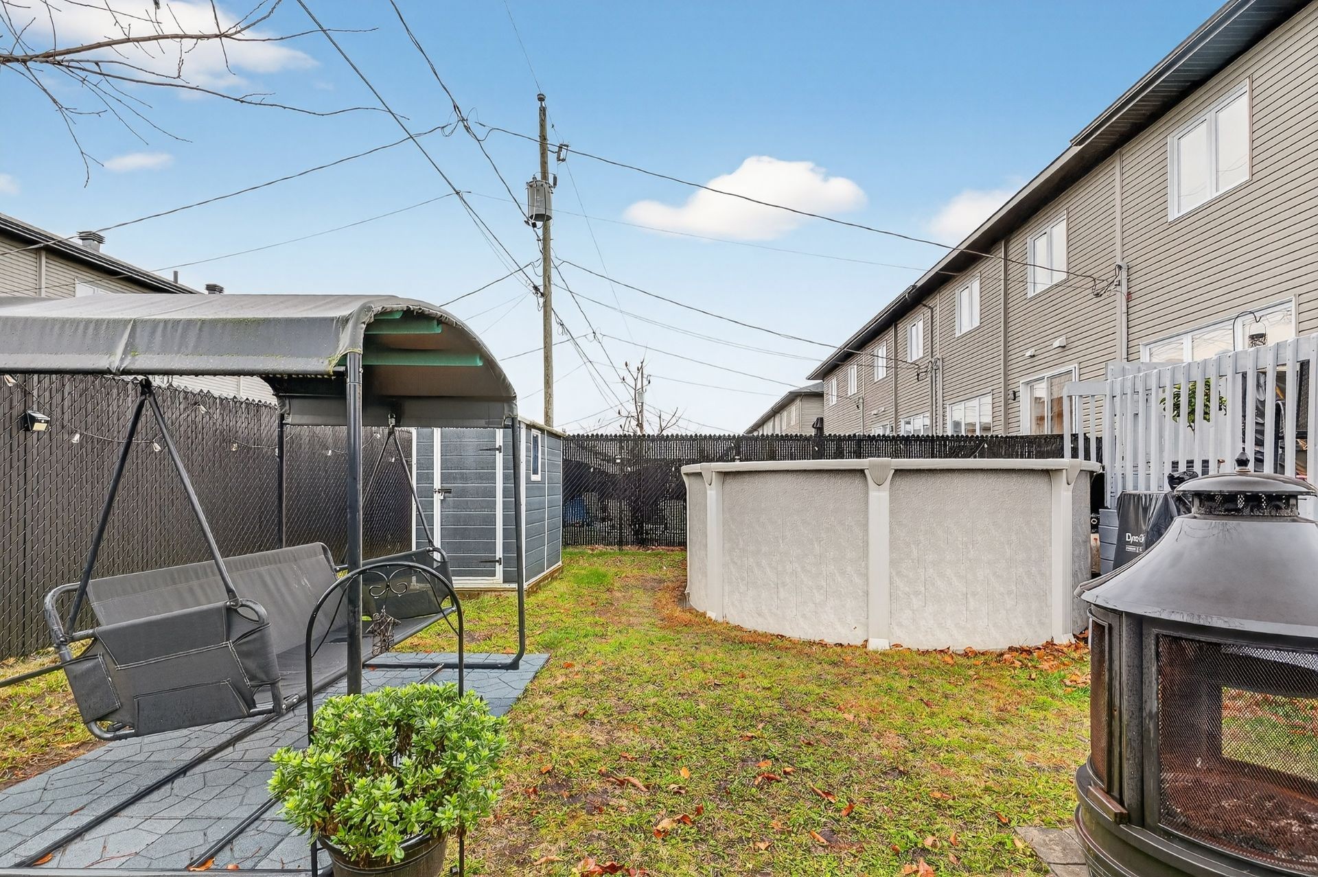 Spacious corner unit in Cité des Papillons on a private lot with a heated saltwater pool and direct gate to walking path. Modern open concept with granite island, two electric fireplaces, and garage access. Three large bedrooms upstairs with a stylish bath, separate laundry, and bright windows. The basement offers a sixteen-by-twenty-foot family room with storage. Updated lighting, window coverings, and finishes make this home turnkey. Prime location near highways, schools, daycares, and the new hospital--perfect for families or investors.