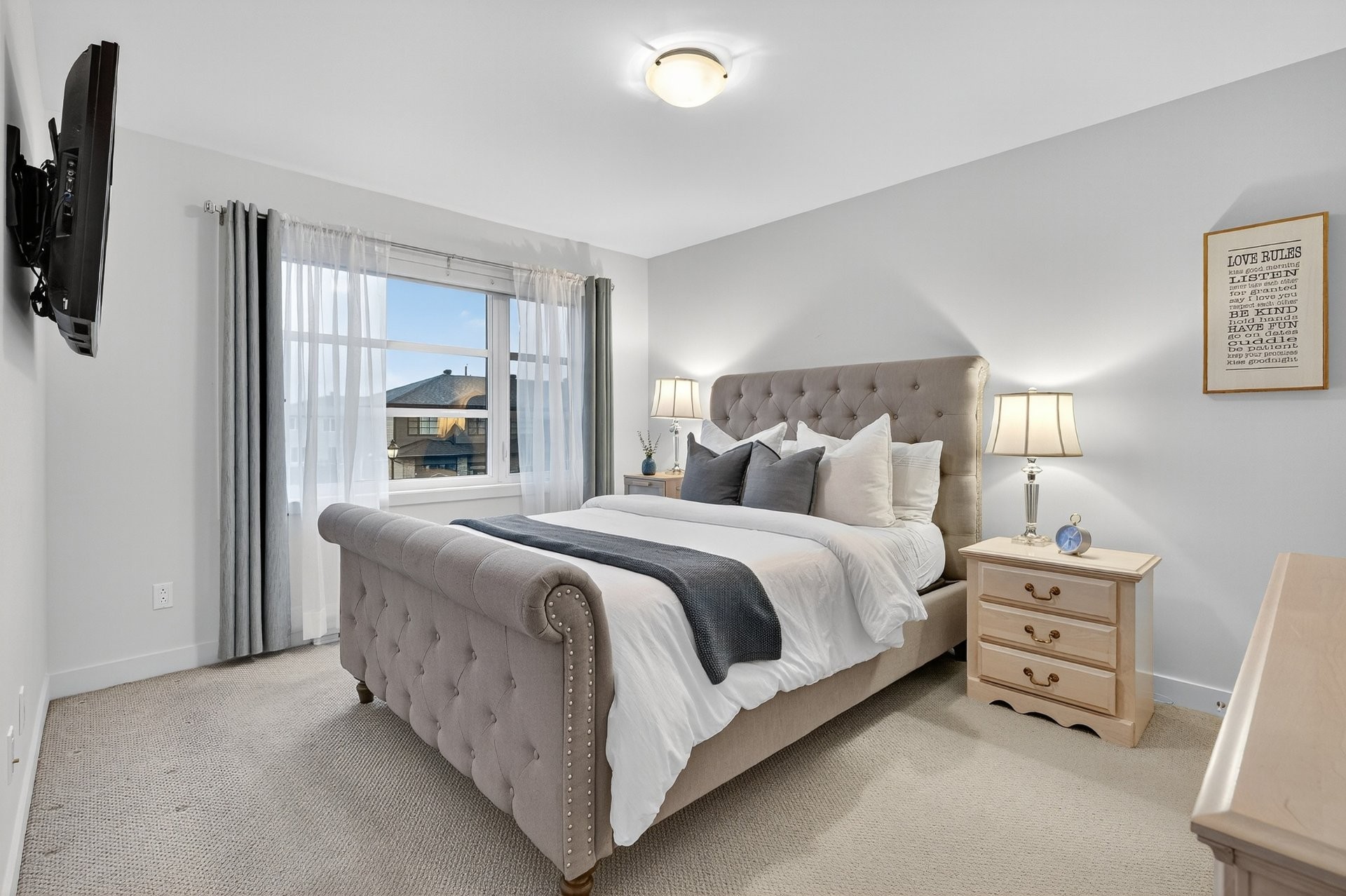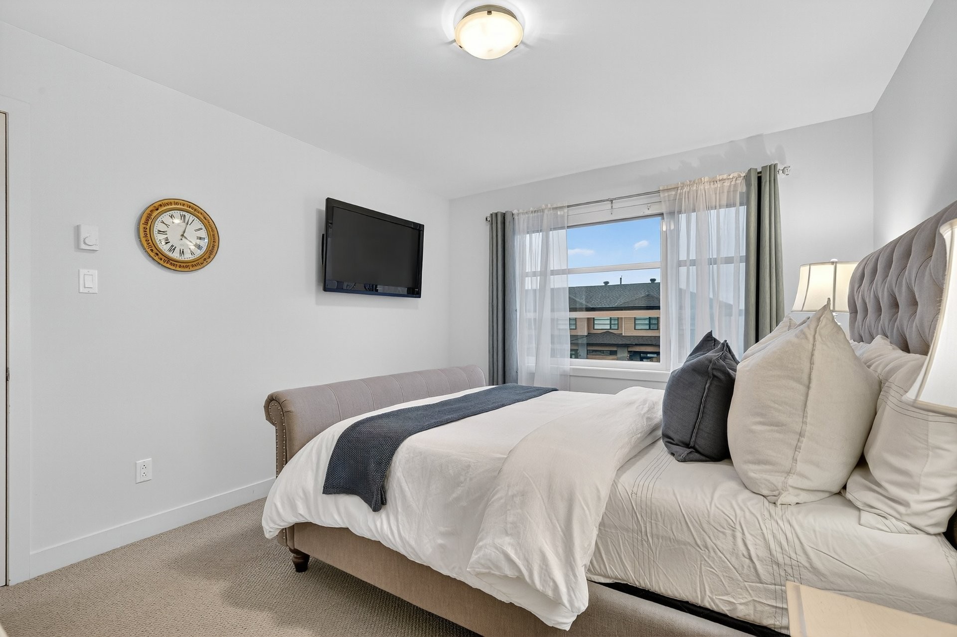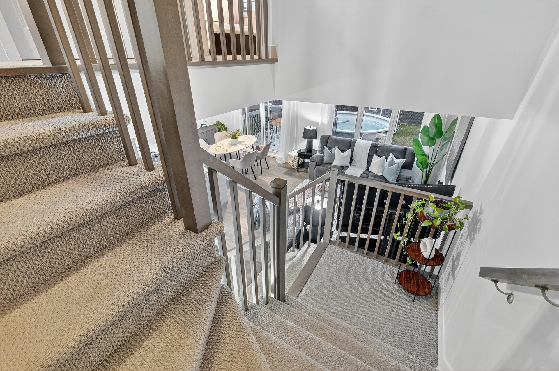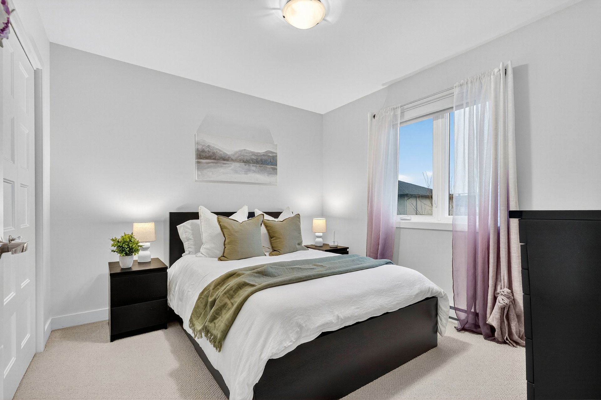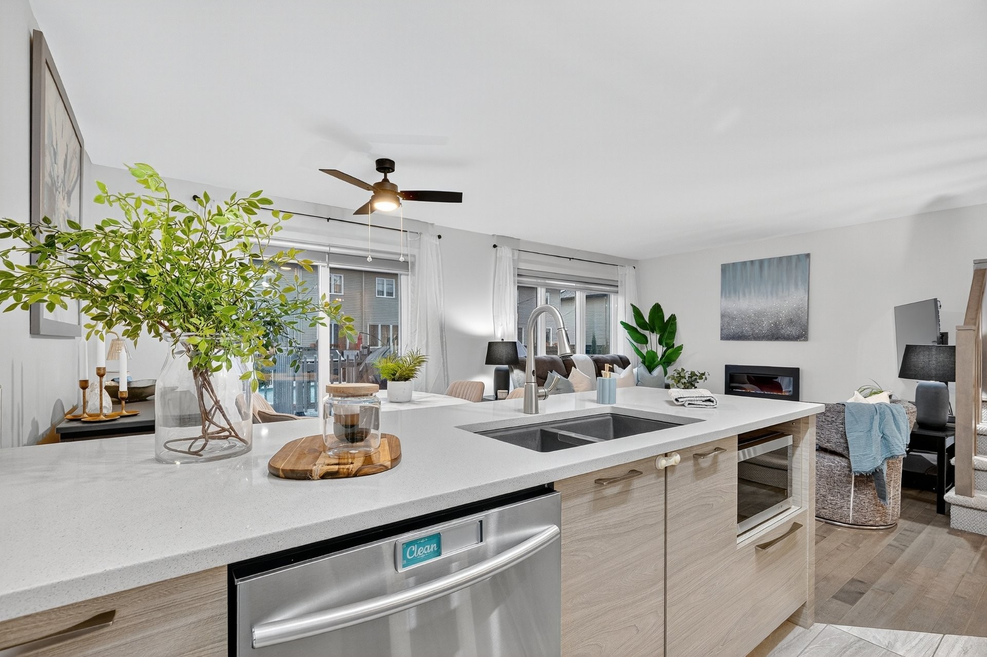 Inside, the main floor's open concept layout centers around a granite island and features a subway tile backsplash, a powder room, and direct access to the heated single garage equipped with a suspended storage shelf. The living area offers an inviting electric fireplace and large windows providing natural light throughout the day.