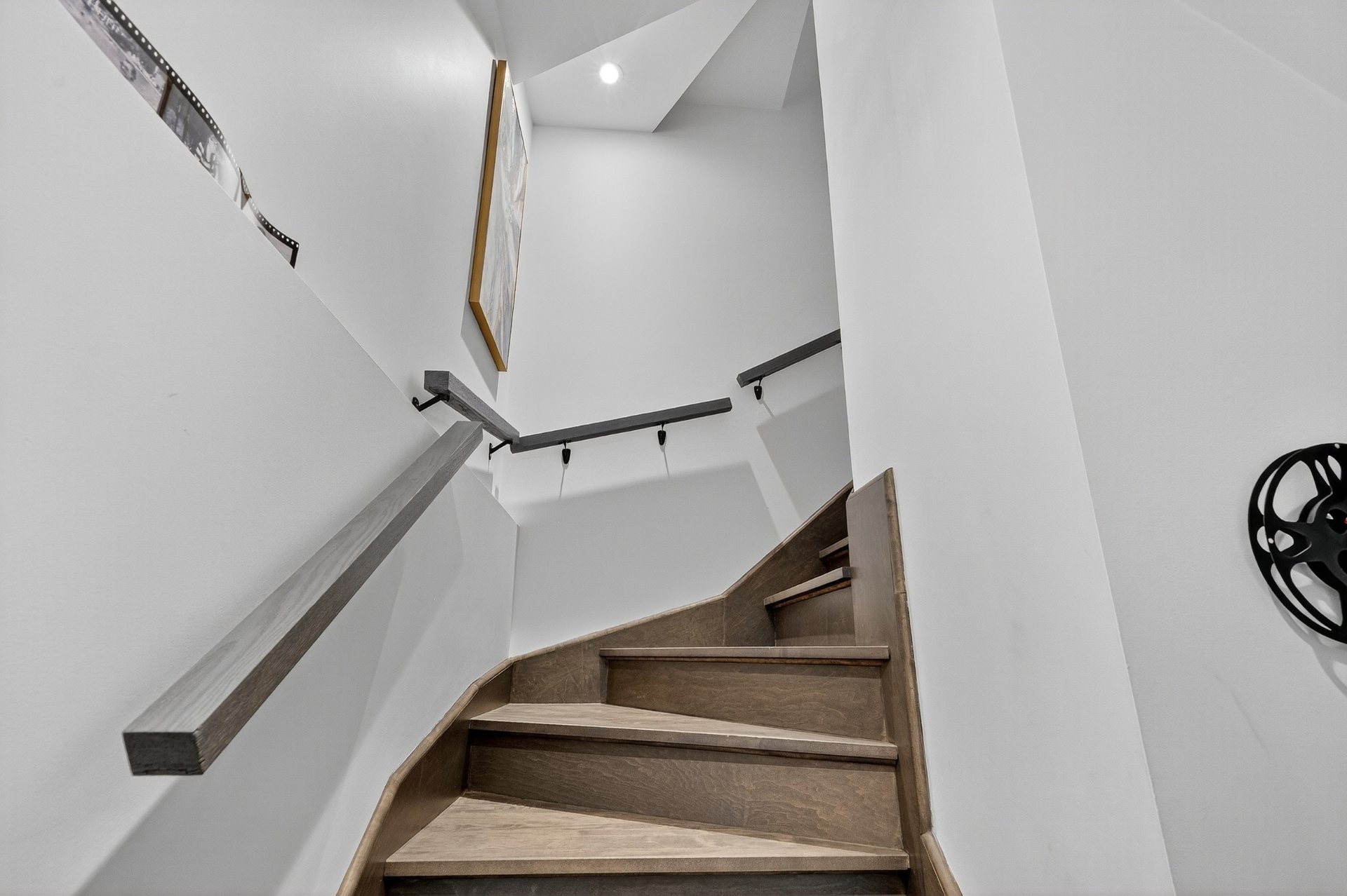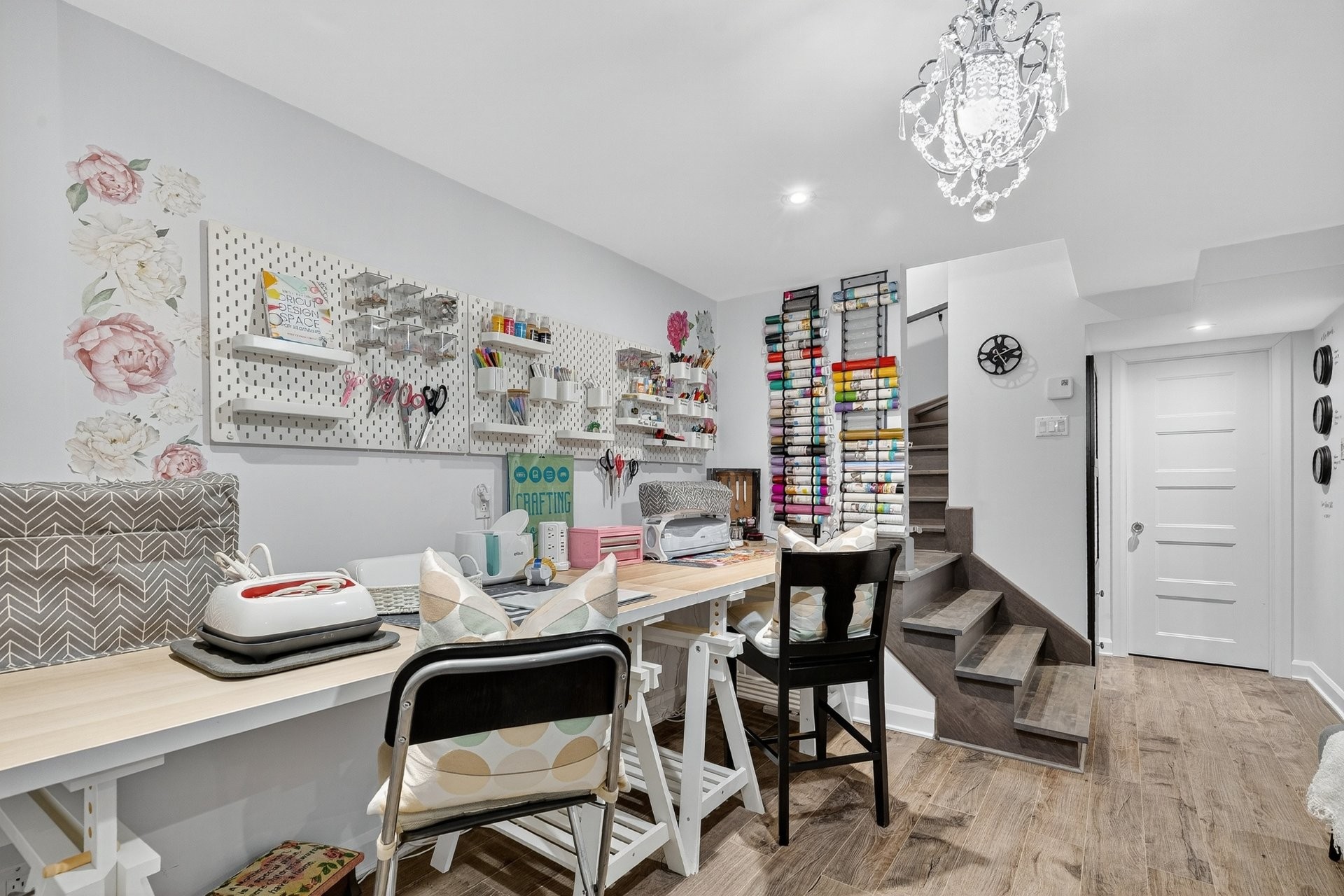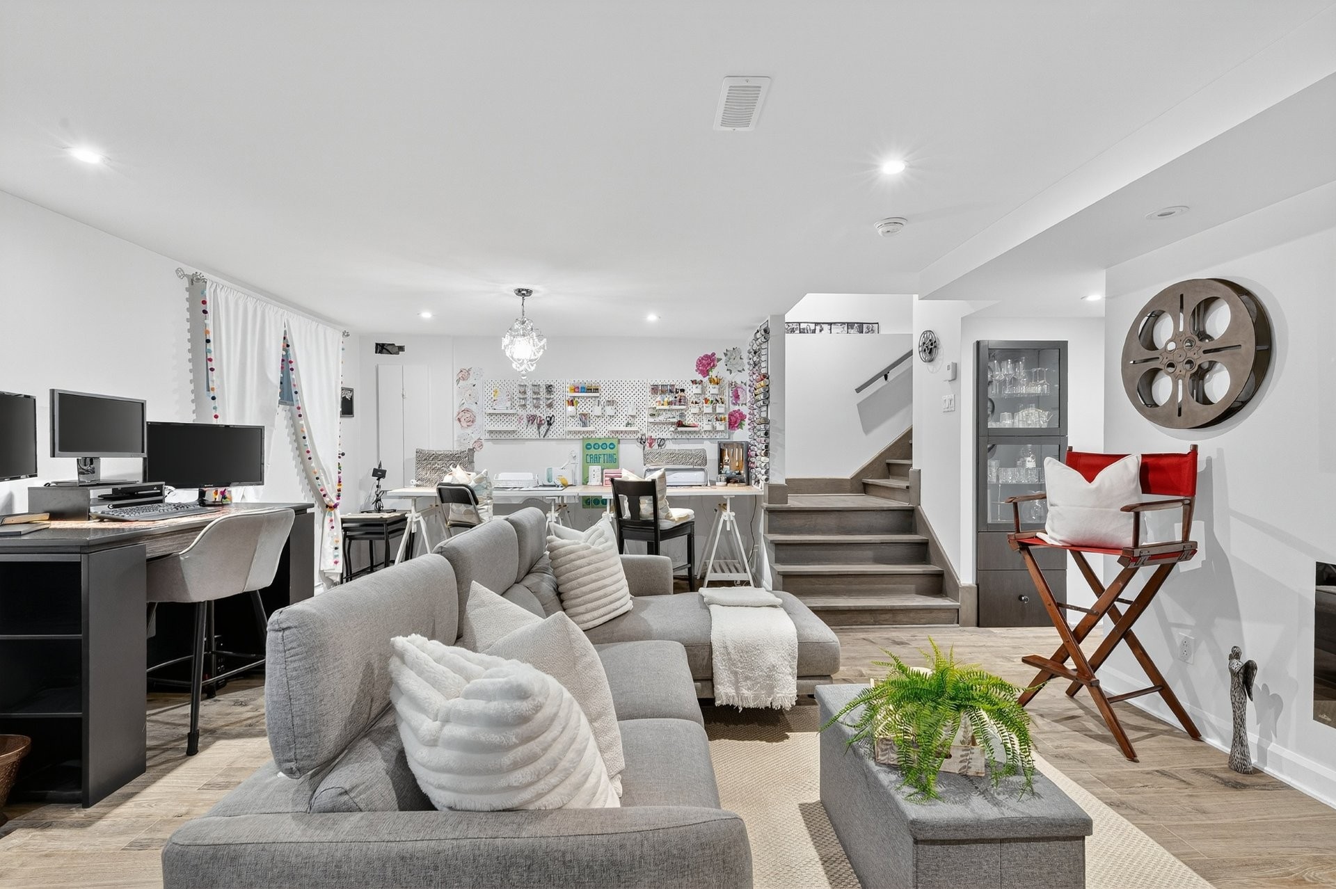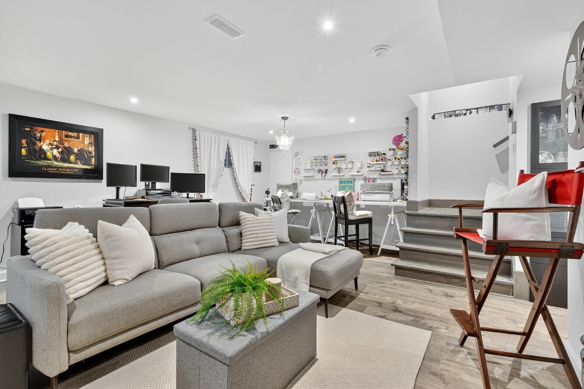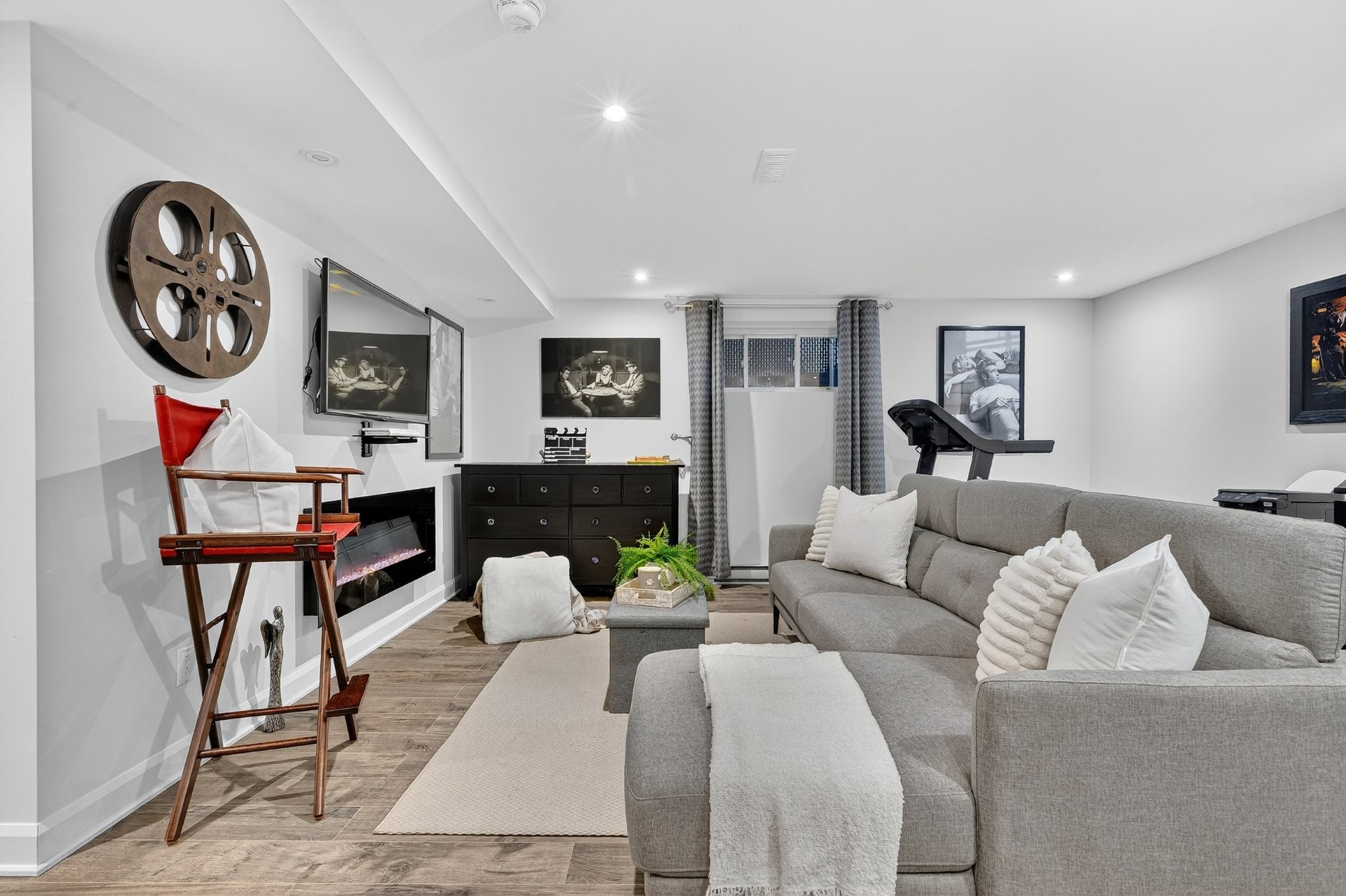 The basement was completed in 2022 to create a sixteen-by-twenty-foot family room with ample storage and a hardwired electric fireplace, perfect for relaxation or a home office setup.