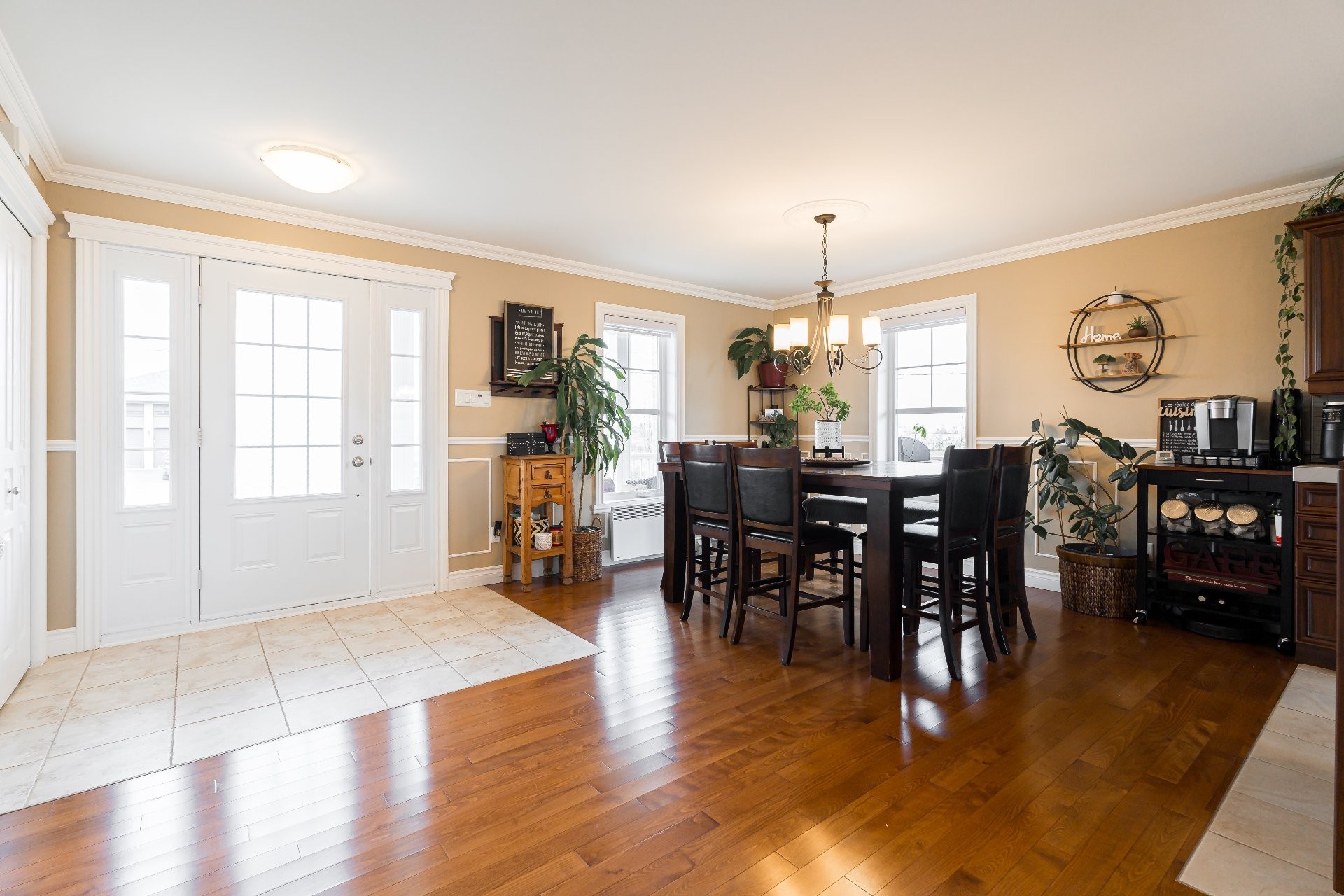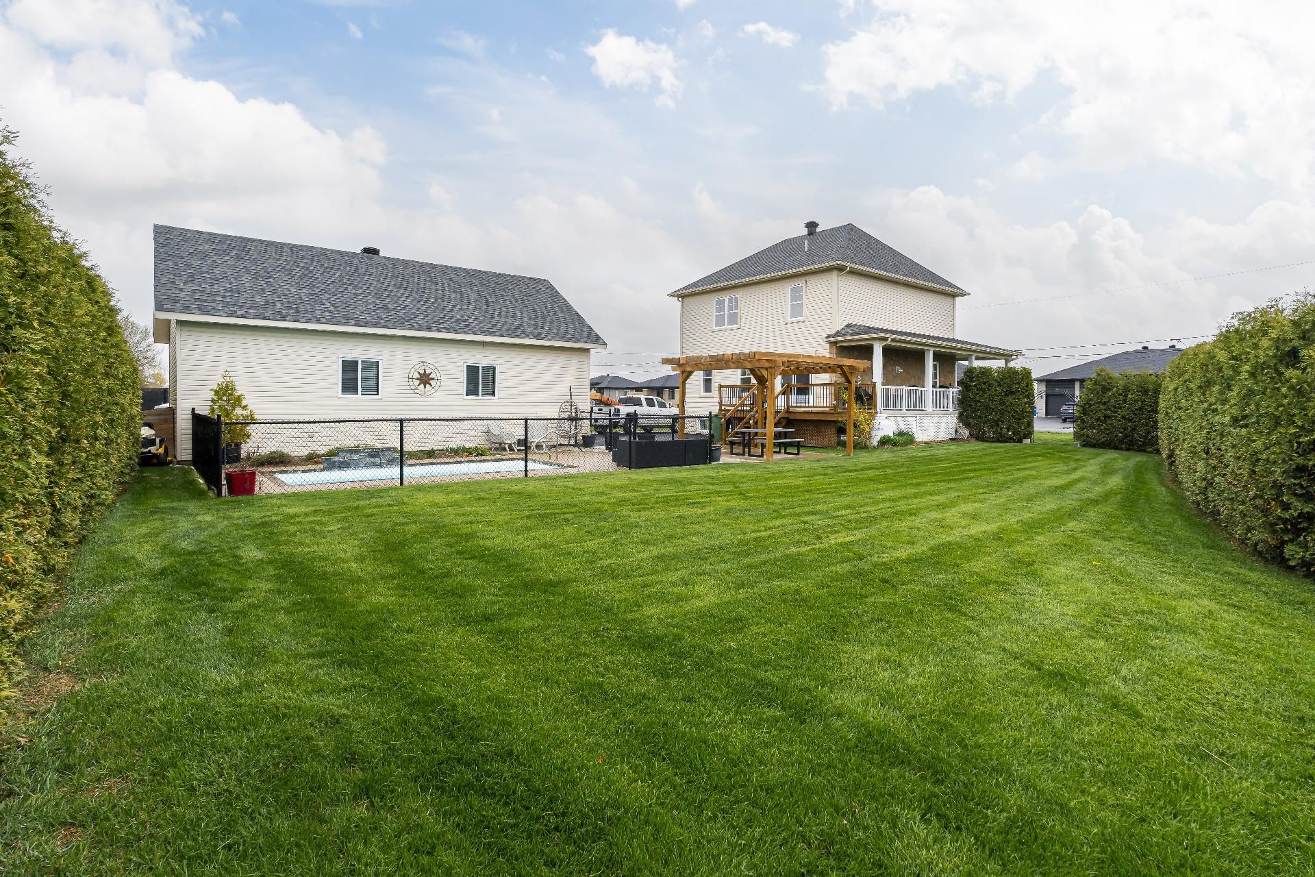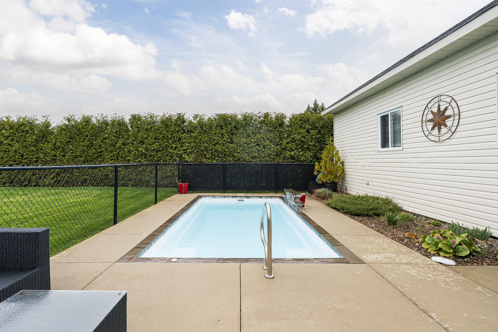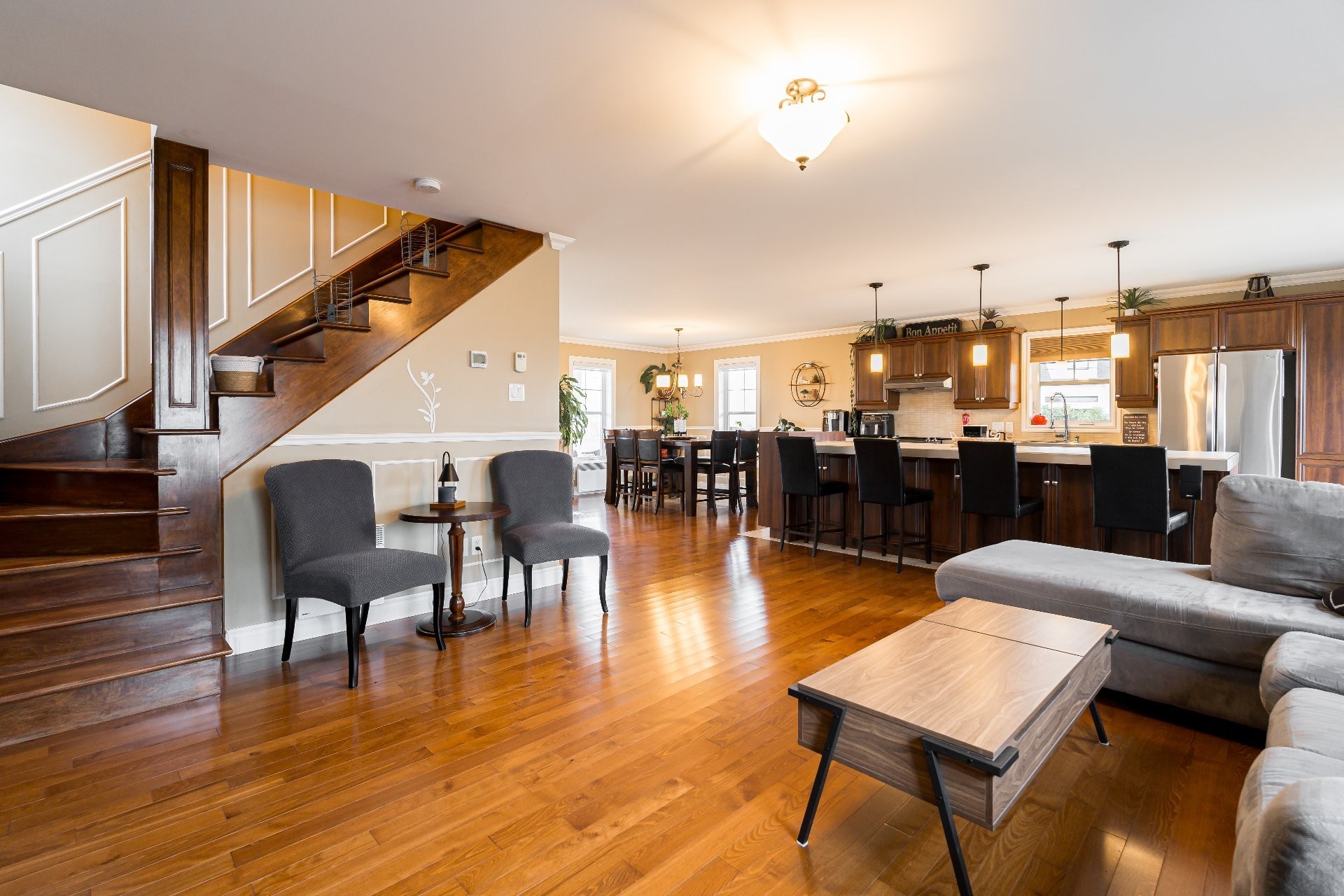 Welcome to 86 rue des Prés, a turnkey country-style home with a wrap-around porch and beautifully landscaped backyard. The central kitchen features a 10-ft island, perfect for gatherings. Upstairs are three bedrooms, including a main with walk-in and bathroom access. The basement offers a fourth bedroom, bathroom, and large family room. Enjoy a heated in-ground pool, pergola, and green space. The heated double garage has a second floor for extra storage, and the paved driveway fits six cars. A spacious, well-designed home offering comfort, space, and tranquility.