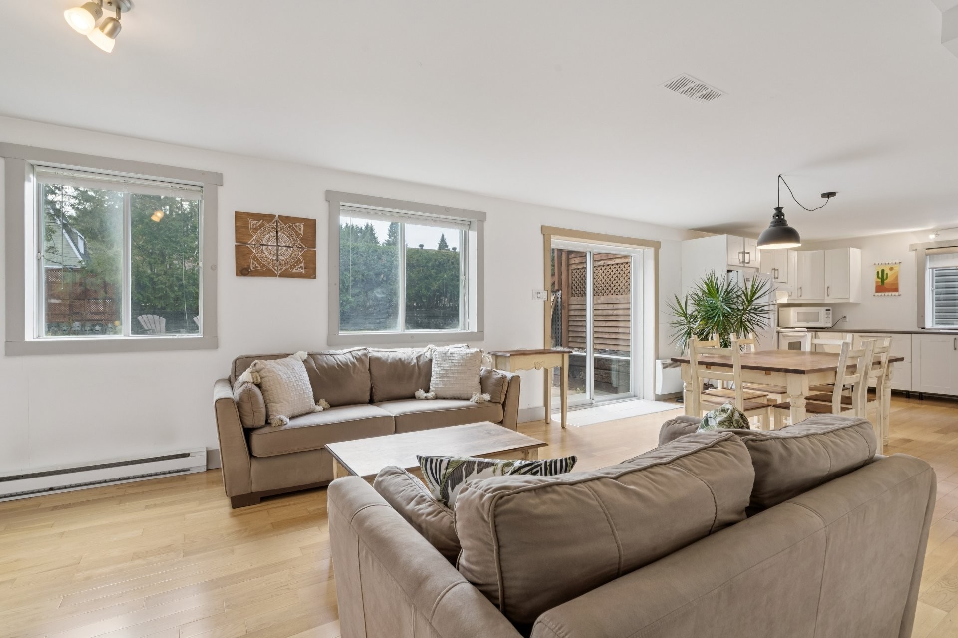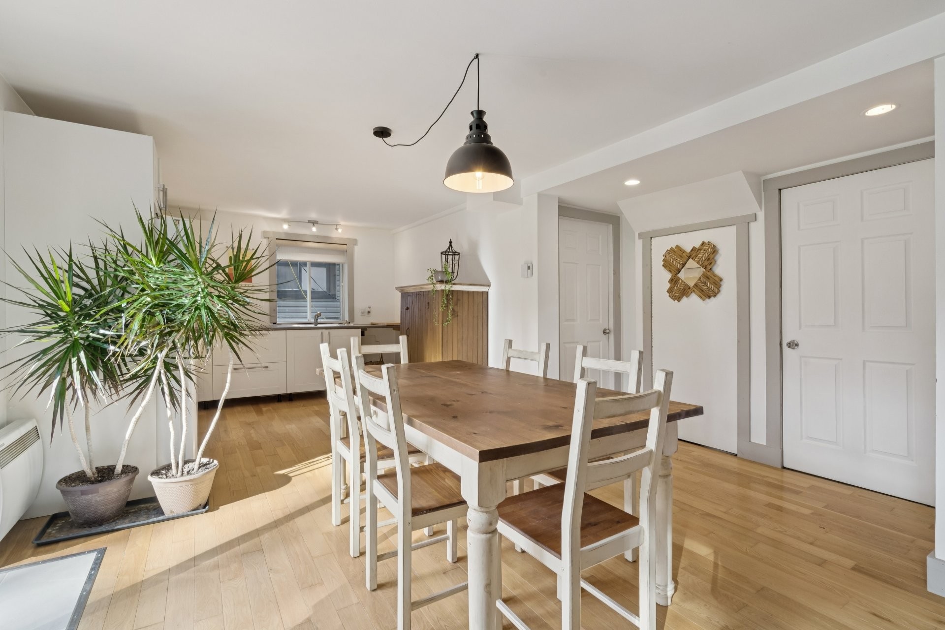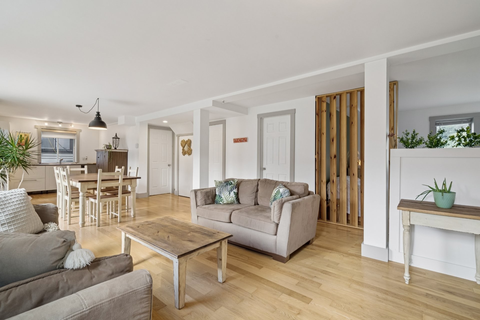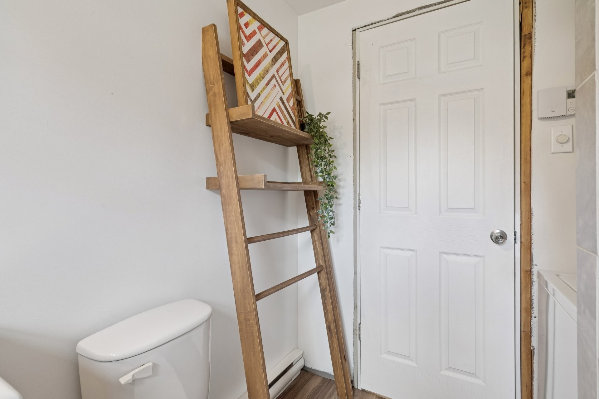 The upper unit offers a warm and bright living space. It features a charming living room with a wood-burning fireplace, ideal for après-ski evenings or cool autumn days, a dining room with a patio door providing access to the terrace and backyard, as well as a practical and inviting corner kitchen. Three well-sized bedrooms and a full bathroom with washer-dryer hookups complete this welcoming unit.