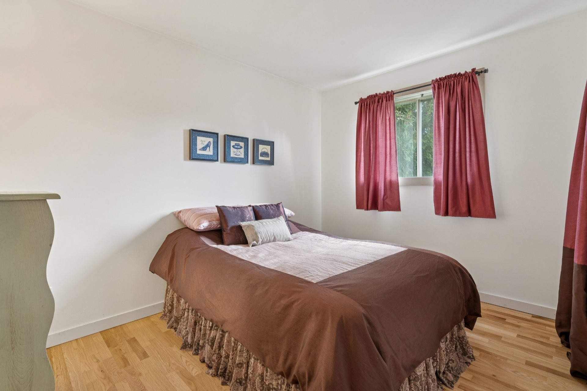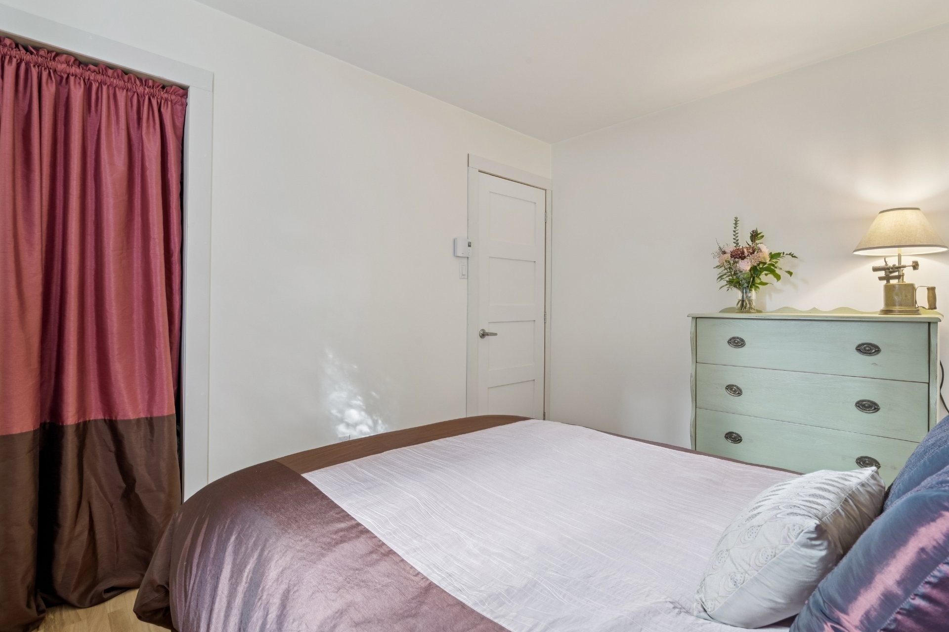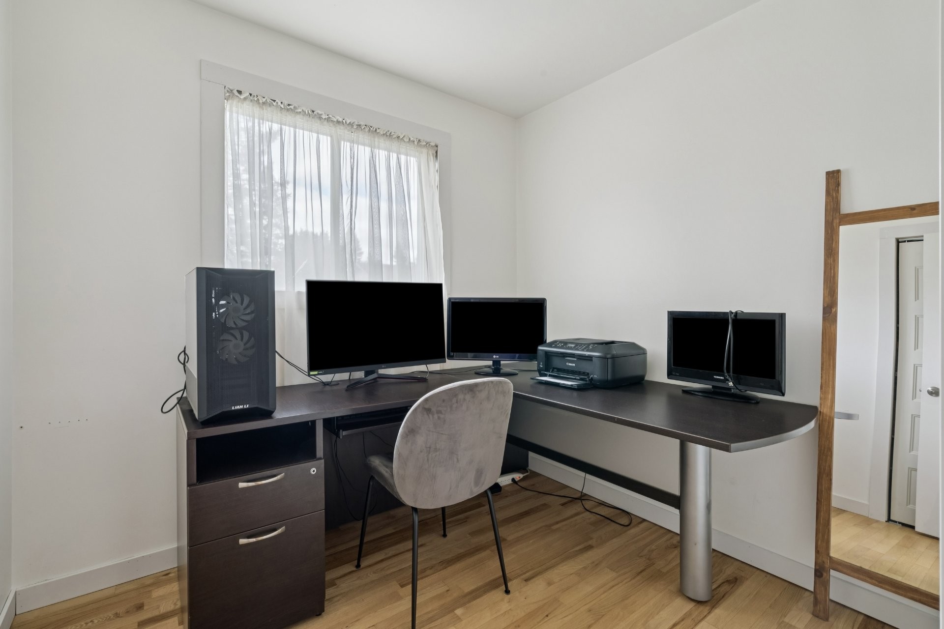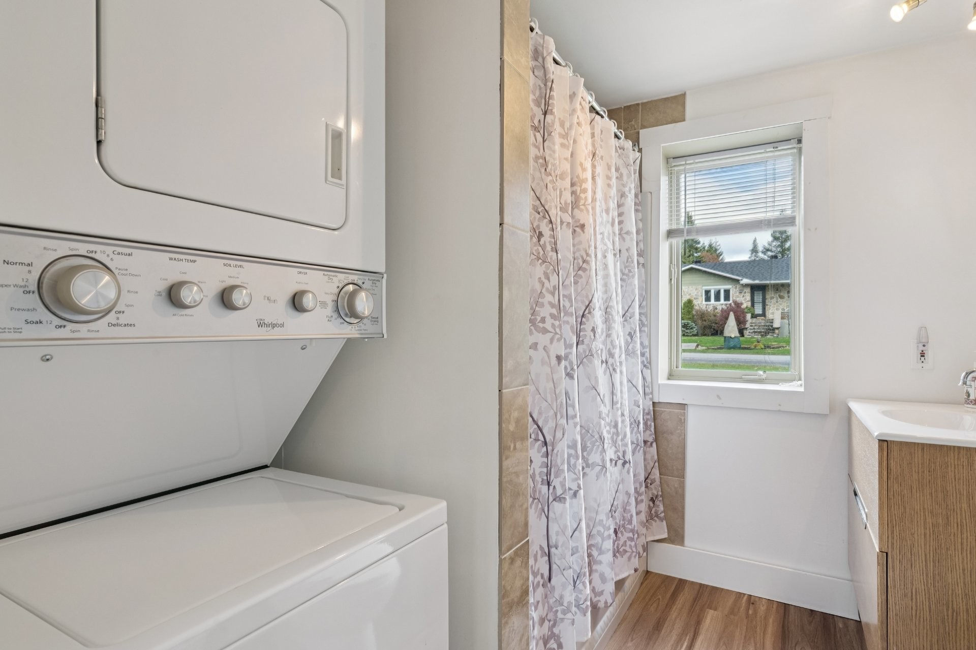 The upper unit offers a warm and bright living space. It features a charming living room with a wood-burning fireplace, ideal for après-ski evenings or cool autumn days, a dining room with a patio door providing access to the terrace and backyard, as well as a practical and inviting corner kitchen. Three well-sized bedrooms and a full bathroom with washer-dryer hookups complete this welcoming unit.
