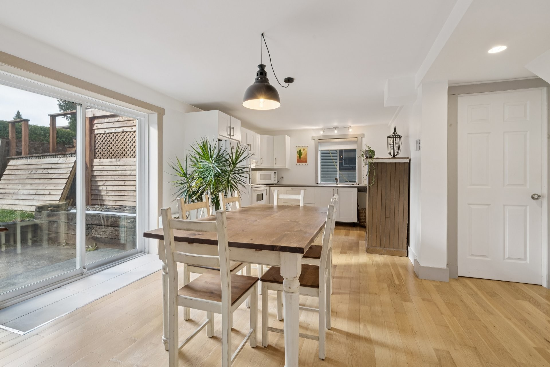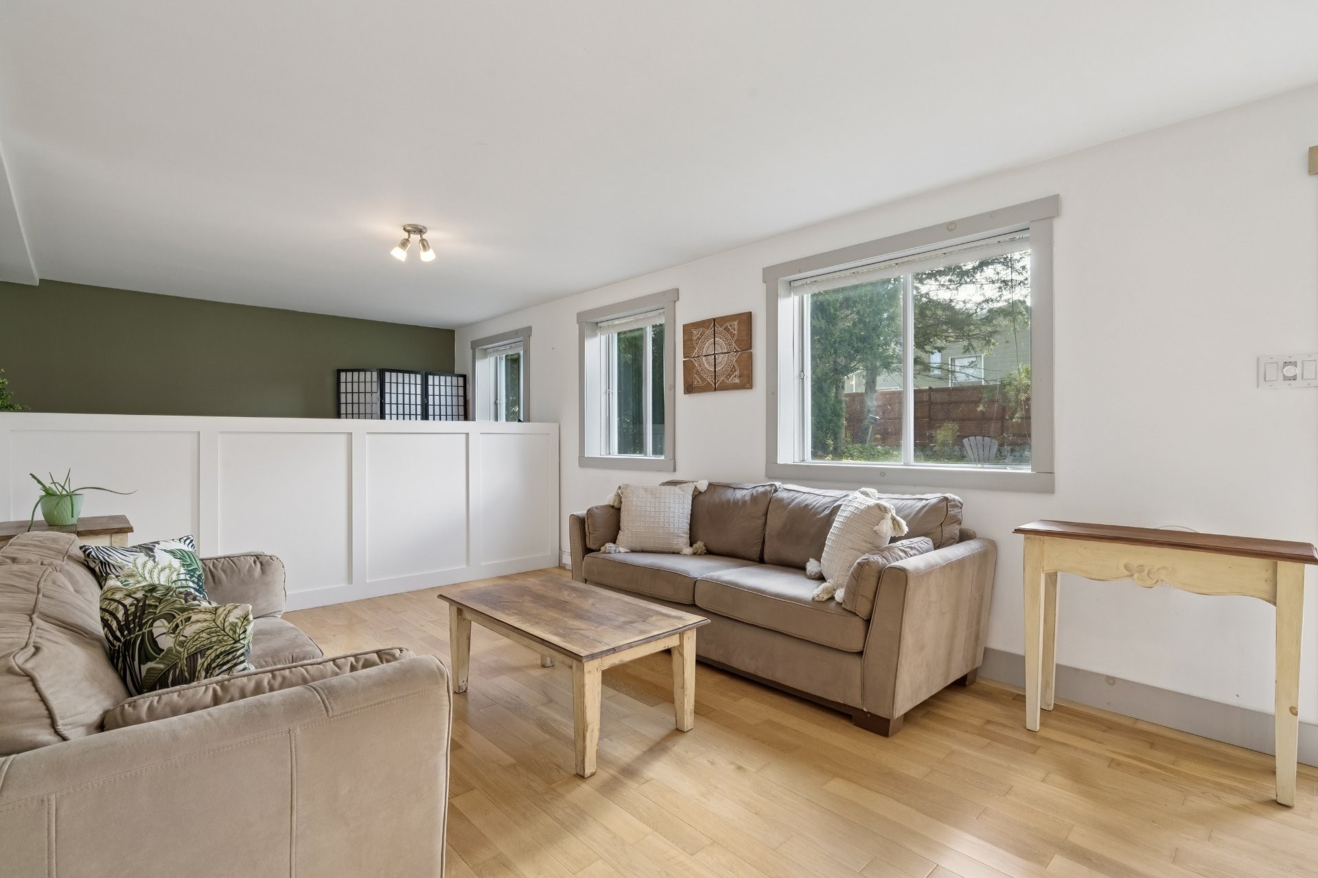 The lower unit, a garden-level layout, stands out for its abundant natural light and direct access to the backyard. Its open-concept design includes a living room, dining area, and kitchen, creating a practical and friendly environment. It also offers two bedrooms and a bathroom with washer-dryer hookups.